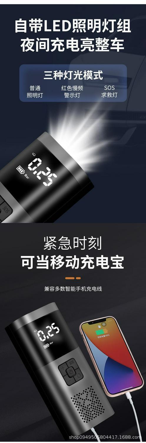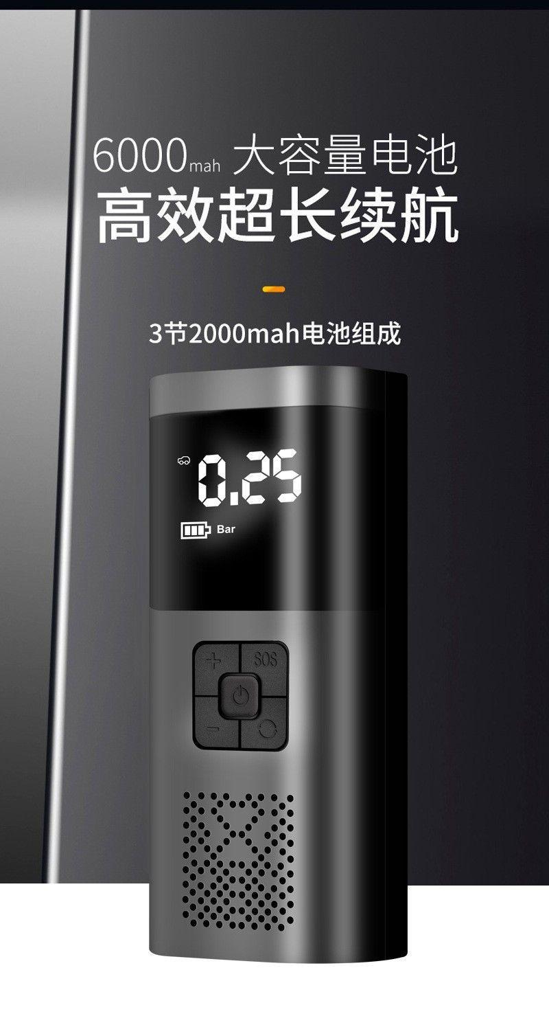 【Función】: Bomba de aire, iluminación, luz de advertencia SOS, banco de energía móvil