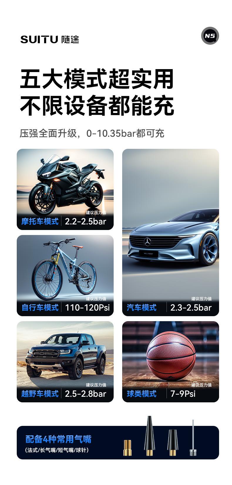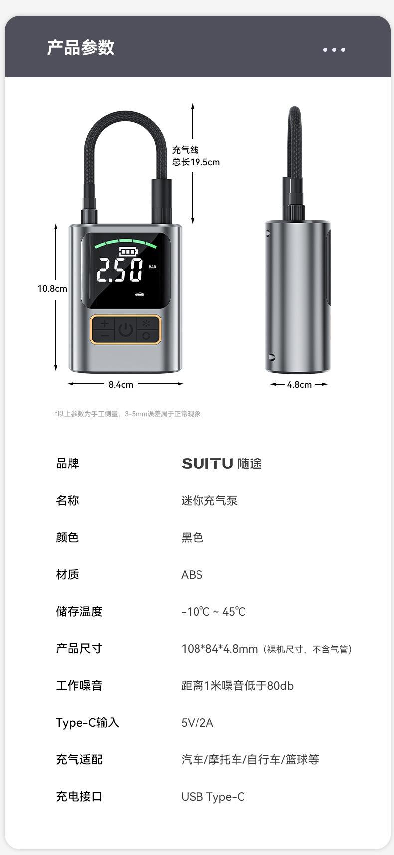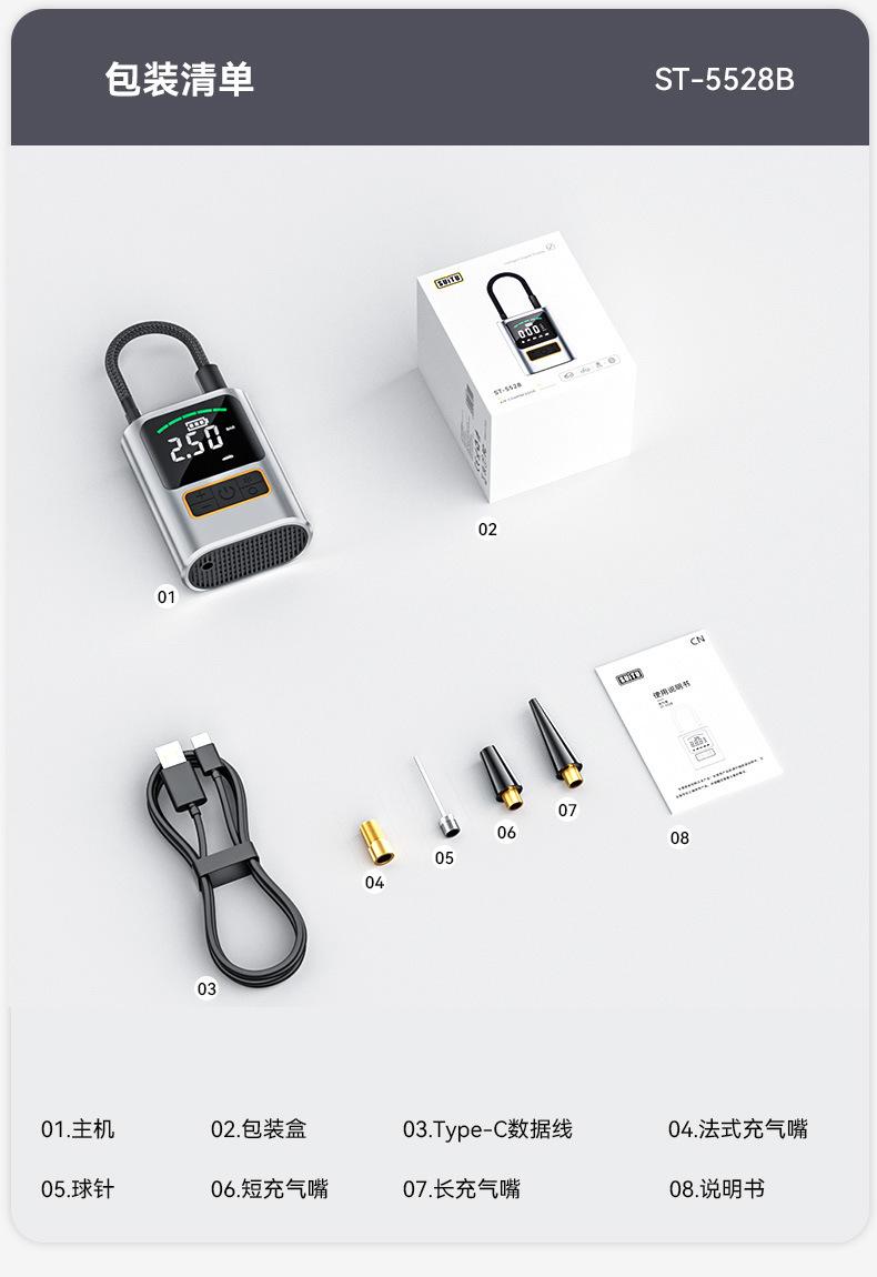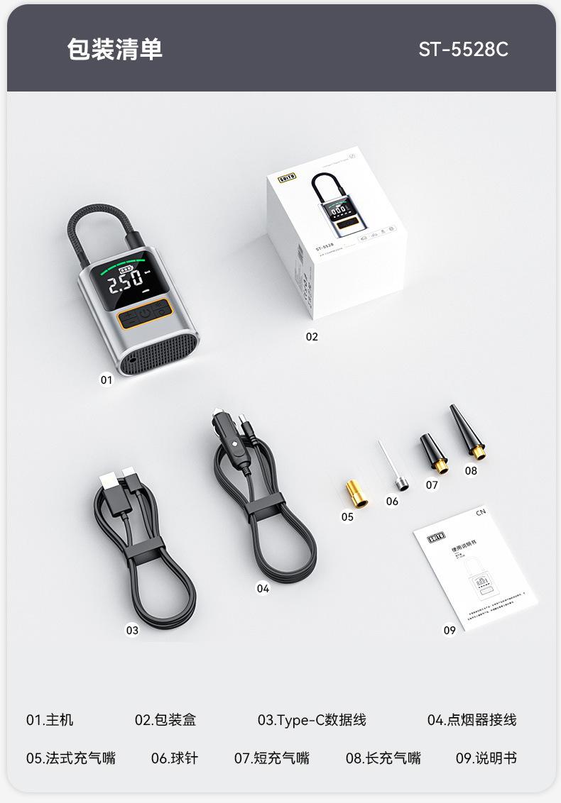 【ST-5528C】Host*1, manguera de inflado*1, juego de 4 boquillas de inflado, cable de carga Tipo-C, cable de carga para coche DC12V 3m*1, manual de instrucciones*1, caja de color*1
