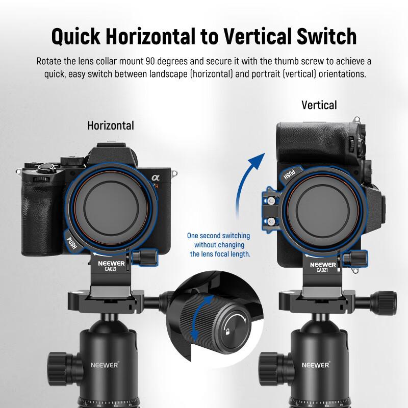 【Cambio Rápido de Horizontal a Vertical】Gire el soporte del collar del objetivo 90 grados y asegúrelo con el tornillo de pulgar para cambiar rápida y fácilmente entre las orientaciones horizontal y vertical sin ajustar objetivos pesados, ahorrando tiempo y esfuerzo en el reposicionamiento. Nota: Solo se admiten anillos adaptadores de objetivo con un diámetro inferior a 63 mm. Retire el soporte del adaptador de objetivo (si lo hay) antes de usar
