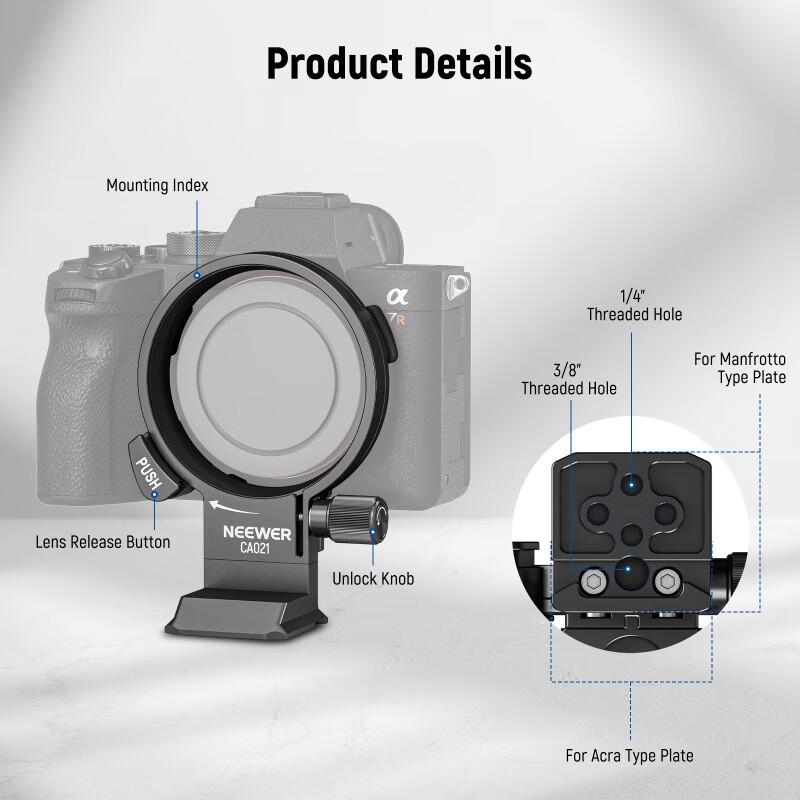 【Liberación de lente eficiente y segura】 Simplemente presione para quitar el teleobjetivo más largo, minimizando el riesgo de caídas accidentales. Esta característica es especialmente útil al cambiar entre diferentes lentes durante la toma, asegurando un flujo de trabajo suave y eficiente.