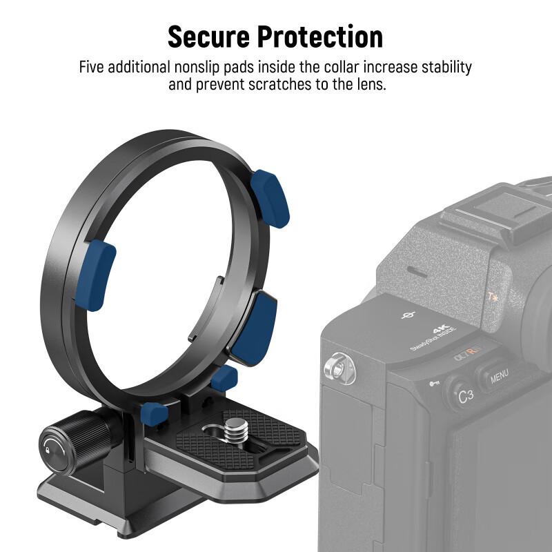 【Bloqueo de seguridad anti-torsión】El avanzado sistema de bloqueo puede sujetar firmemente su cámara sin espejo Sony Alpha con un tornillo de 1/4" anti-torsión con un pasador de localización y una almohadilla de goma con patrón cruzado en la placa de montaje. Hay cinco almohadillas antideslizantes adicionales dentro del collar para aumentar la estabilidad y evitar arañazos en el objetivo. Se incluyen dos llaves hexagonales en forma de L para apretar la cámara sin herramientas adicionales.