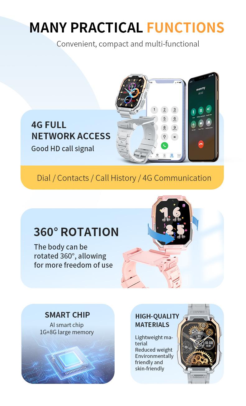 Reloj inteligente 4G Netcom para niños, con tarjeta insertable, posicionamiento de llamadas, multifunción, venta directa de fábrica.