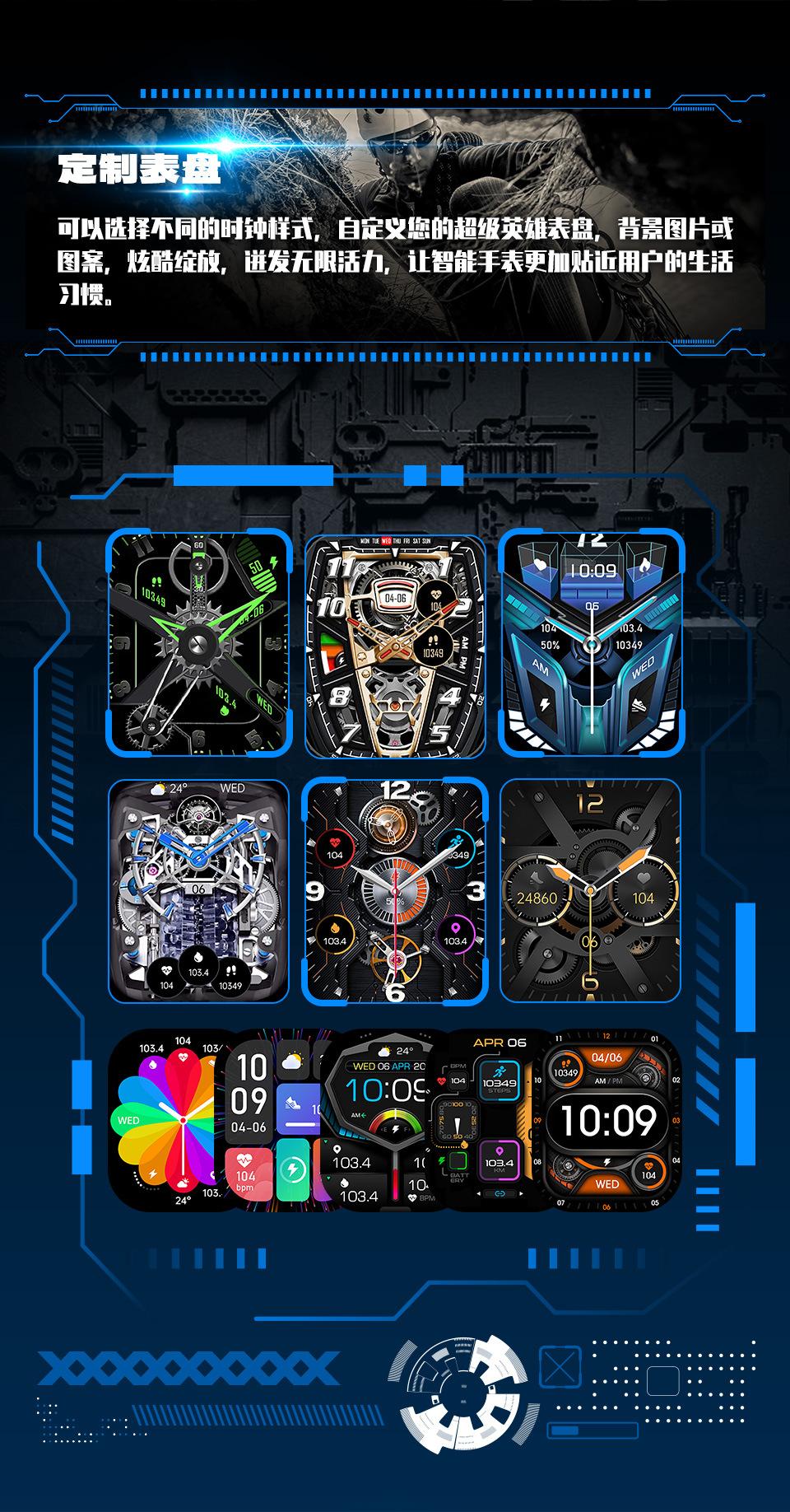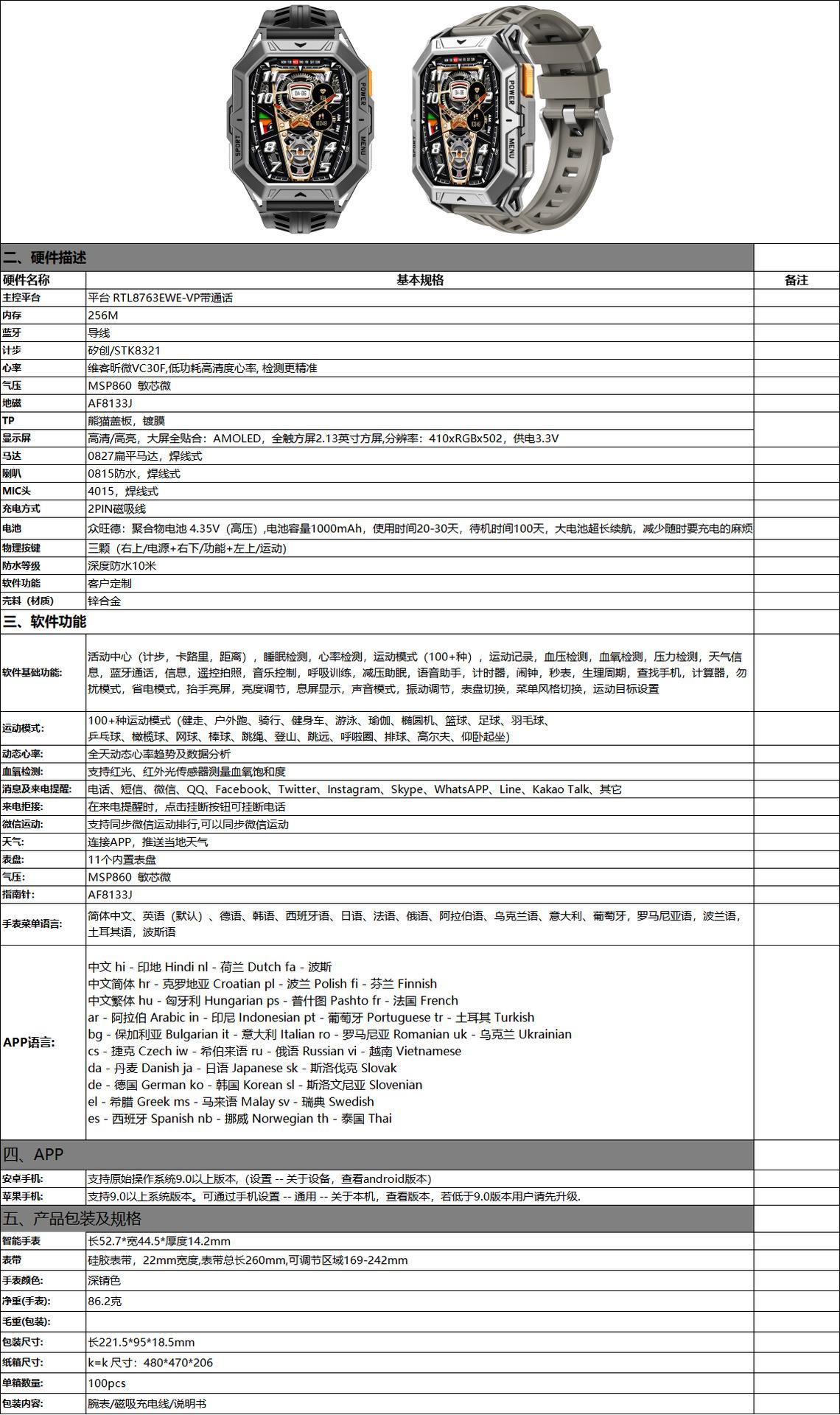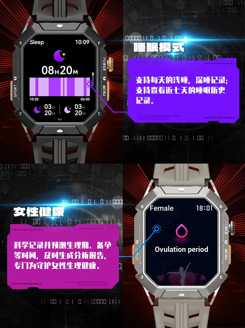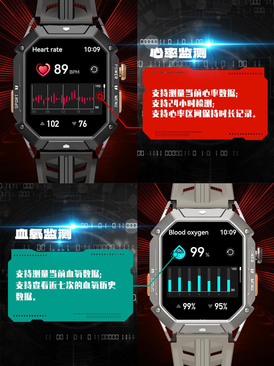 Blood pressure measurement, Social entertainment, Smart reminder, Remote control selfie, Sleep monitoring, Blood oxygen detection