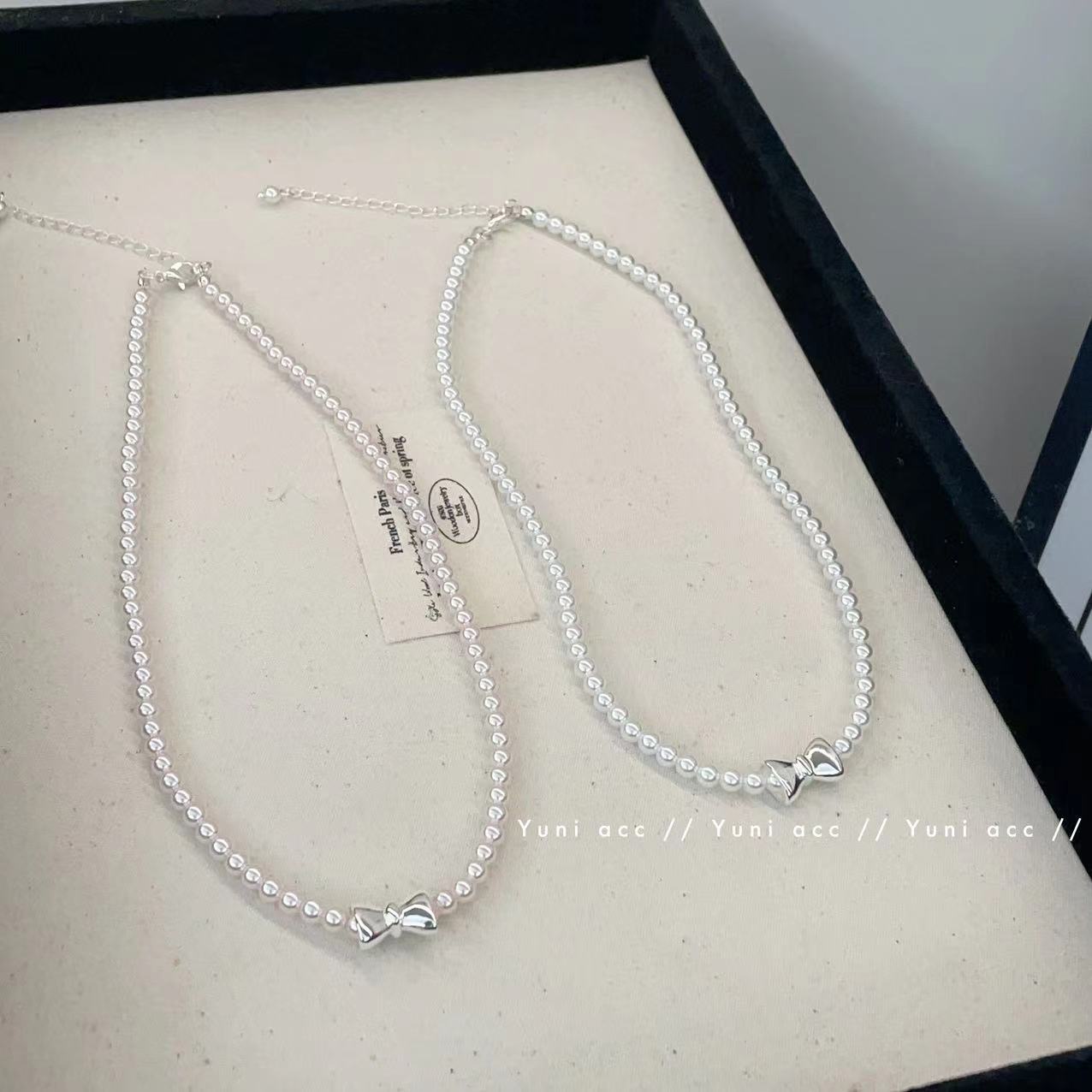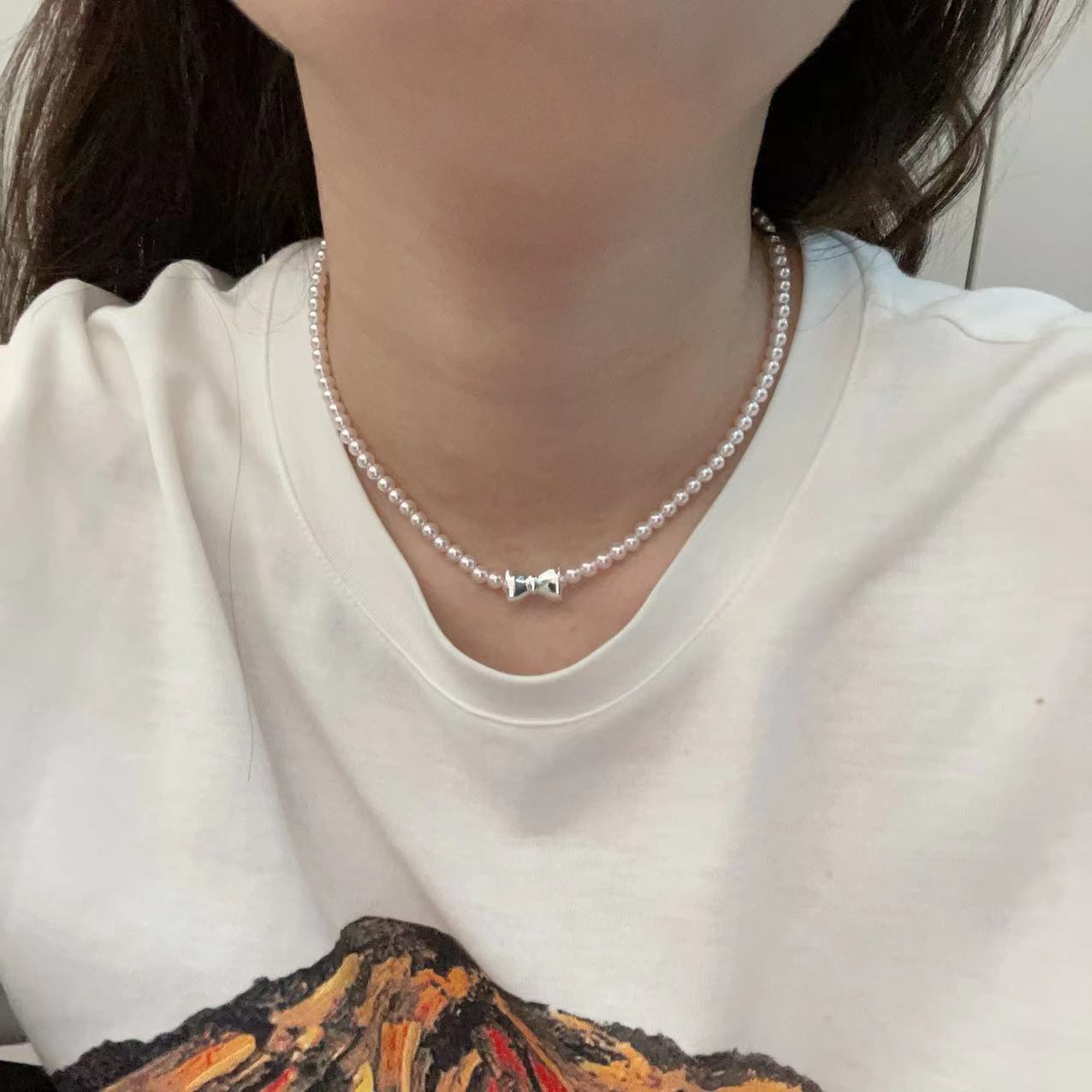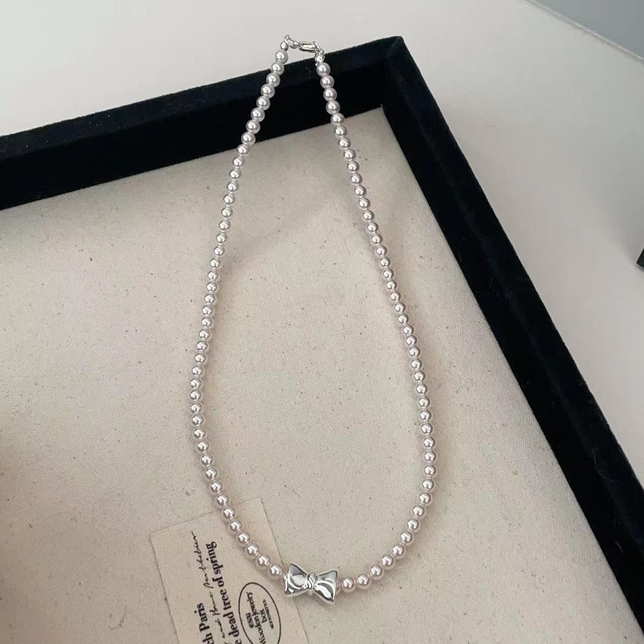 Collar de perlas con lazo estilo Chanel, cadena de clavícula con lazo de perlas de lujo ligero, collar de perlas elegante de alta calidad