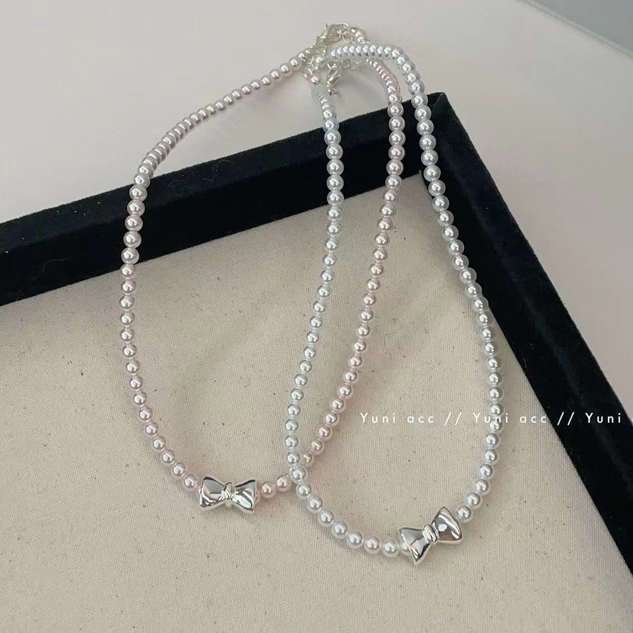 Pink pearl bow tie necklace, White pearl bow tie bracelet, Pink pearl bow tie bracelet