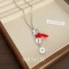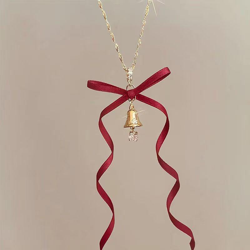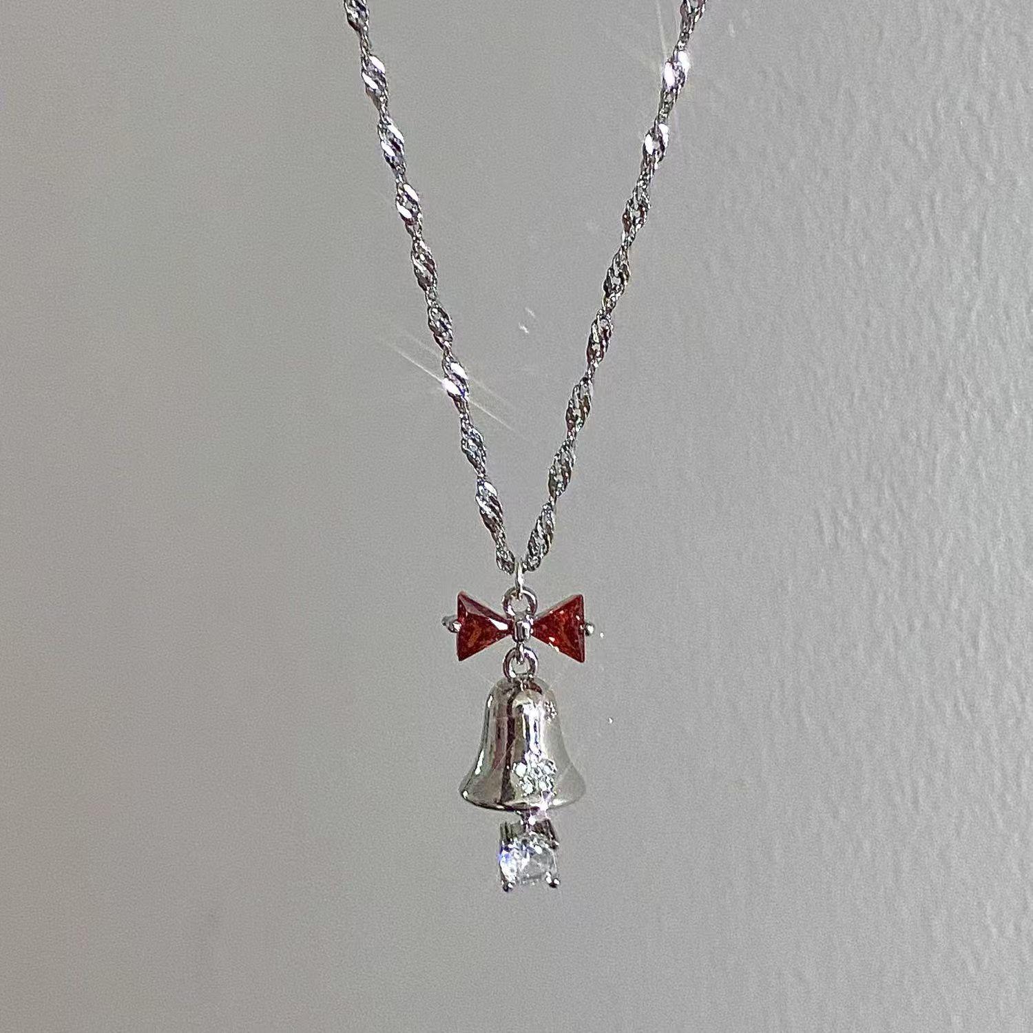 Red ribbon silver bell necklace, Red ribbon gold bell necklace, Christmas bell red zirconium necklace, Christm...