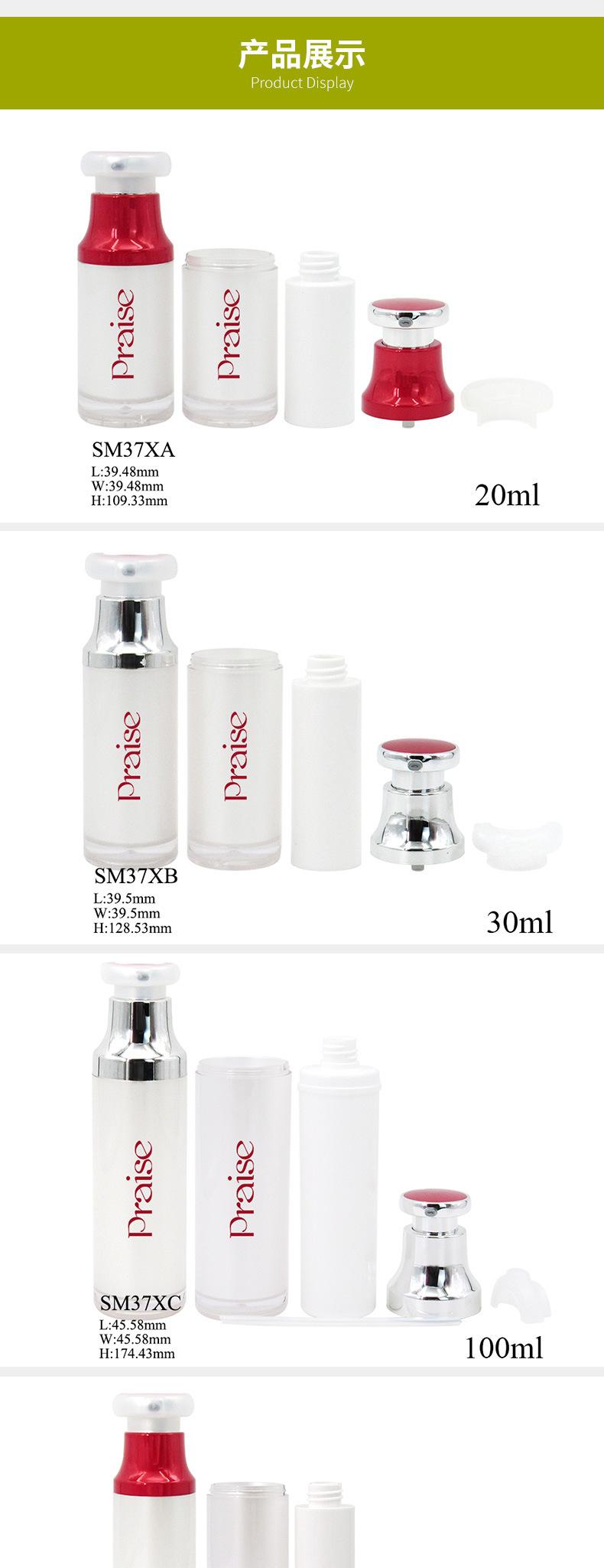 Botella de loción de plástico blanco perla de 20 ml, 30 ml y 100 ml, redonda, de doble pared, tipo prensa, para el cuidado de la piel. Material de embalaje.