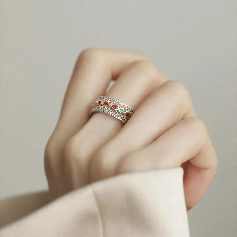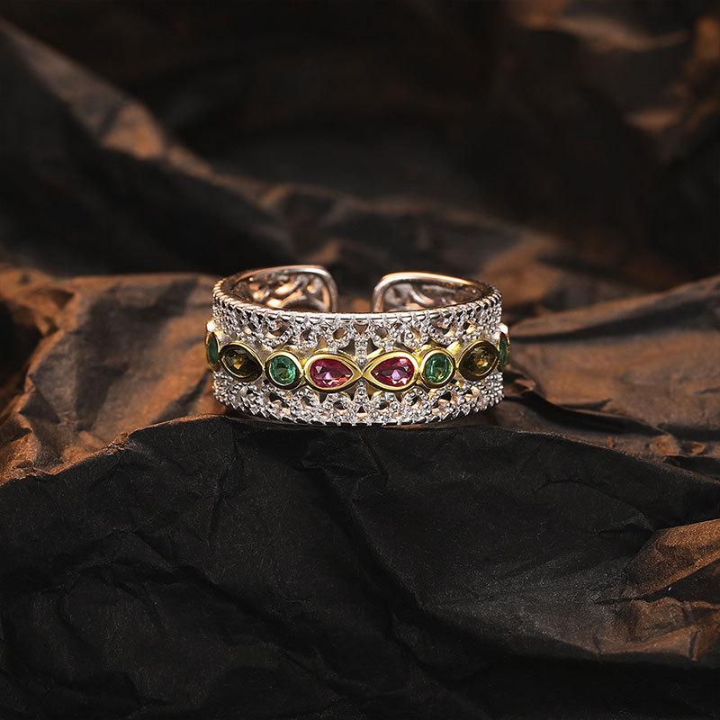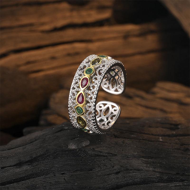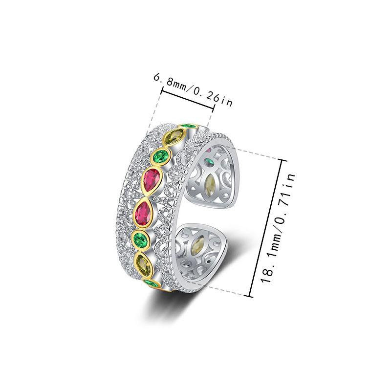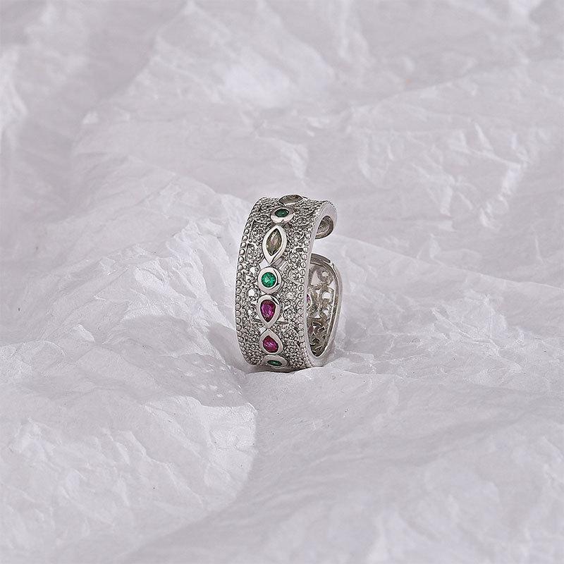 Anillo de apertura de circonio con encaje de color estilo corte retro de gran venta transfronteriza, diseño de nicho, anillo hueco simple de alta calidad
