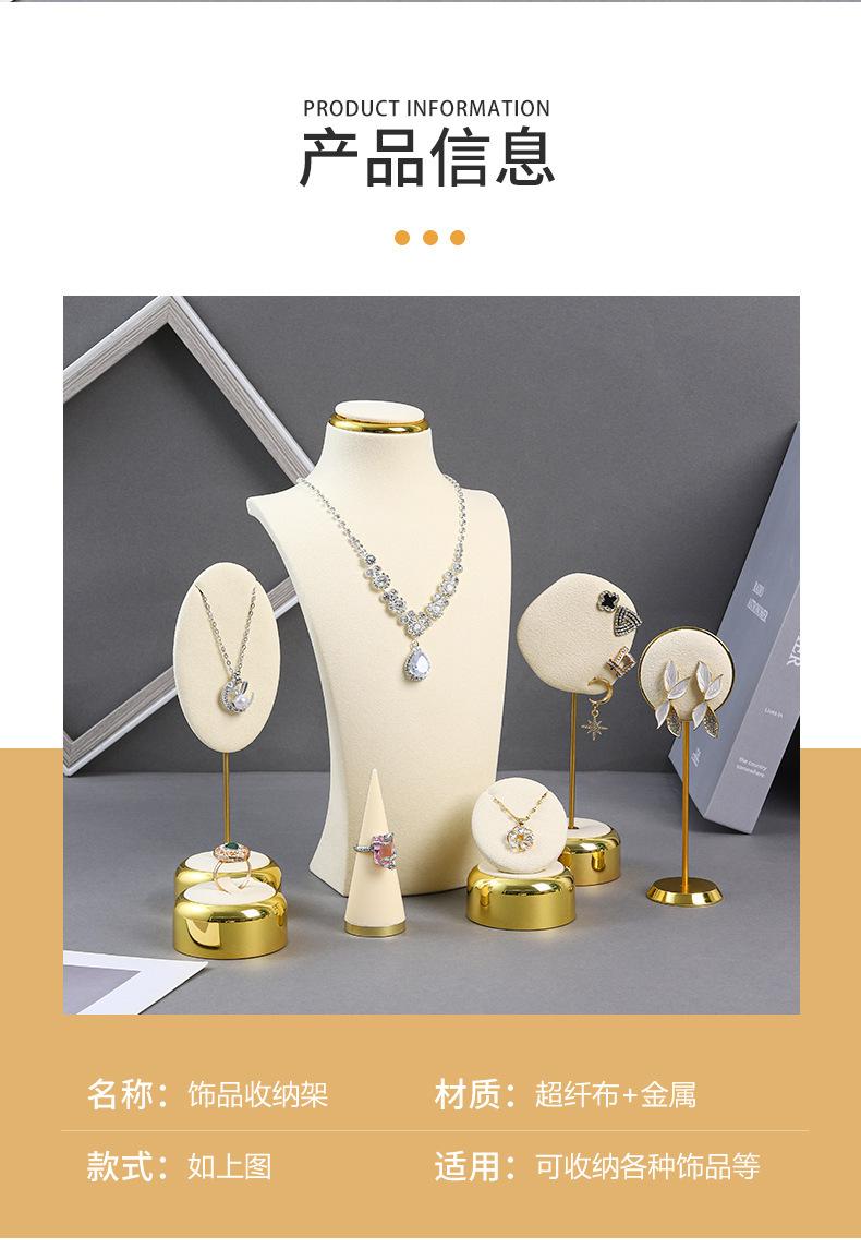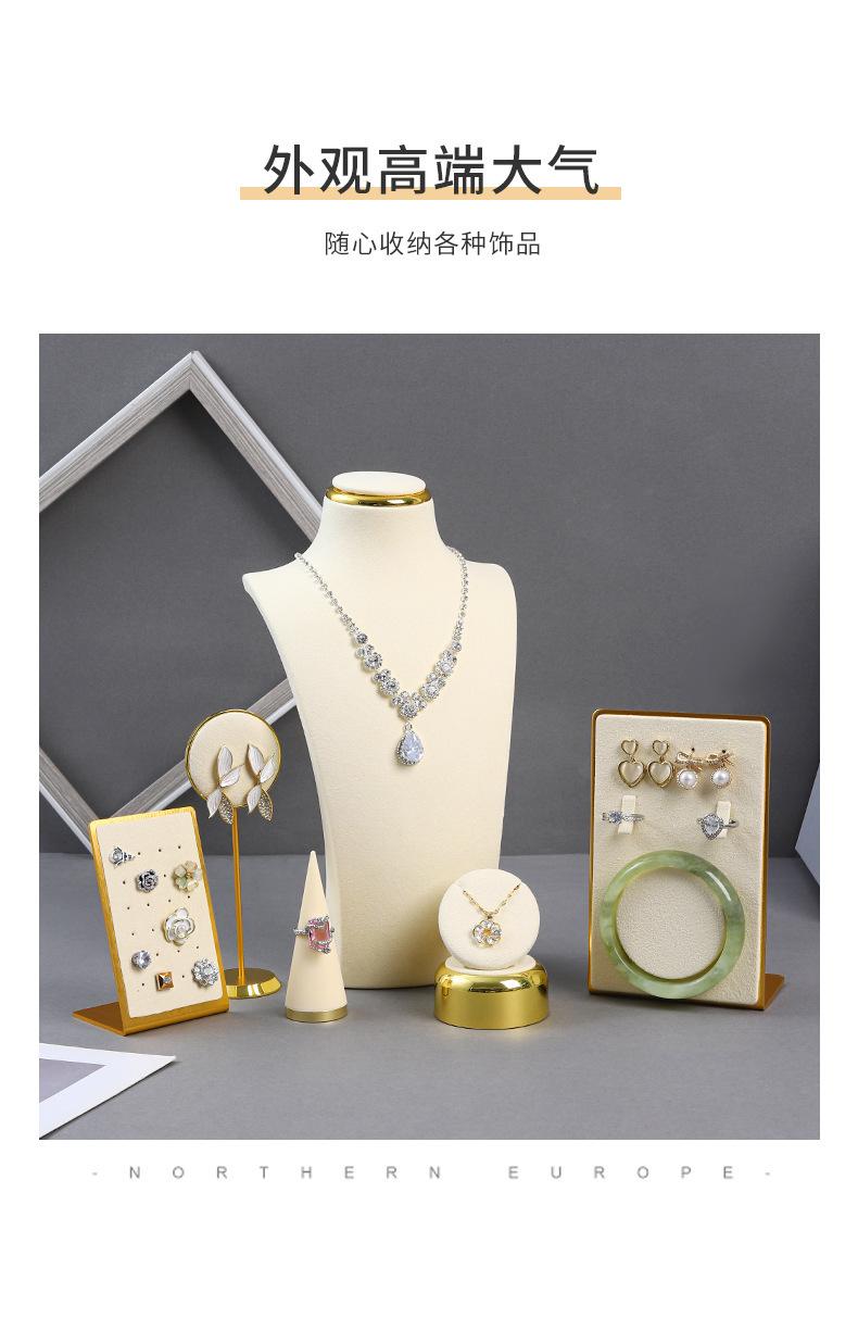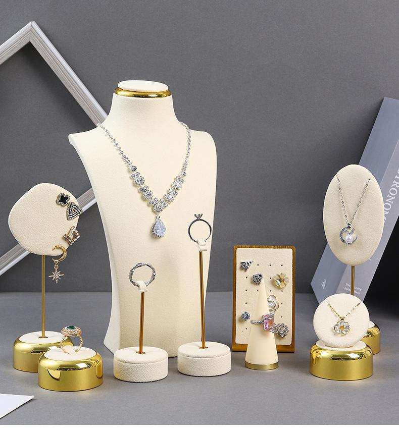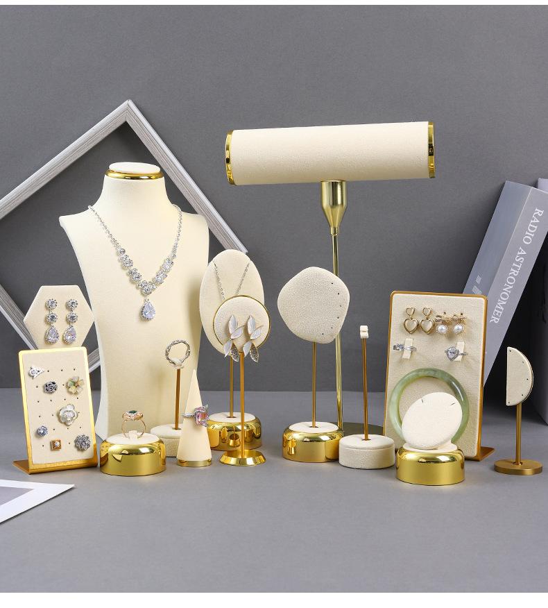 Estante de joyería a juego en stock, de metal blanco, de gamuza, para anillos, collares, pulseras, colgantes, accesorios de joyería.