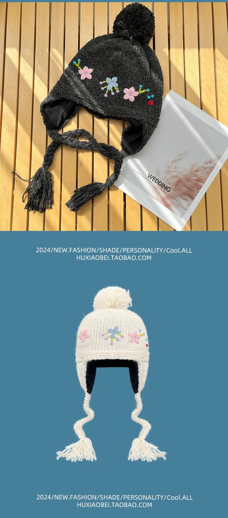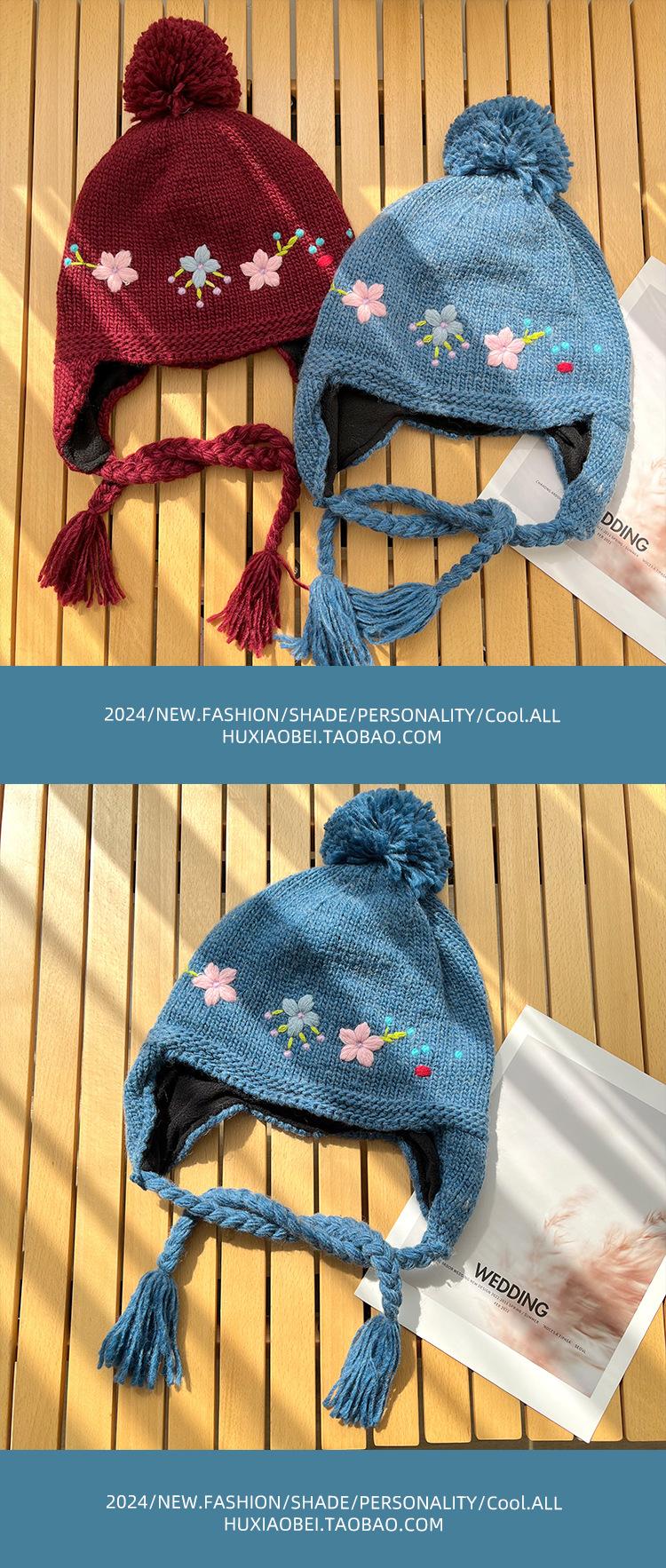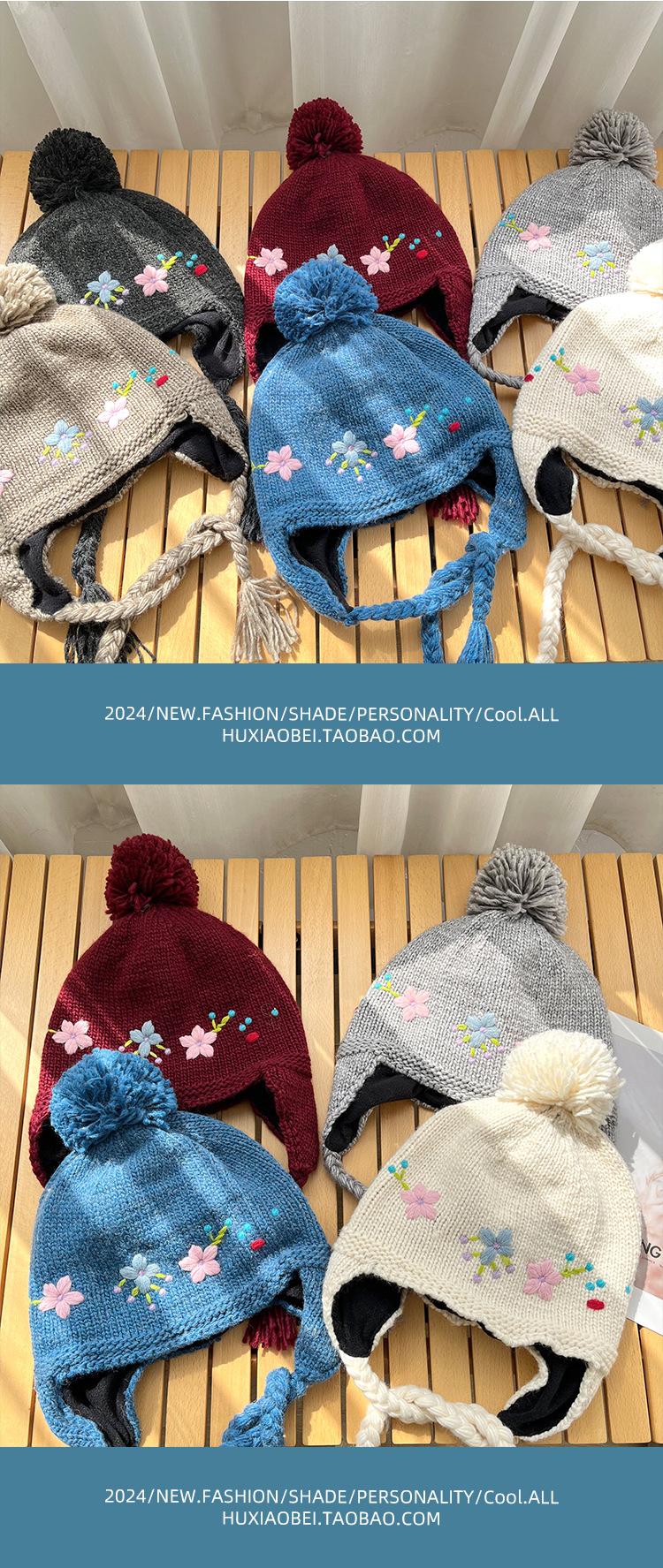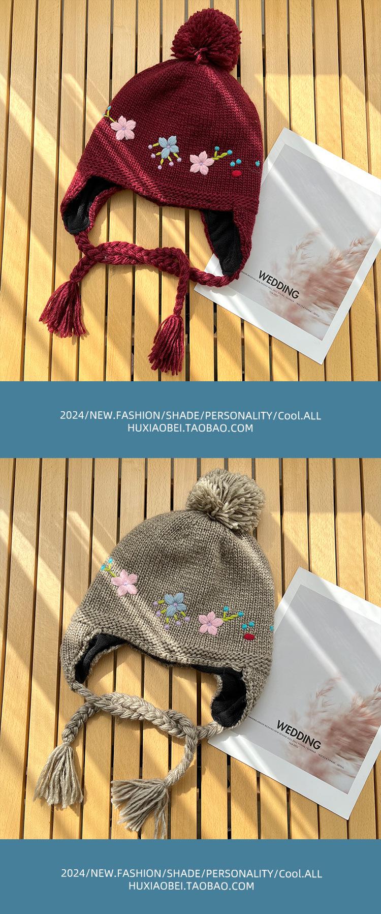 Gorro Lei Feng de punto hecho a mano con bordado vintage en jacquard, con protección para las orejas, para mujer, para otoño e invierno, resistente al frío y cálido, bonito gorro de lana de nicho.