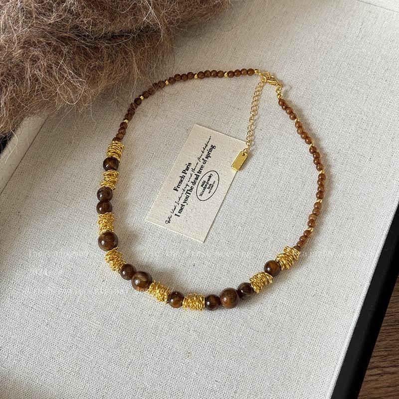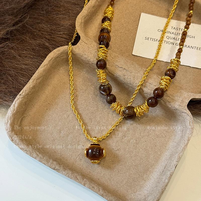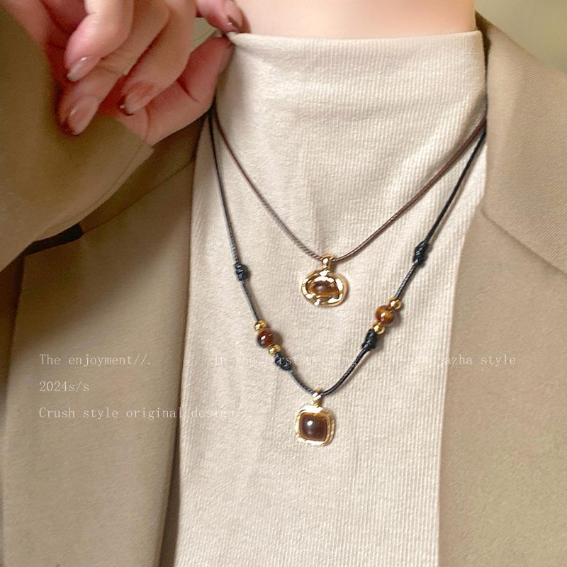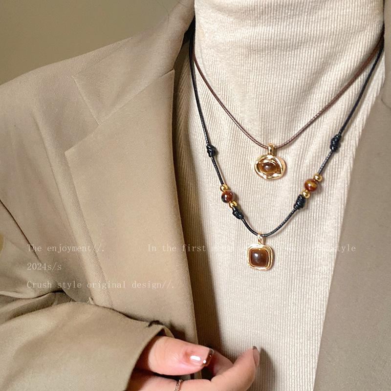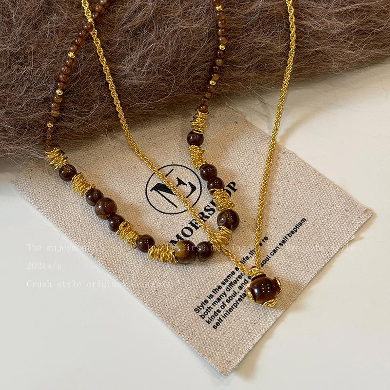 Compra Collar largo de lana estilo Maillard con piedra de ojo de tigre natural para mujer, de otoño e invierno, de lujo, de alta gama, de doble capa apilada. al por mayor en Joom.pro