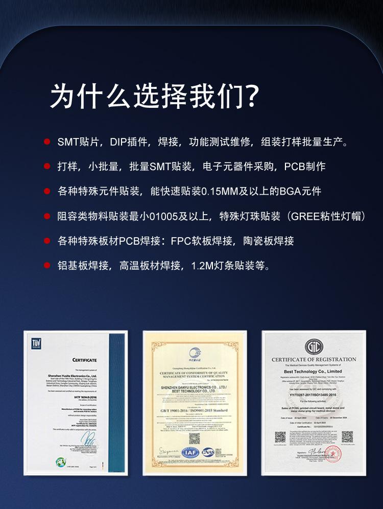 1) Centrarse en la adquisición y procesamiento de diversos productos electrónicos y el procesamiento de los materiales suministrados, incluidos: parches SMT, complementos DIP, soldadura, pruebas funcionales y mantenimiento, ensamblaje y pruebas, y producción en masa.