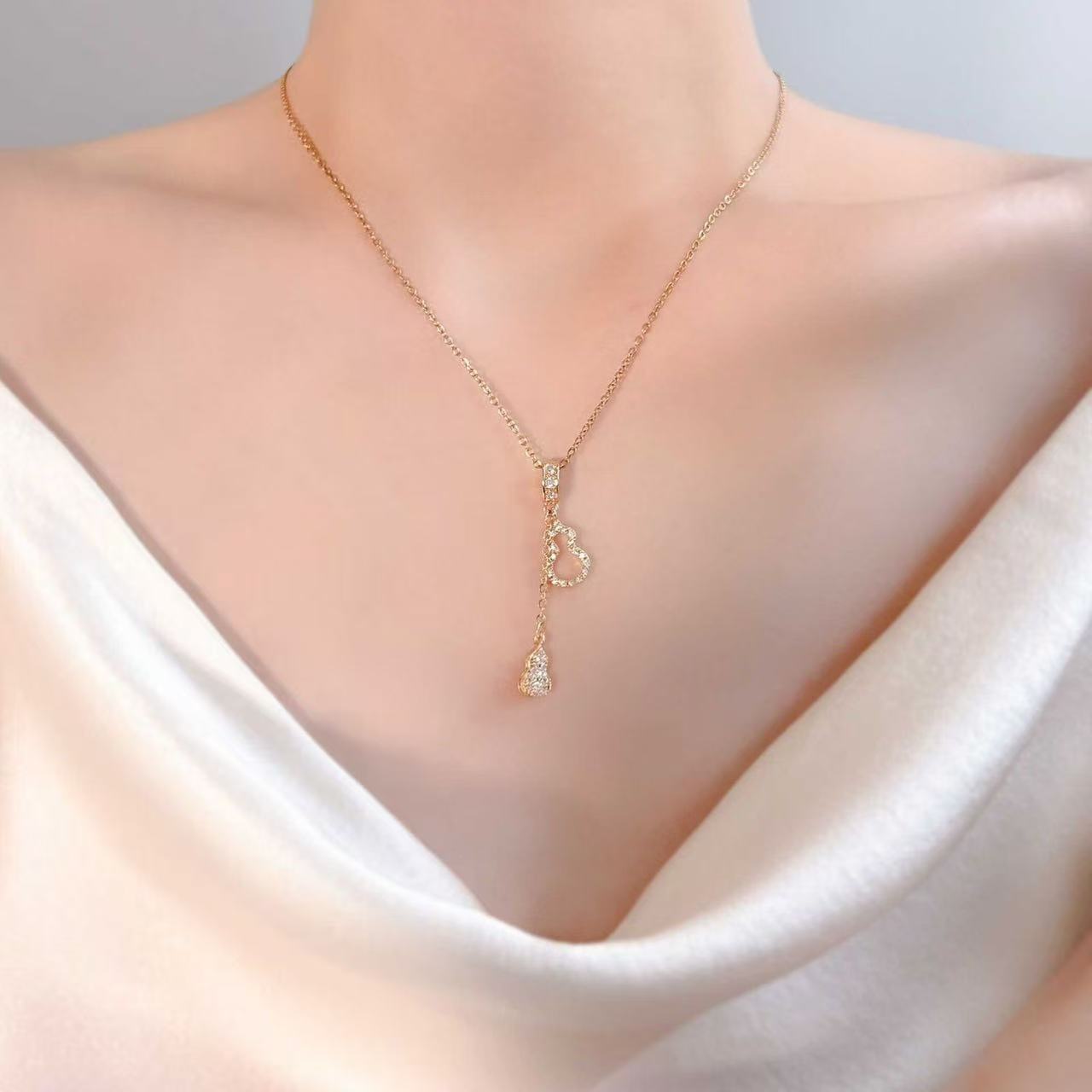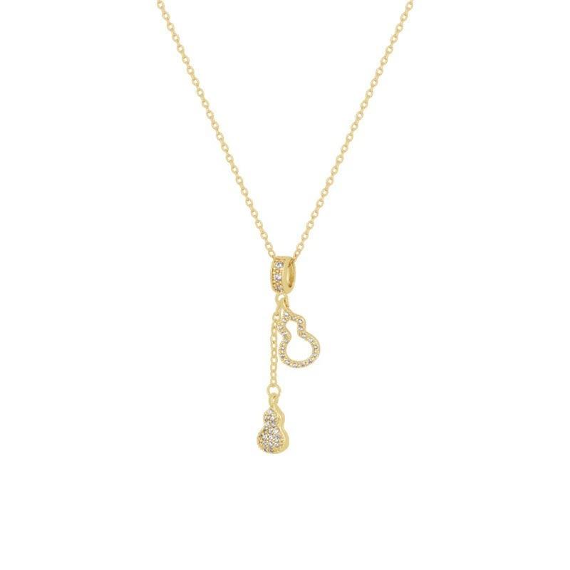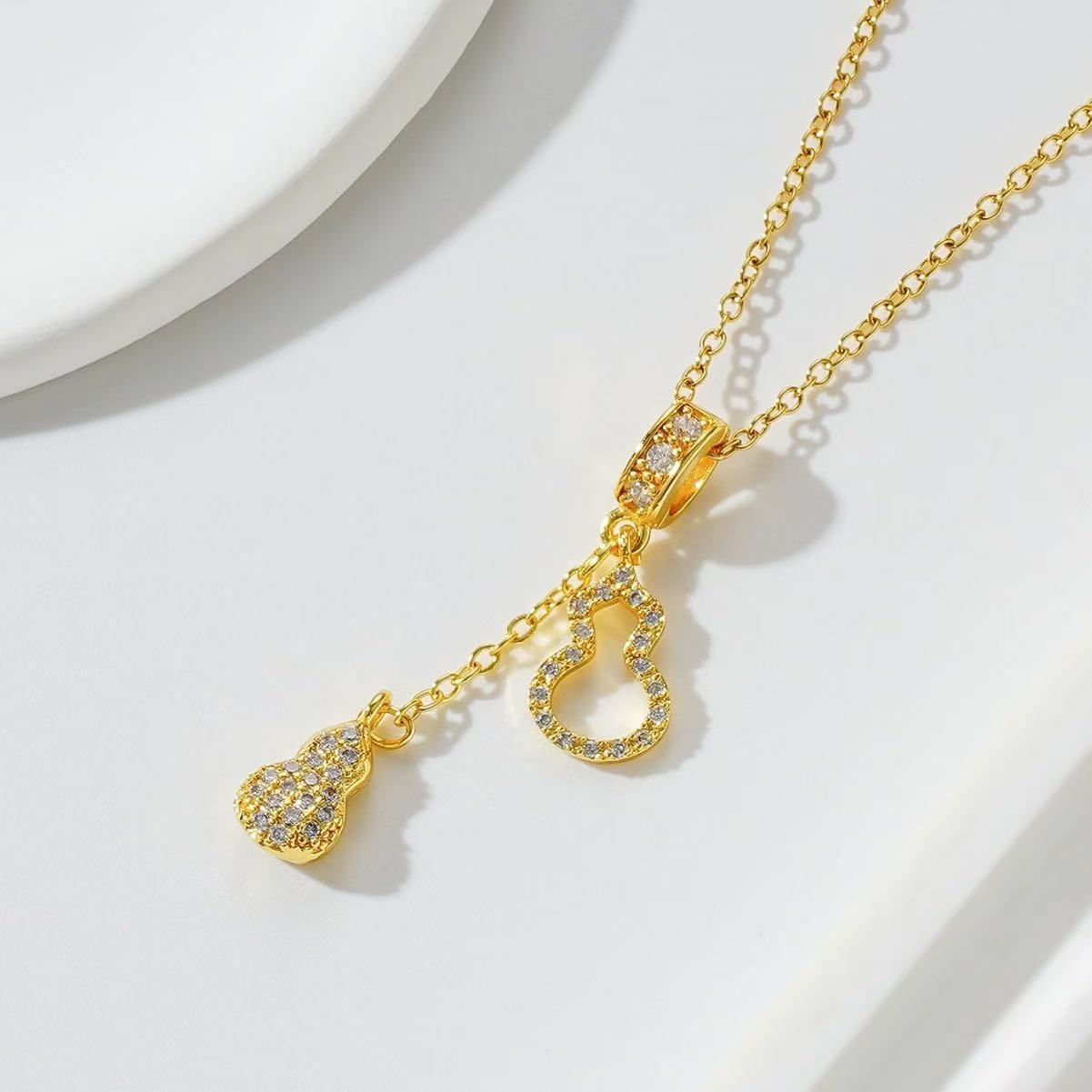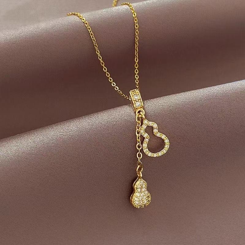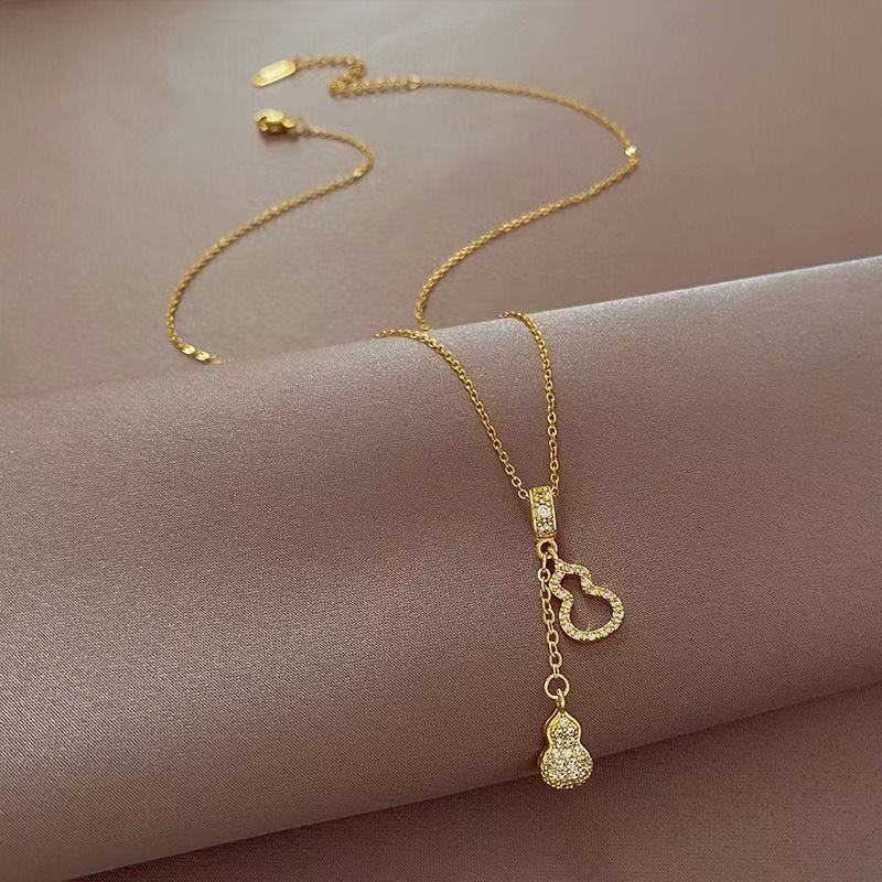 Collar de Acero de Titanio de Calabaza con Borlas Gemelas de Diamantes Completos de Lujo Ligero para Mujer, Versátil, Diseño Nicho, Cadena para Clavícula, Accesorios de Alta Gama