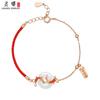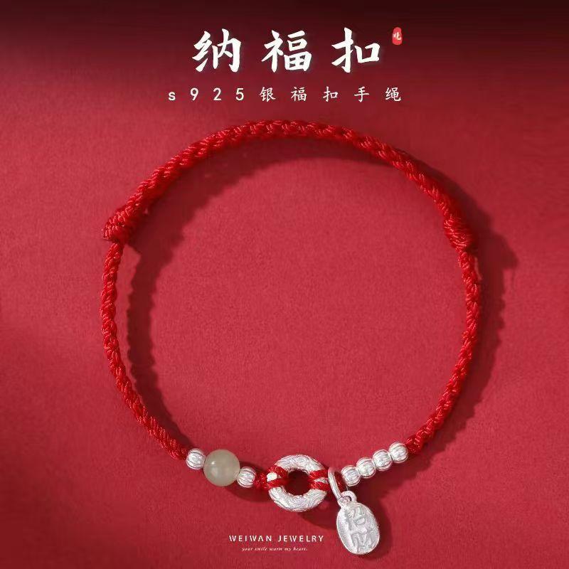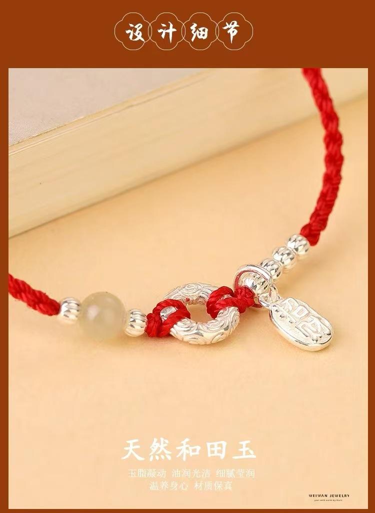 "Nafu Hebilla" Jade Hetian Cuerda Roja Plateada Pulsera Tejida a Mano para Mujer Hebilla de Seguridad Regalo Antiguo