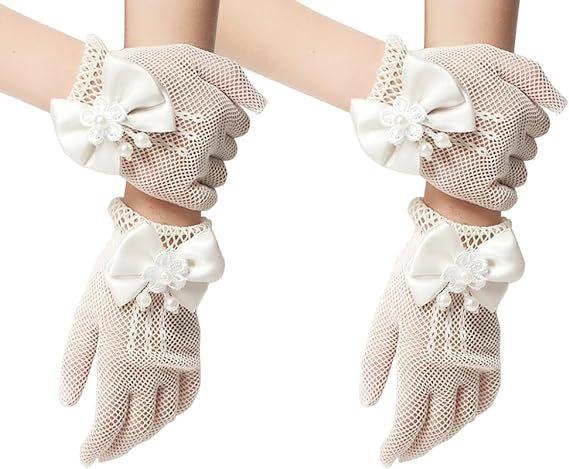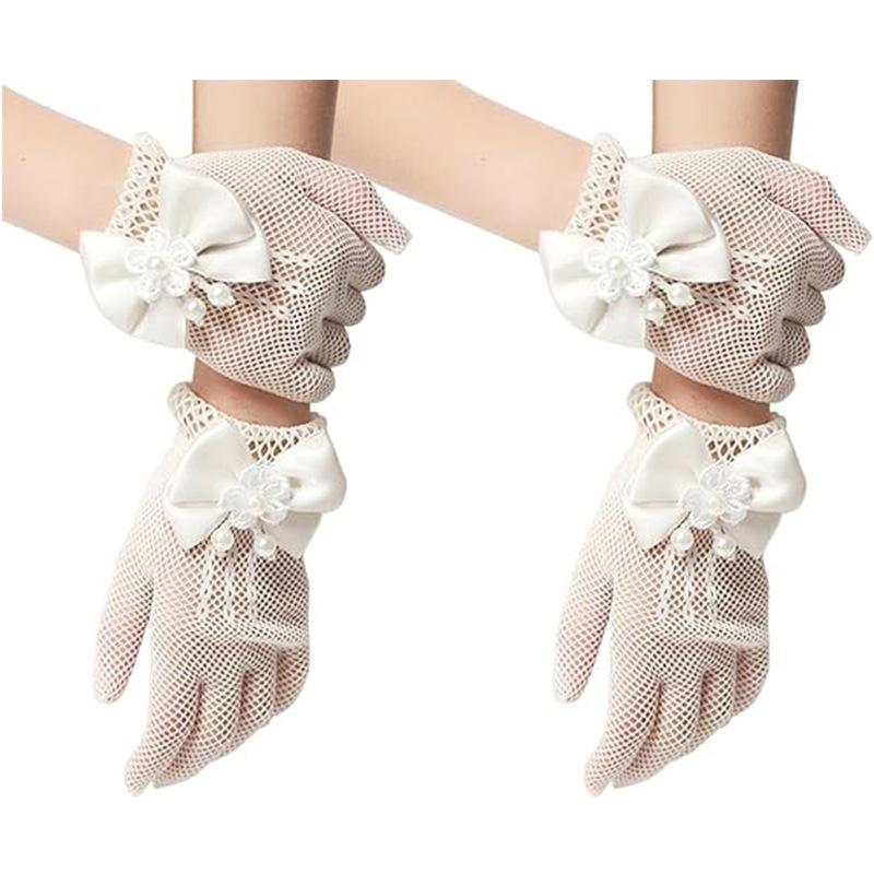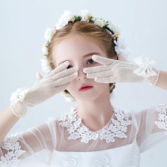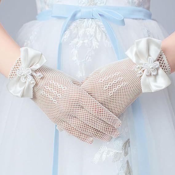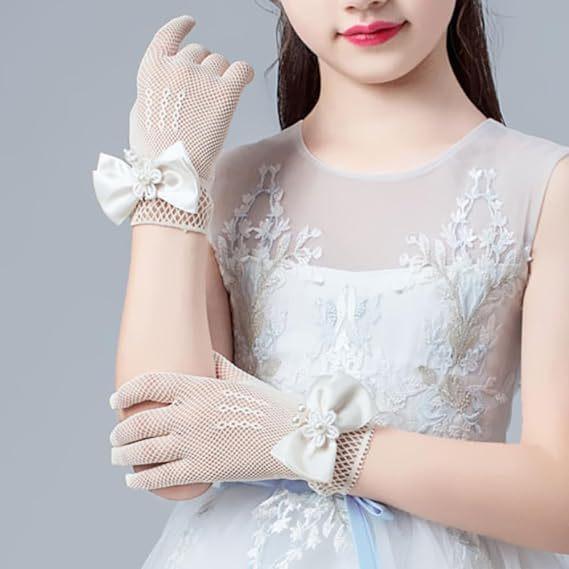 Guantes de flores, guantes de princesa de encaje, guantes de fiesta de té, guantes de rejilla con lazo para niña pequeña, guantes de boda