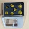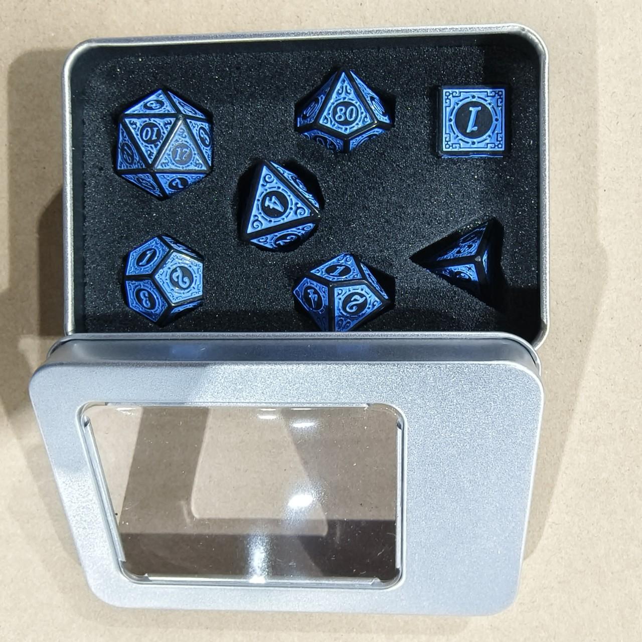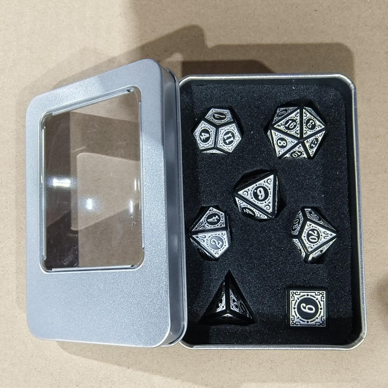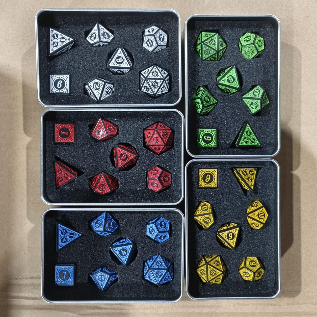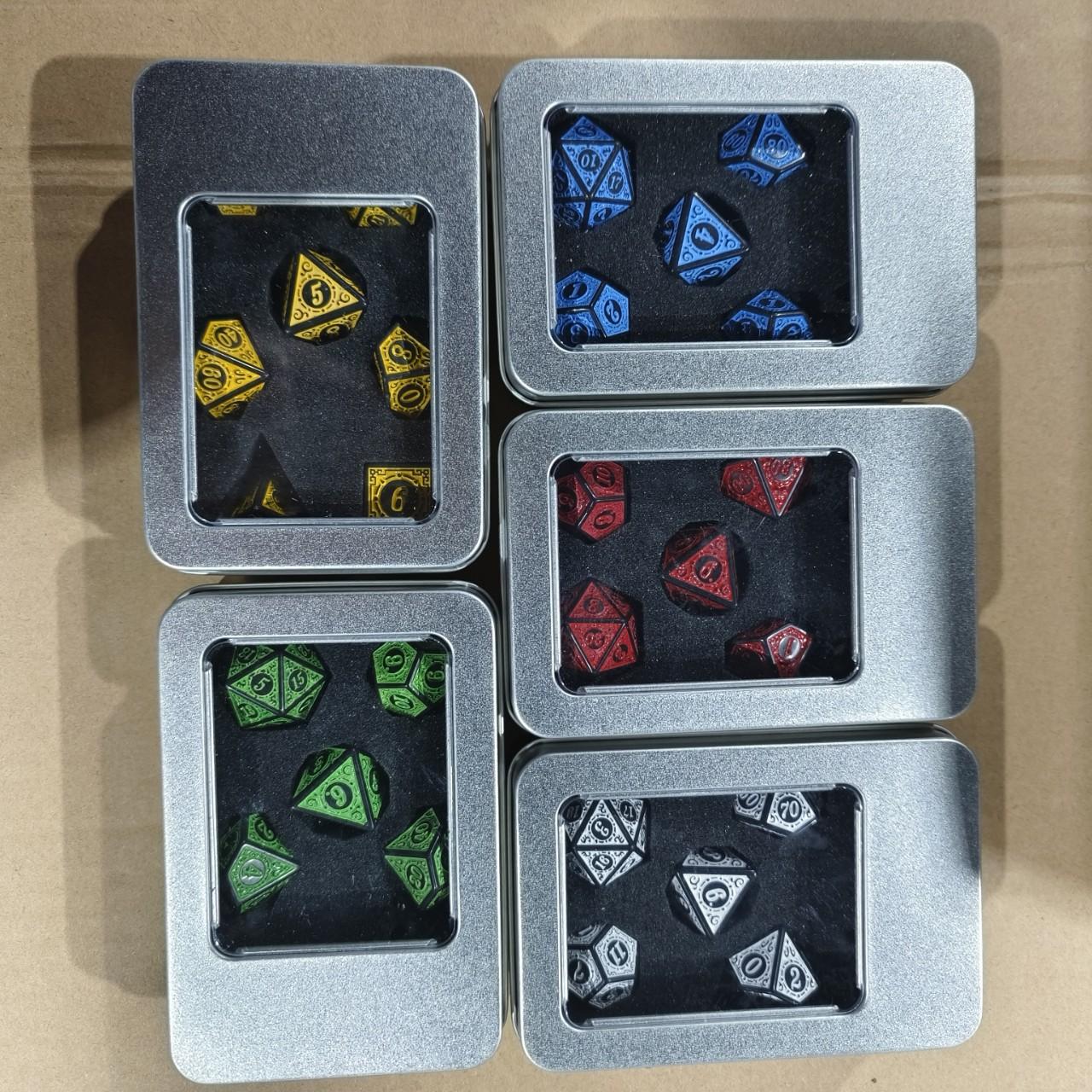 Nombre: Dados de juego de mazmorras y dragones multifacéticos con patrón antiguo nuevo, dados de juego de mesa (7 juegos de embalaje en caja de hierro)