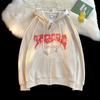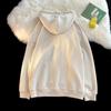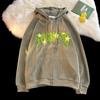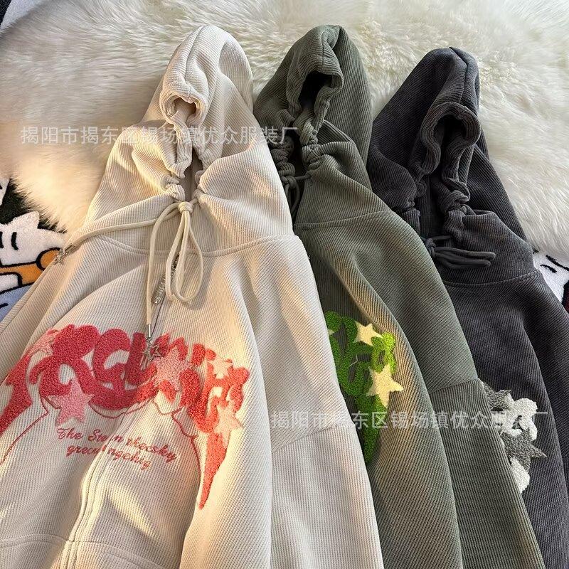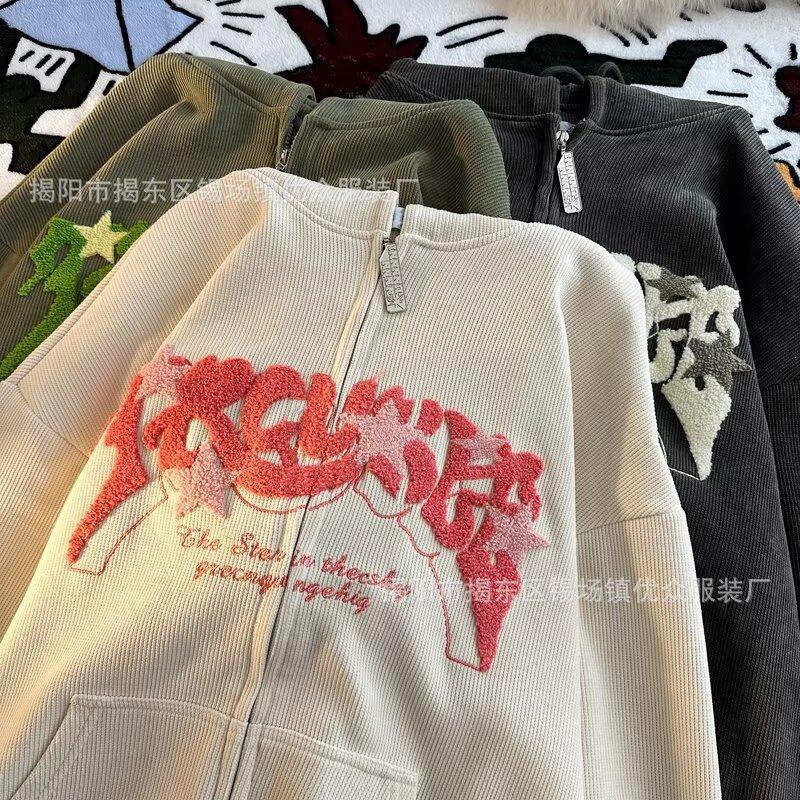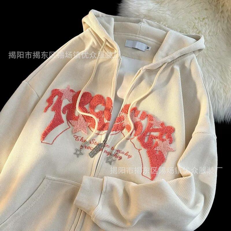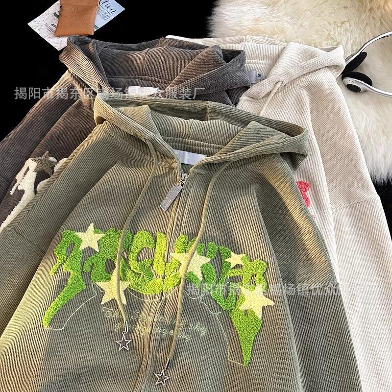 Suéter tipo cárdigan con capucha y bordado de letras retro engrosado con forro polar estilo americano transfronterizo para parejas, abrigo holgado con capucha