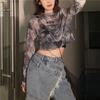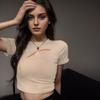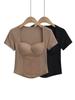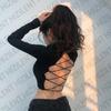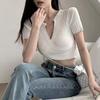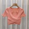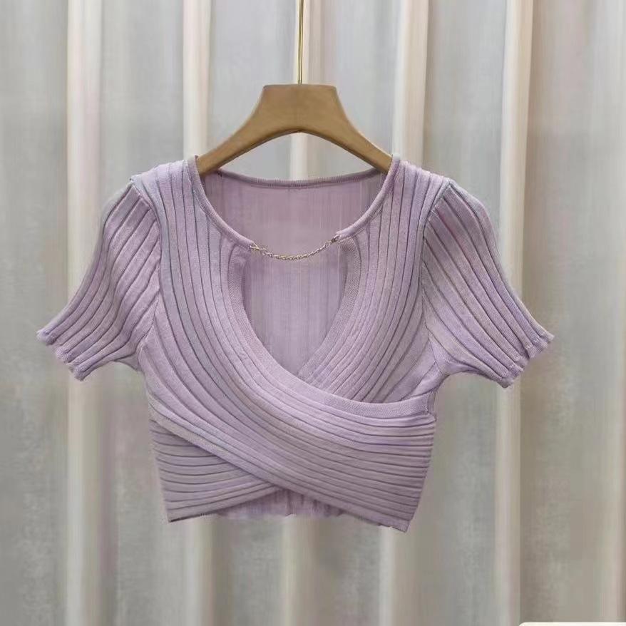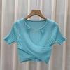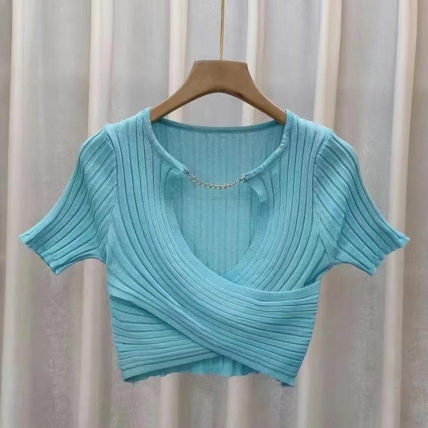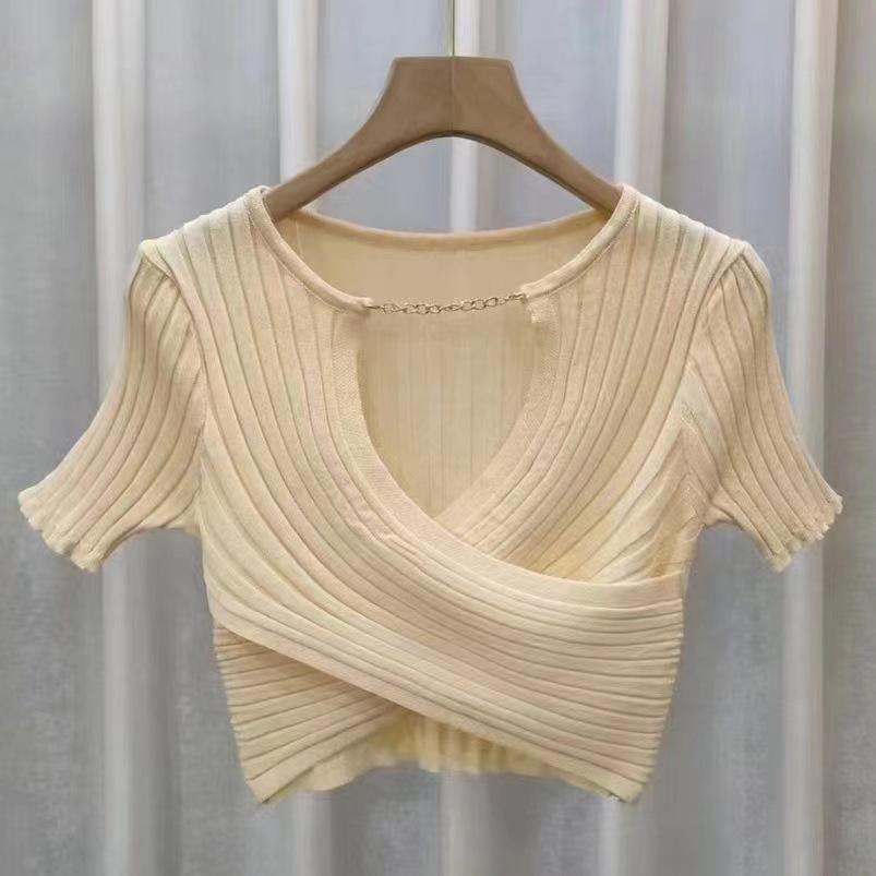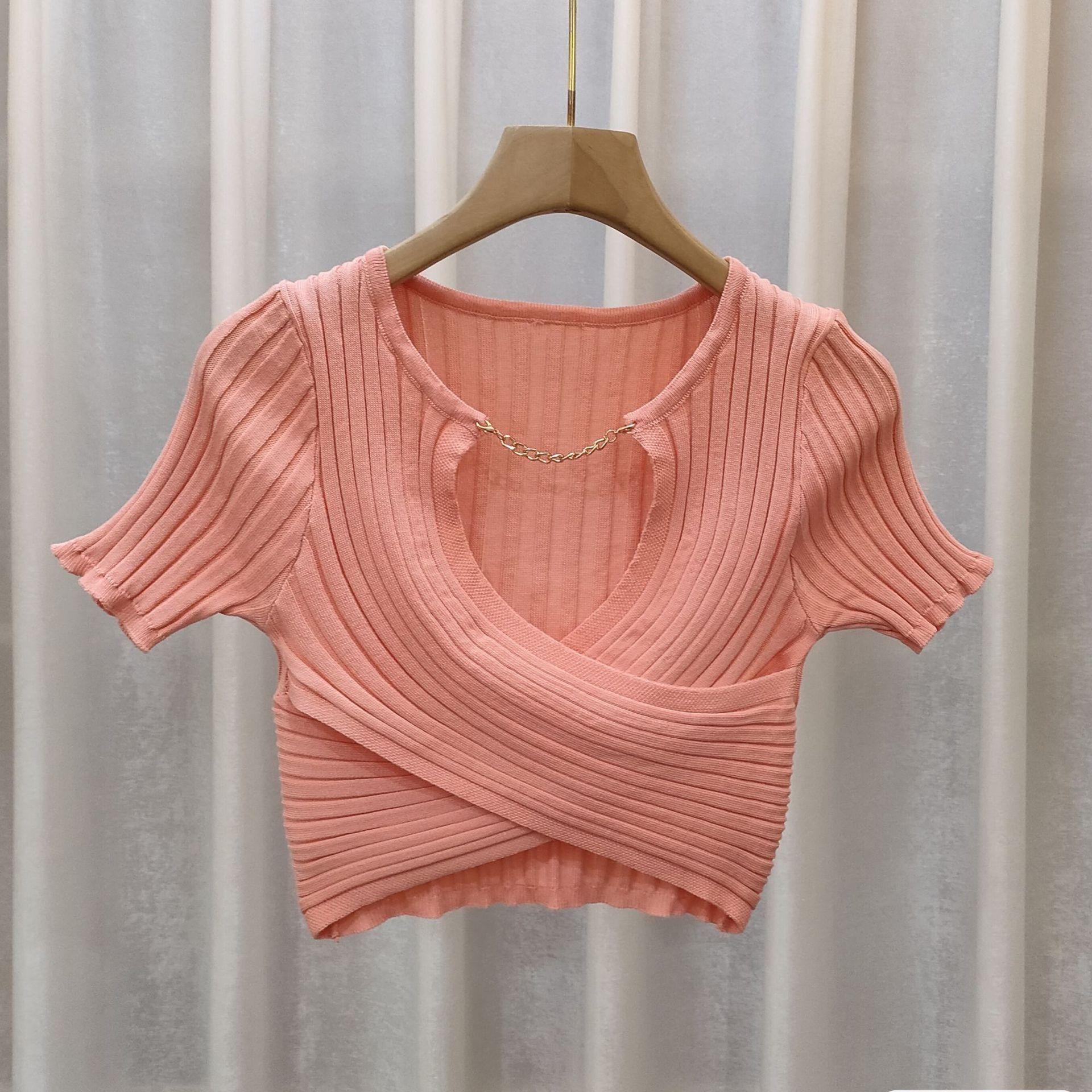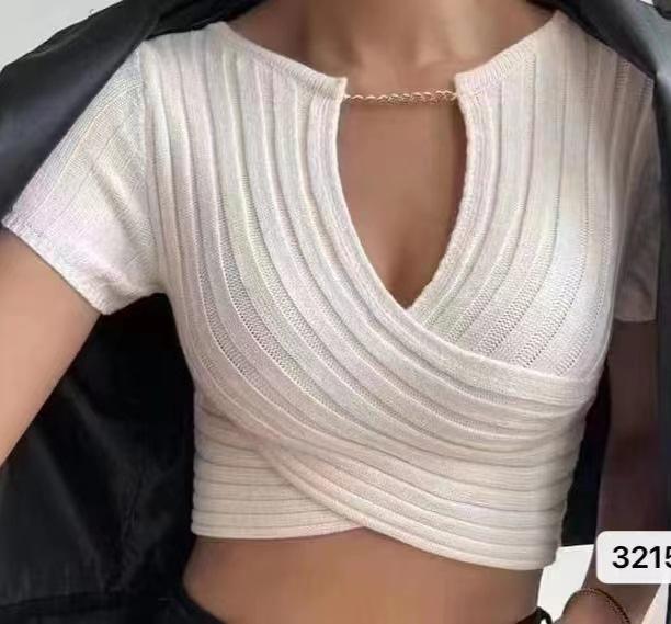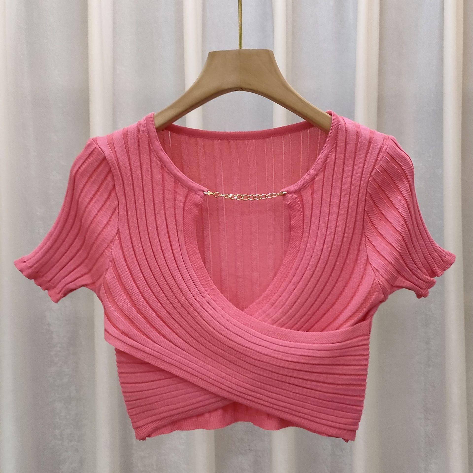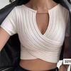 2025 Nuevo Estilo de Verano Ombliguera Ajustada Sexy Cintura Alta Estilo Europeo y Americano Sexy Corte Profundo Asimétrico Cruz Manga Corta Mujer