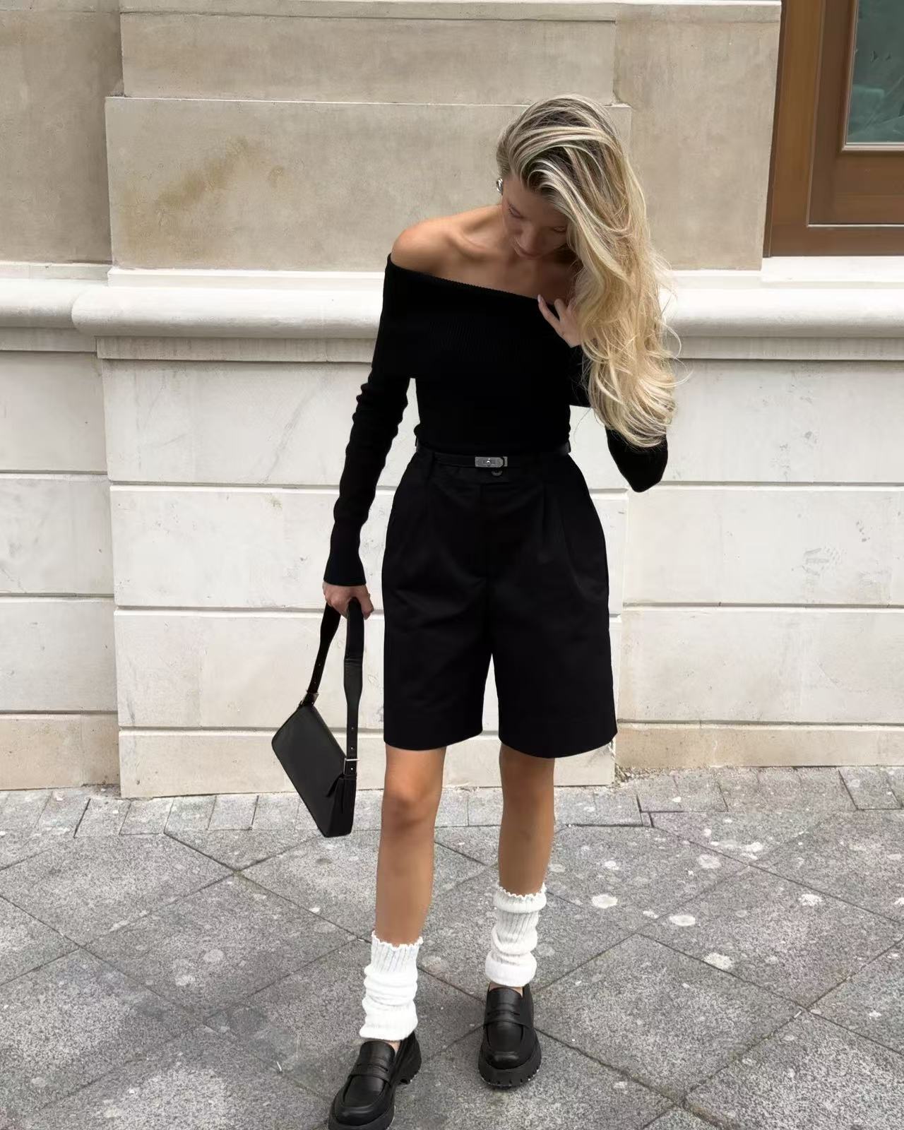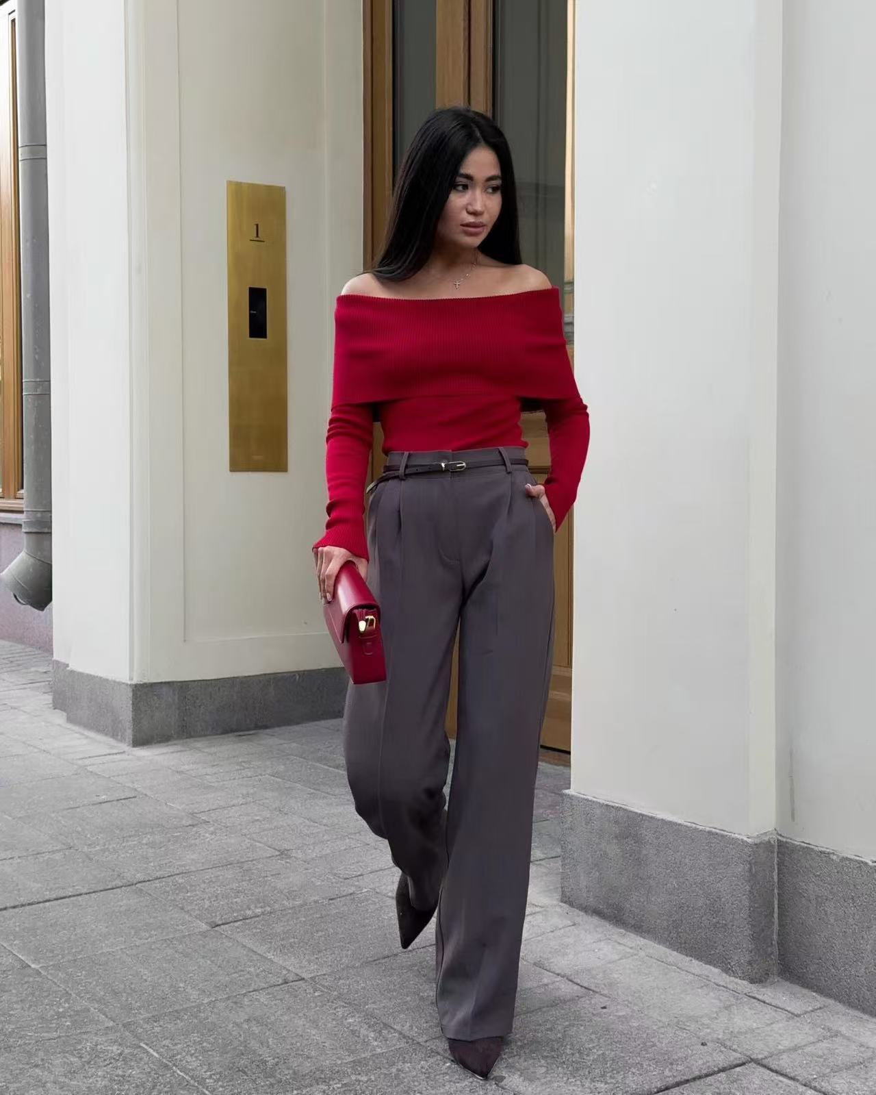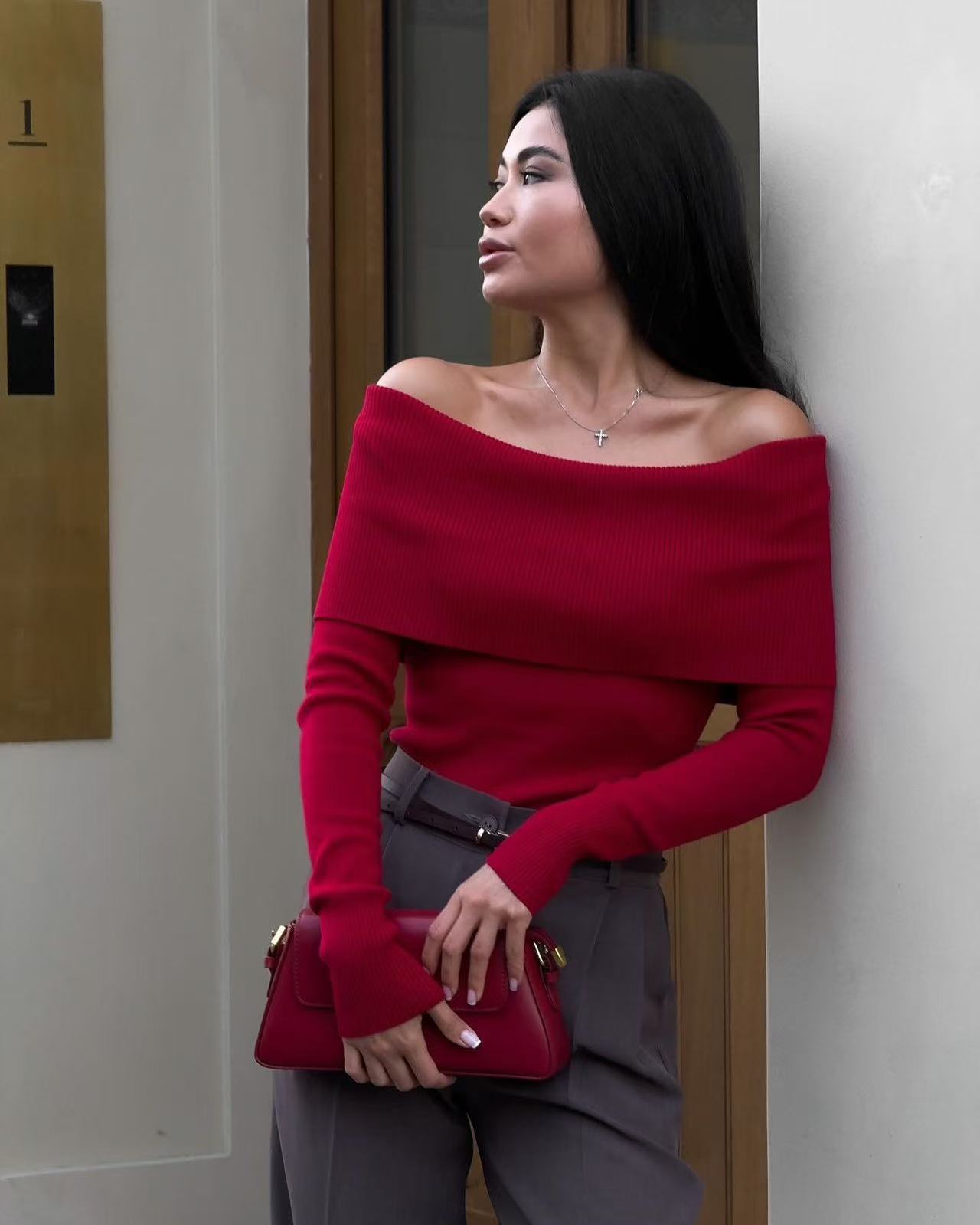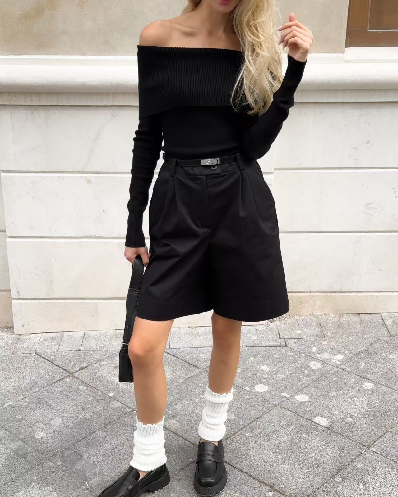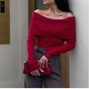 Top de Punto con Sentido del Diseño Transfronterizo Europeo y Americano para Mujer Sexy Spice Girl Hombro Descubierto Camisa de Punto Suéter de Punto Ajustado para Mujer