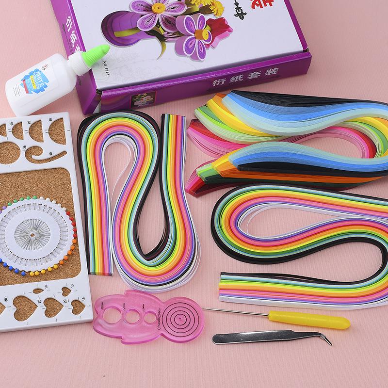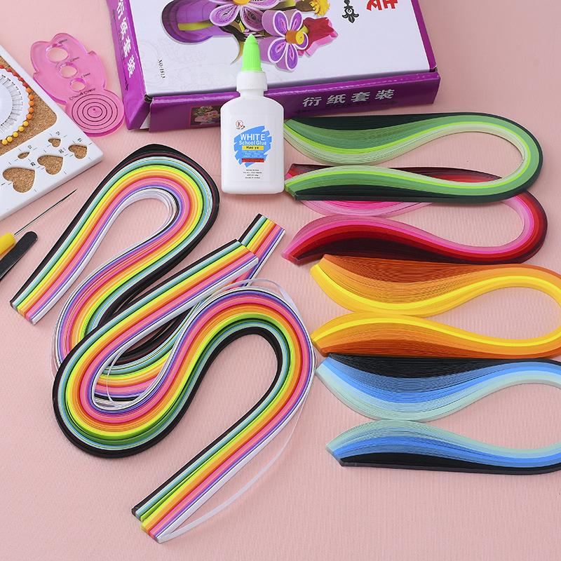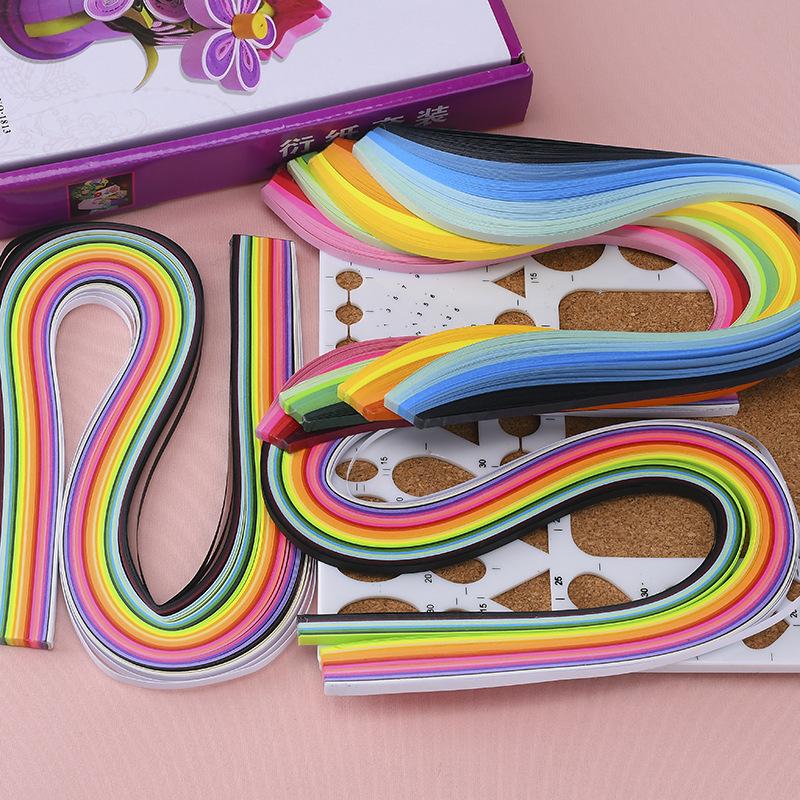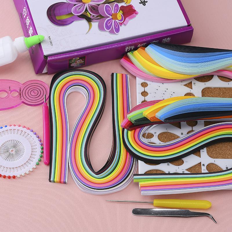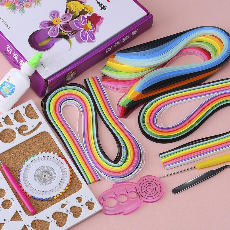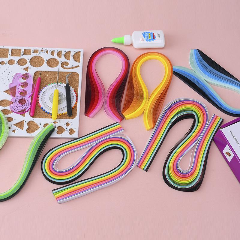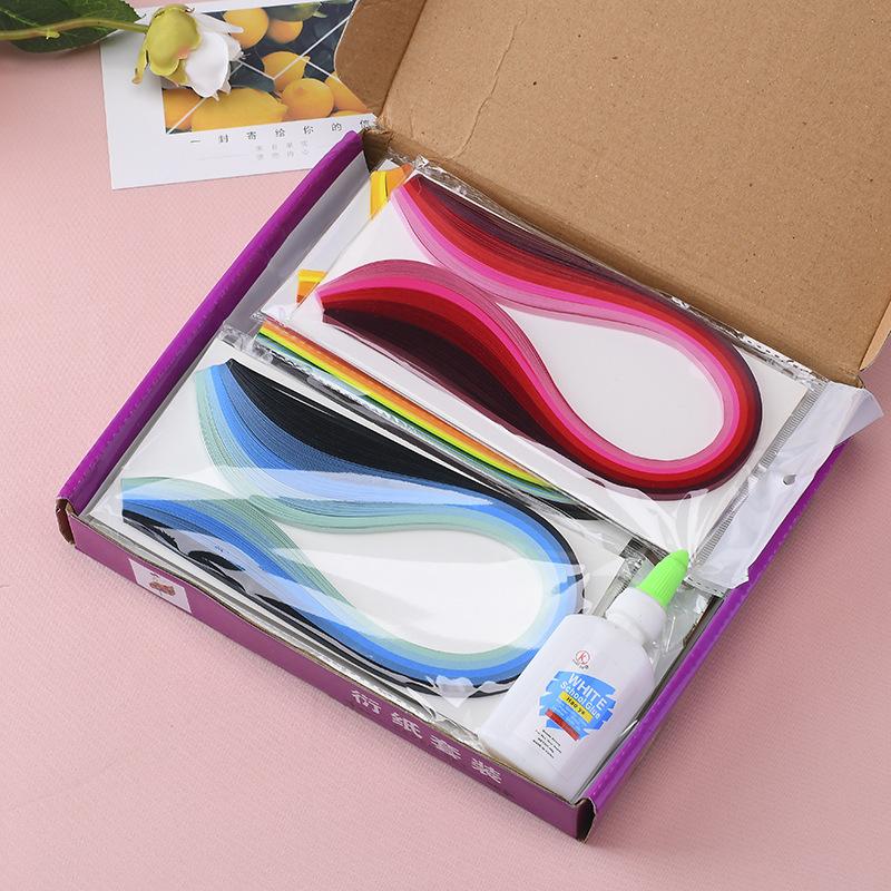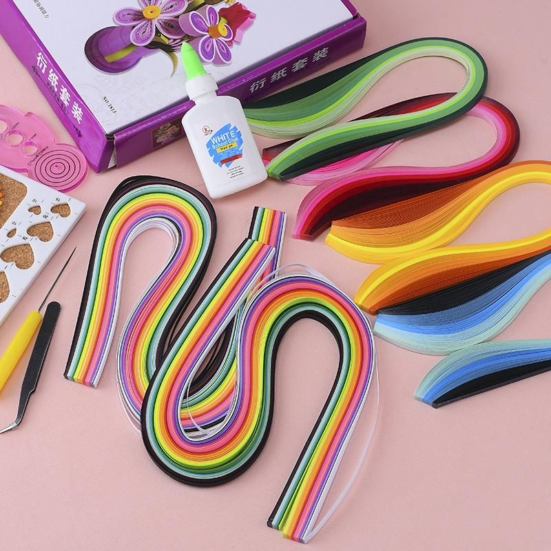 El set incluye: 2 paquetes de 160 tiras coloridas de 5mm de largo 54cm, 4 paquetes de 100 colores degradados de largo 39cm, herramientas incluyen una pluma para quilling, una botella de pegamento, un punzón, pinzas, una aguja para cuentas y una plantilla de segunda generación con colores aleatorios, ¡un total de 13 artículos!