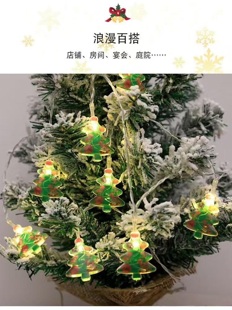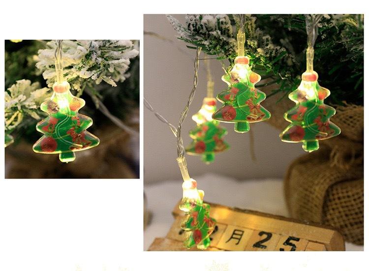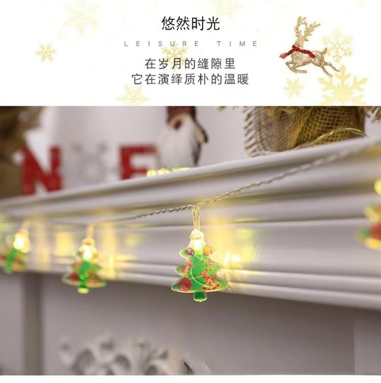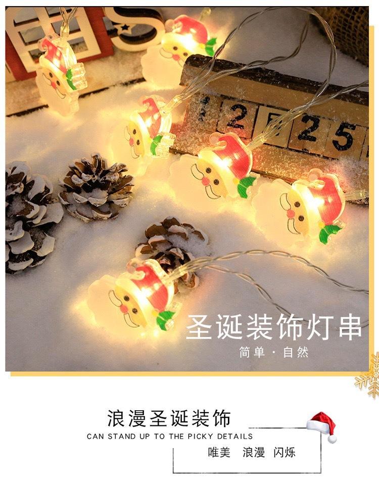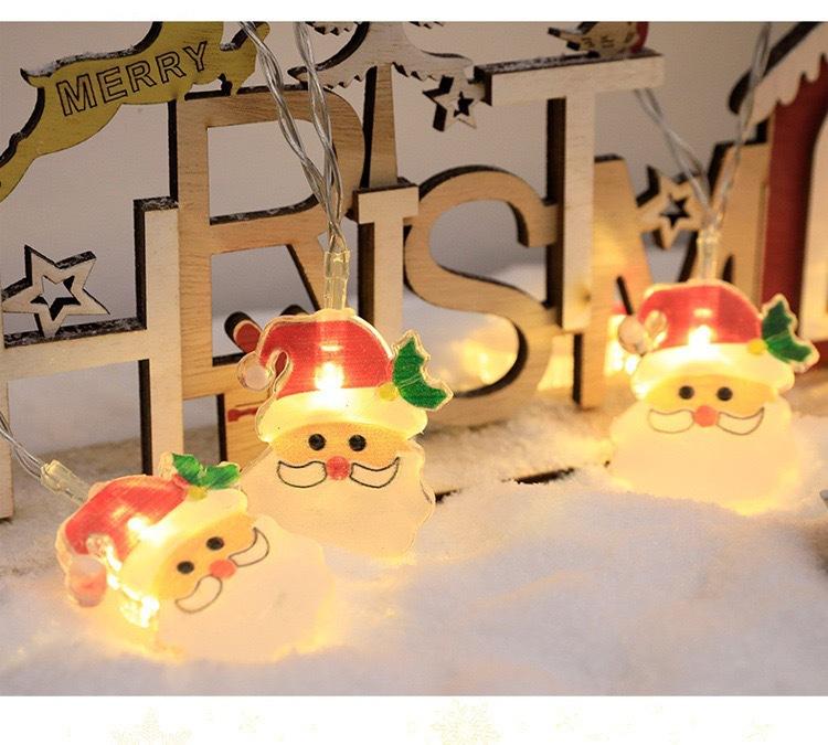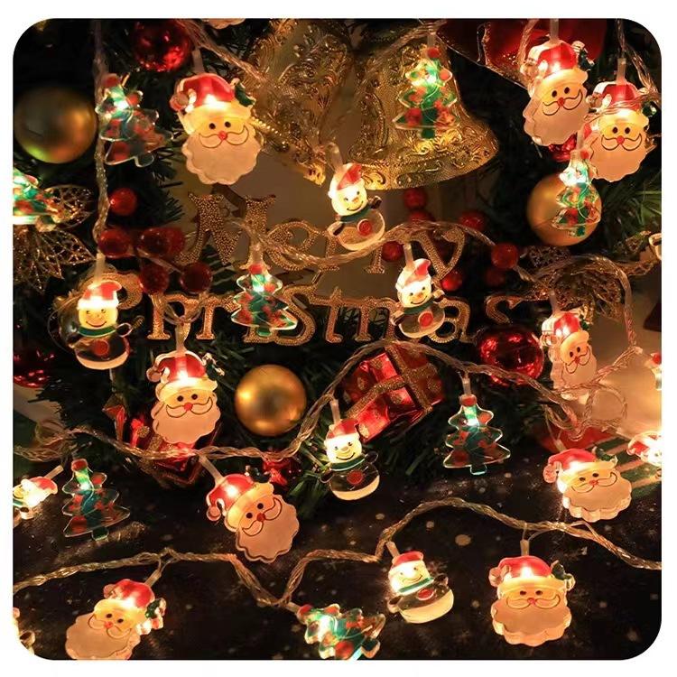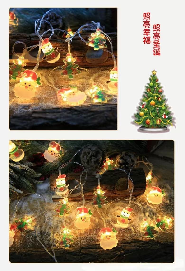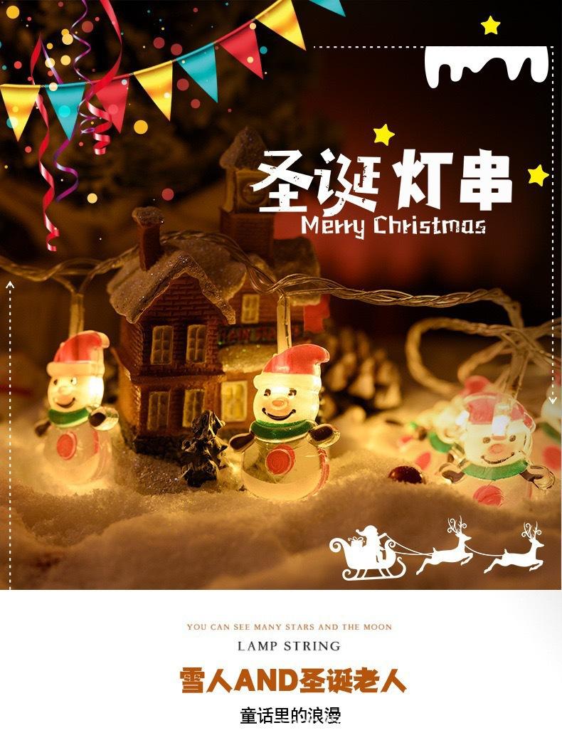 Cadena de luces LED navideñas con diseño de muñeco de nieve y dibujos animados, ideal para fiestas navideñas, con escena decorativa y ambiente.