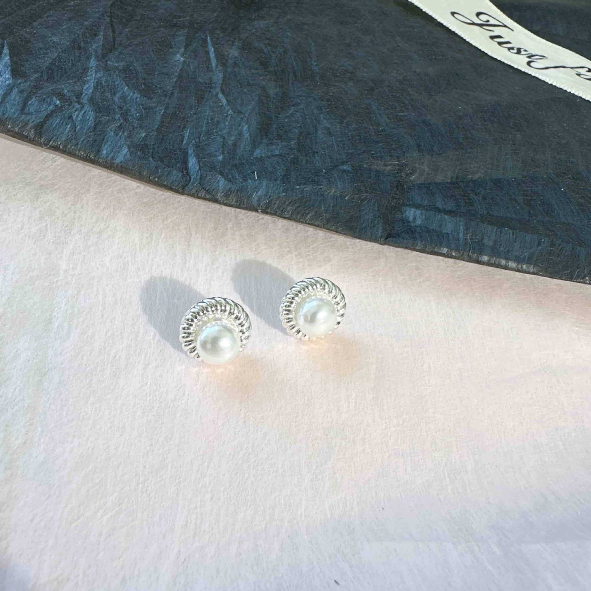 Pendientes elegantes franceses plisados de perlas de agua dulce con diseño de nicho, pendientes retro, joyería sencilla para las orejas.