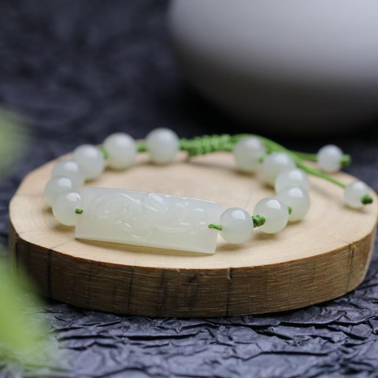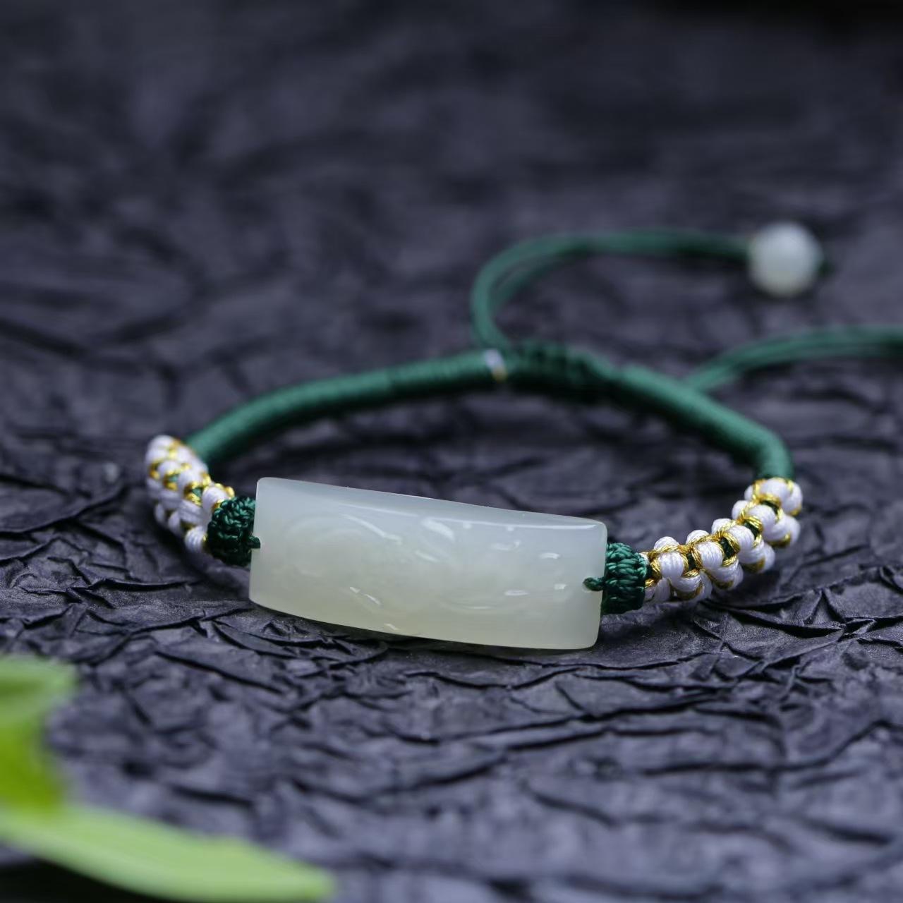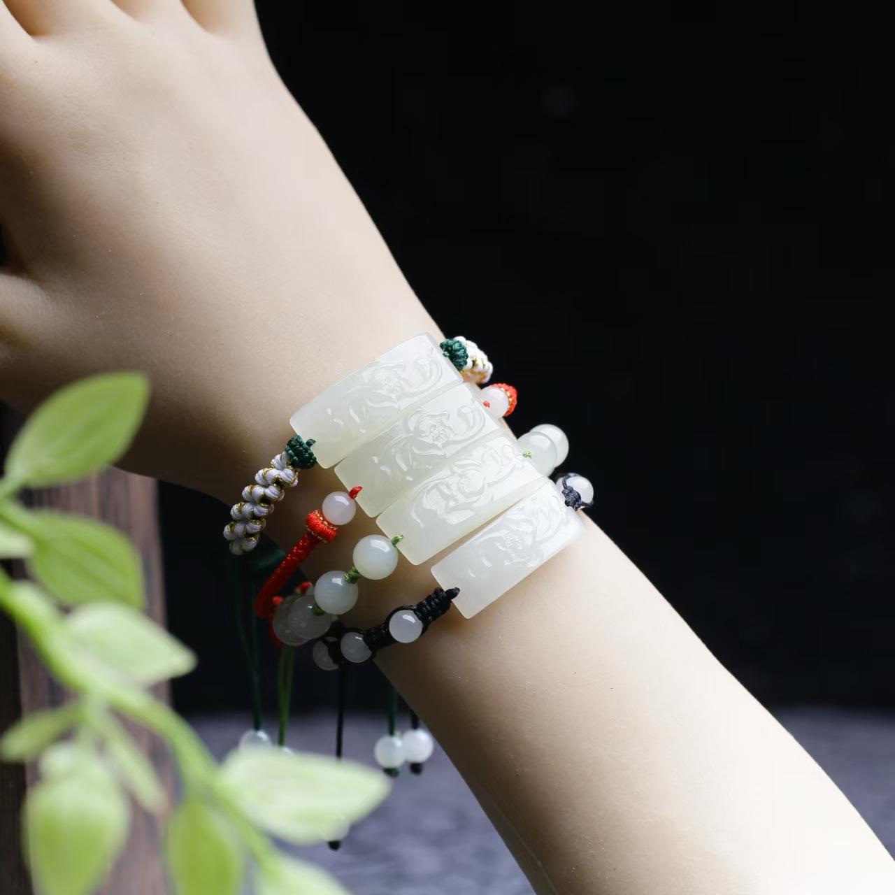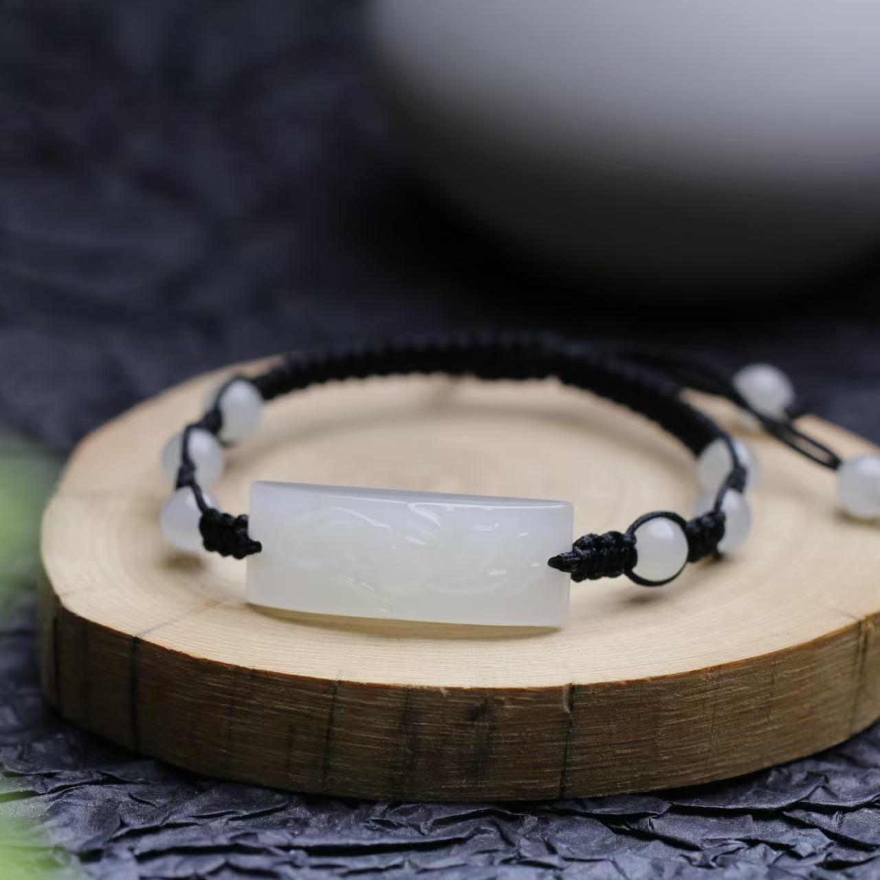 Pulsera vintage de jade hetiano natural con flor de peonía hecha a mano, hecha a mano, con cuerda tejida para hombres y mujeres.