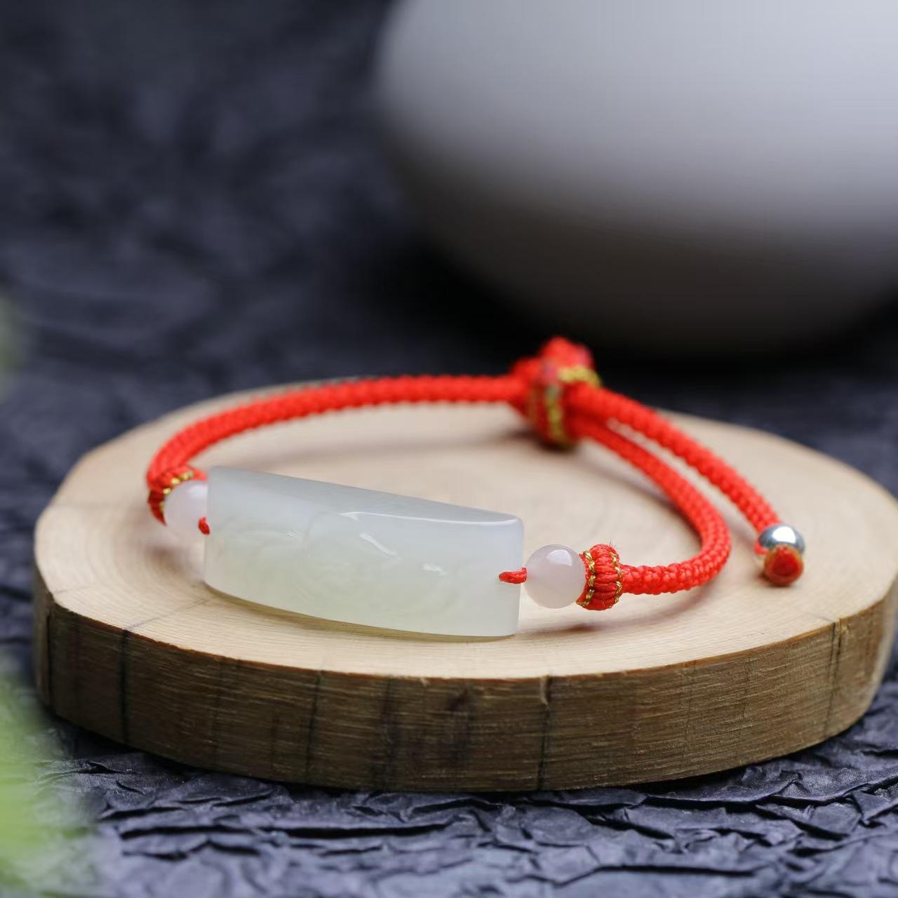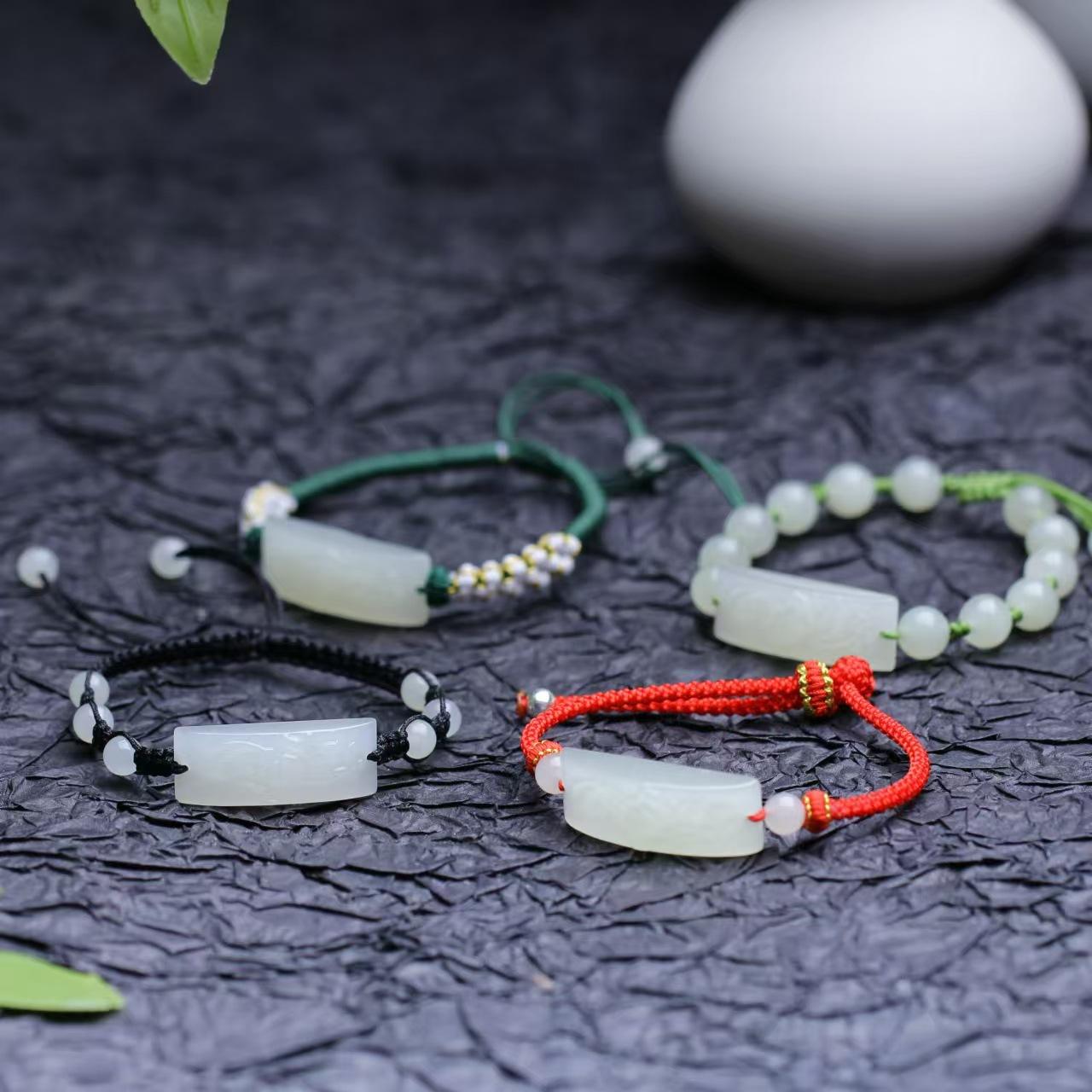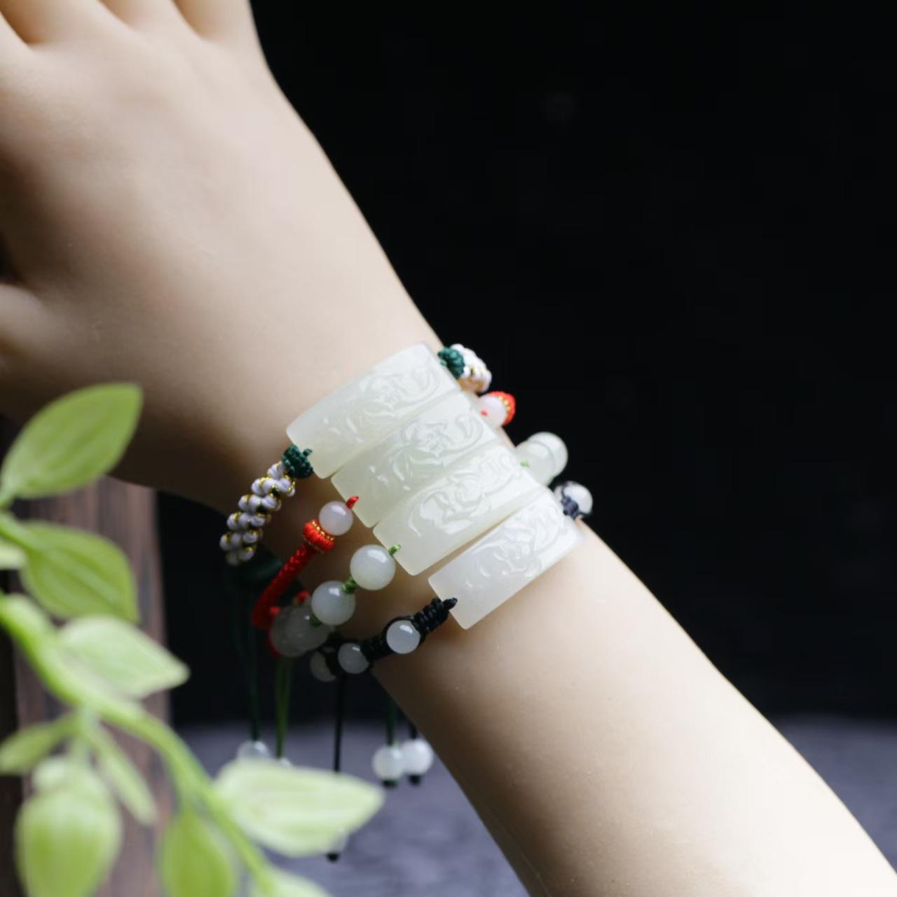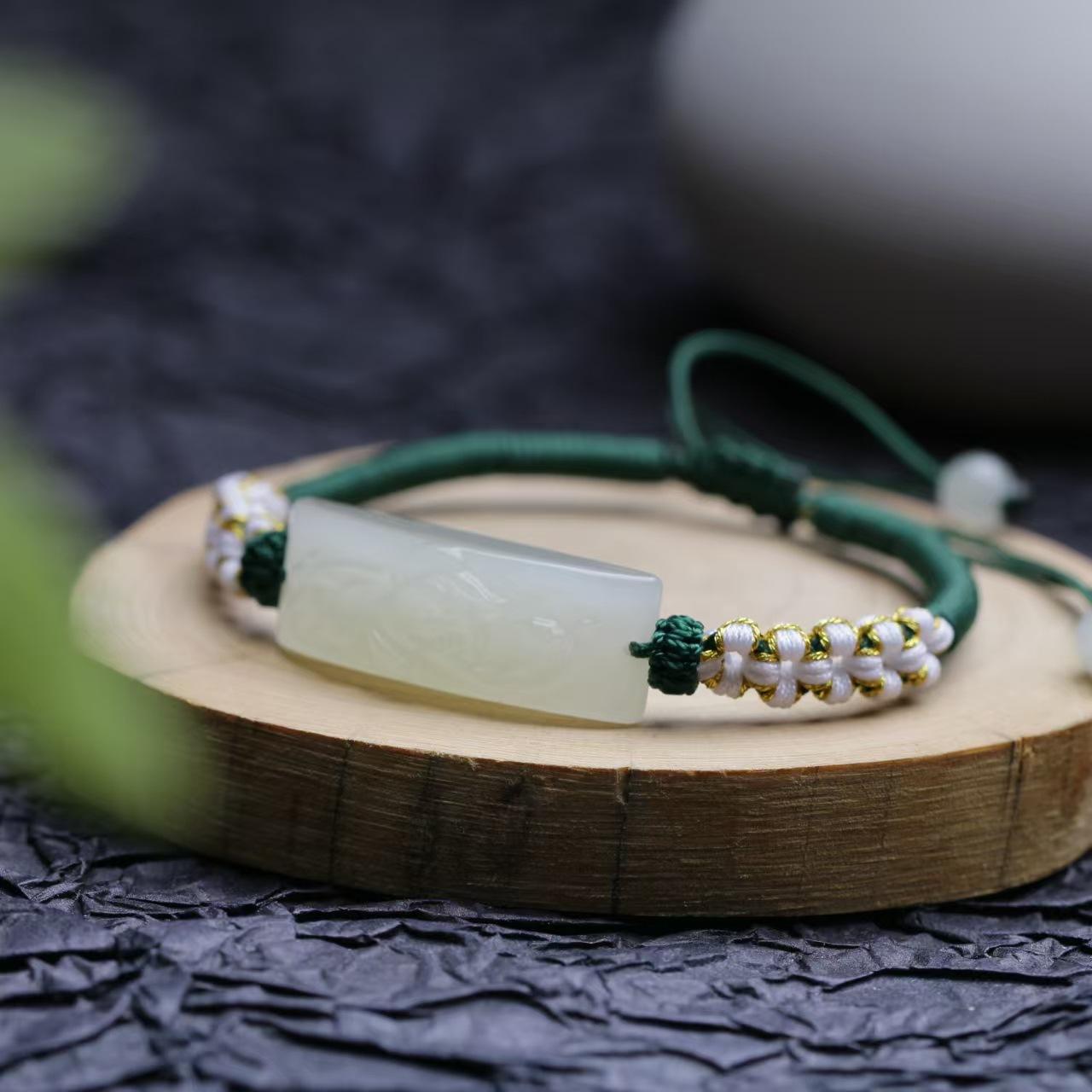Pulsera vintage de jade hetiano natural con flor de peonía hecha a mano, hecha a mano, con cuerda tejida para hombres y mujeres.