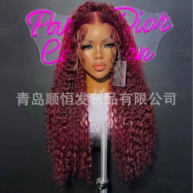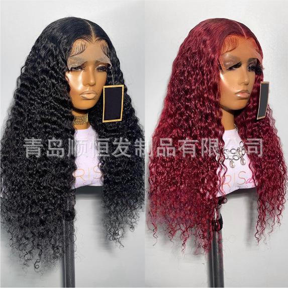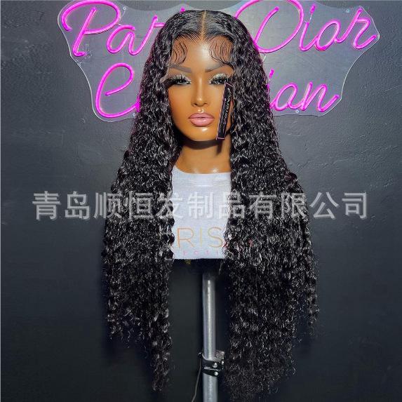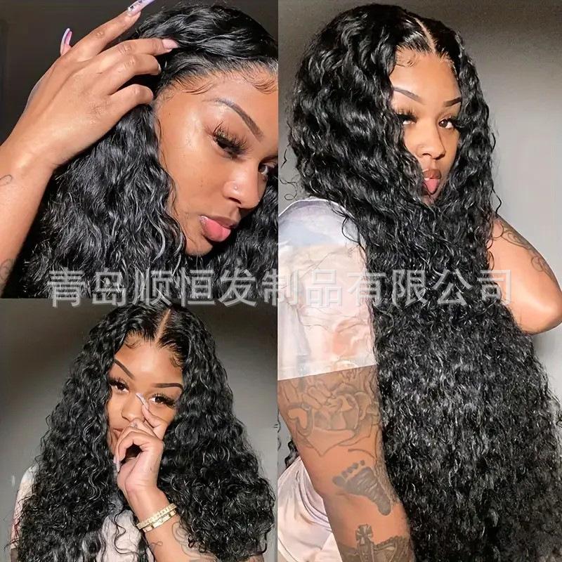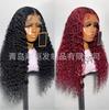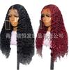 Peluca europea y americana para mujer, cabello largo, rizado, negro medio, con encaje frontal, tocado.