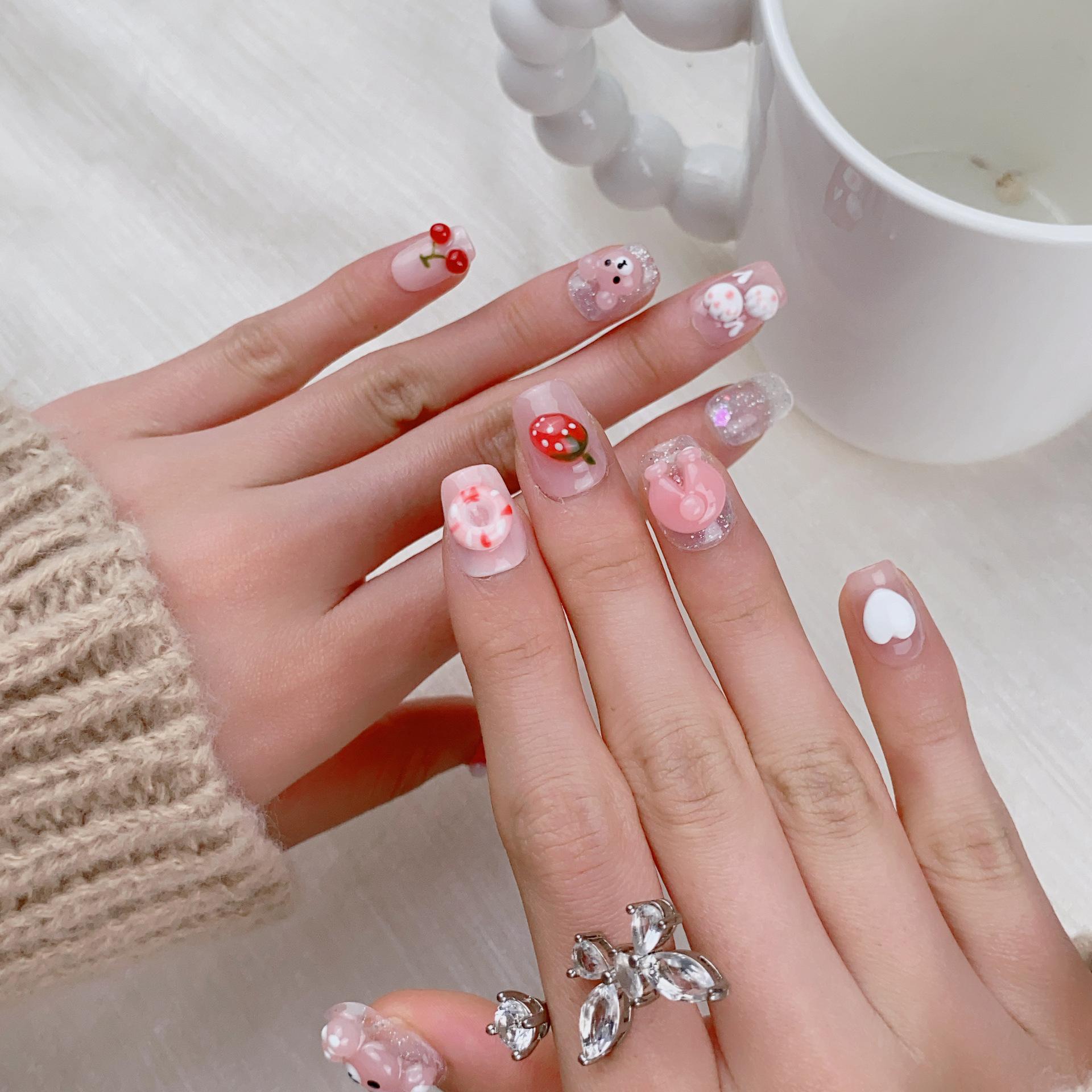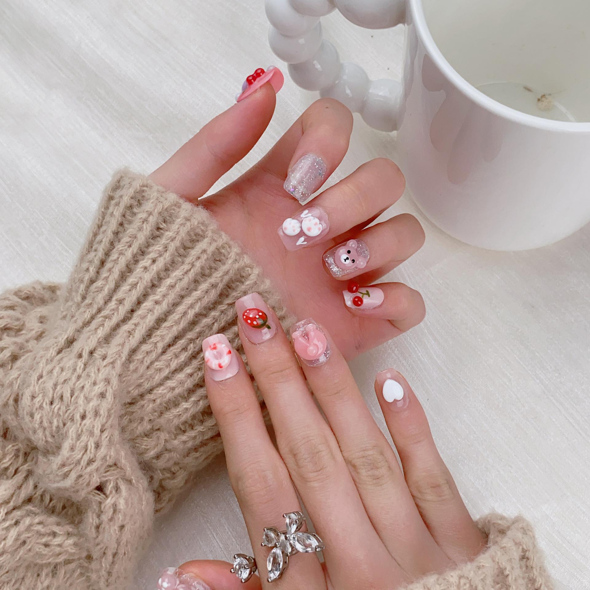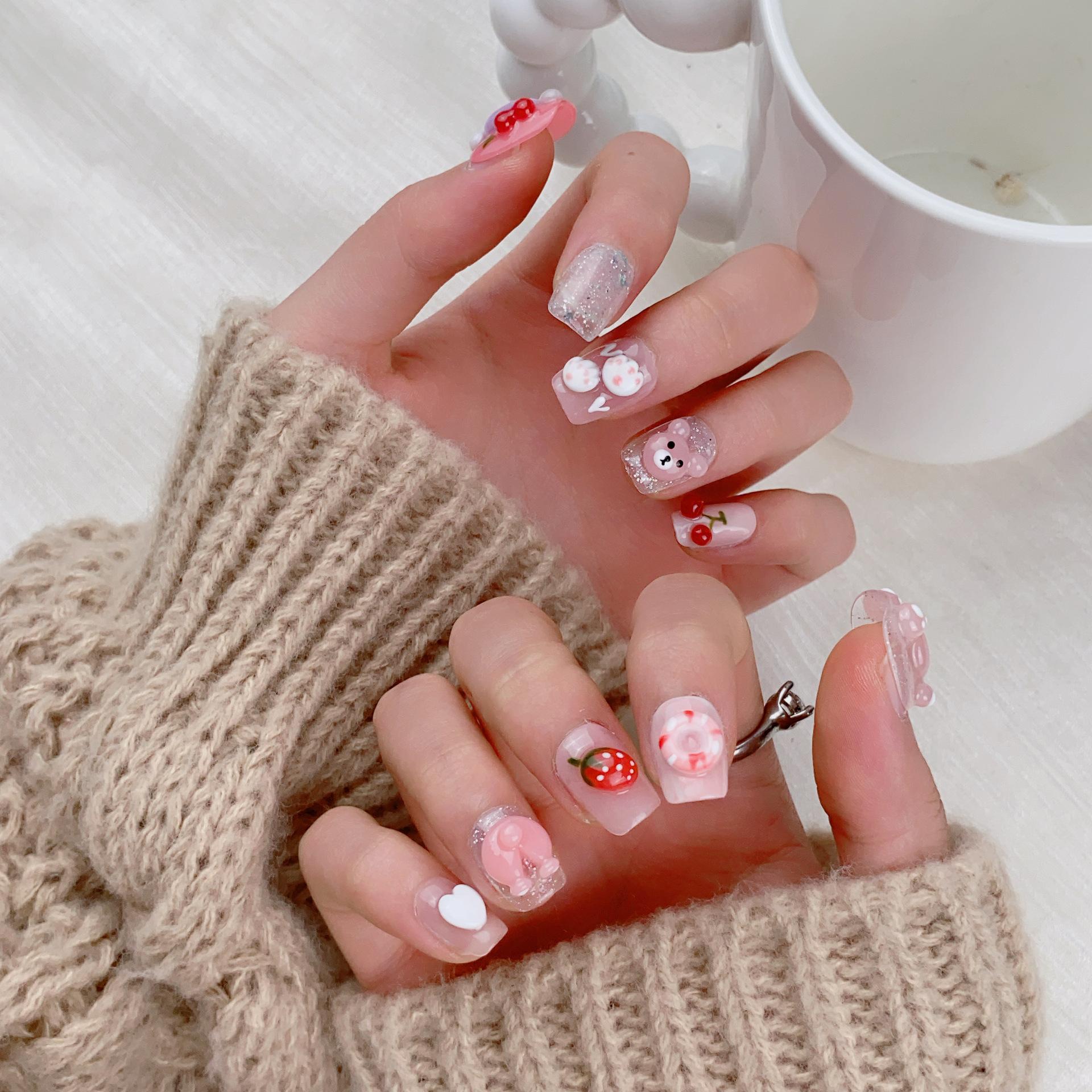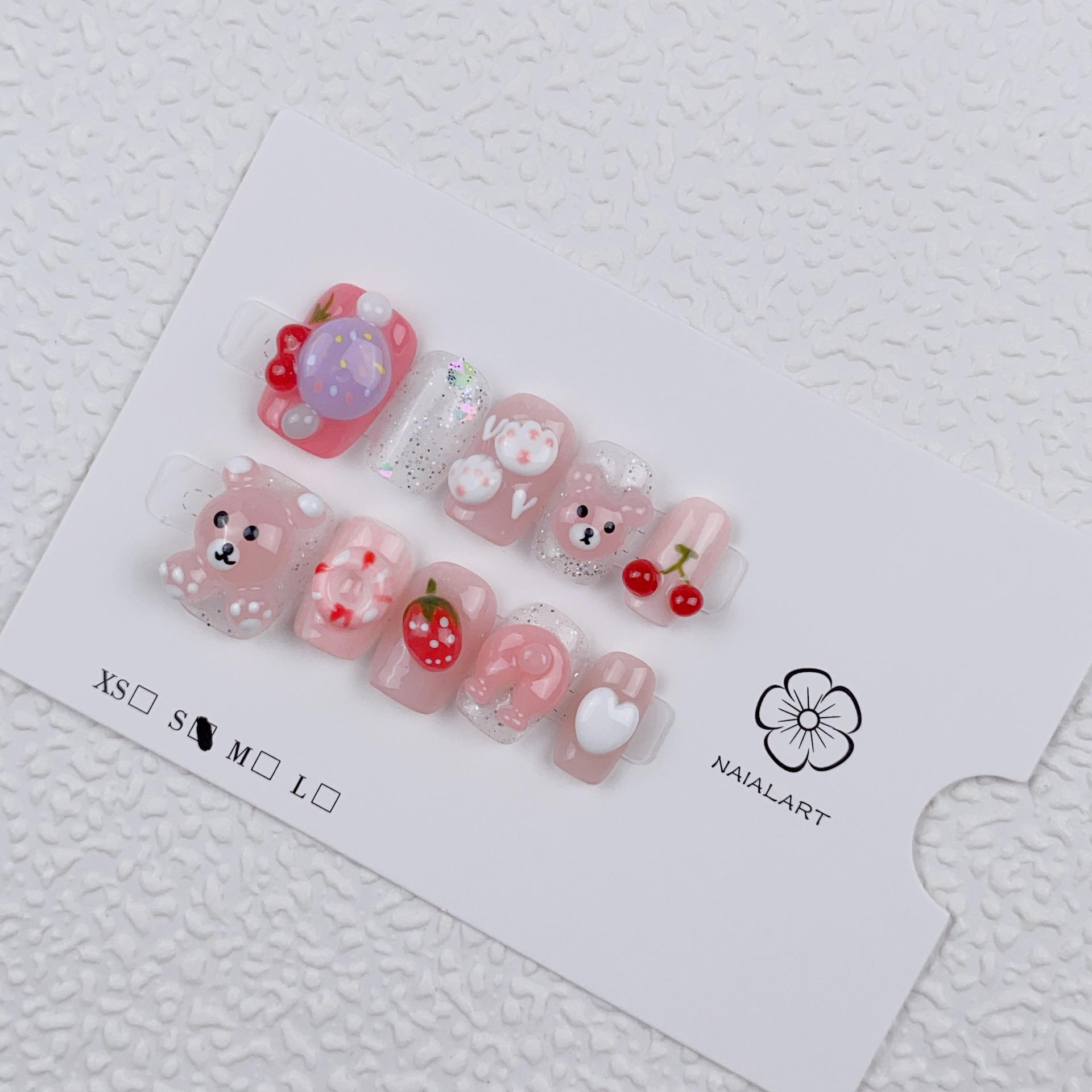 Compra [Arte de uñas con flores grandes] Armadura desgastada a mano, oso pintado a mano, lindo pellizco infantil, pieza de uña corta extraíble al por mayor en Joom.pro