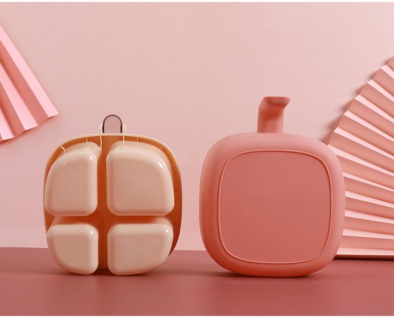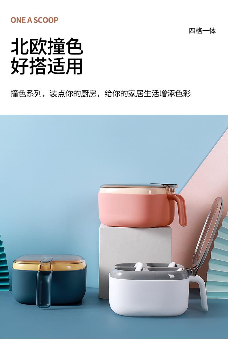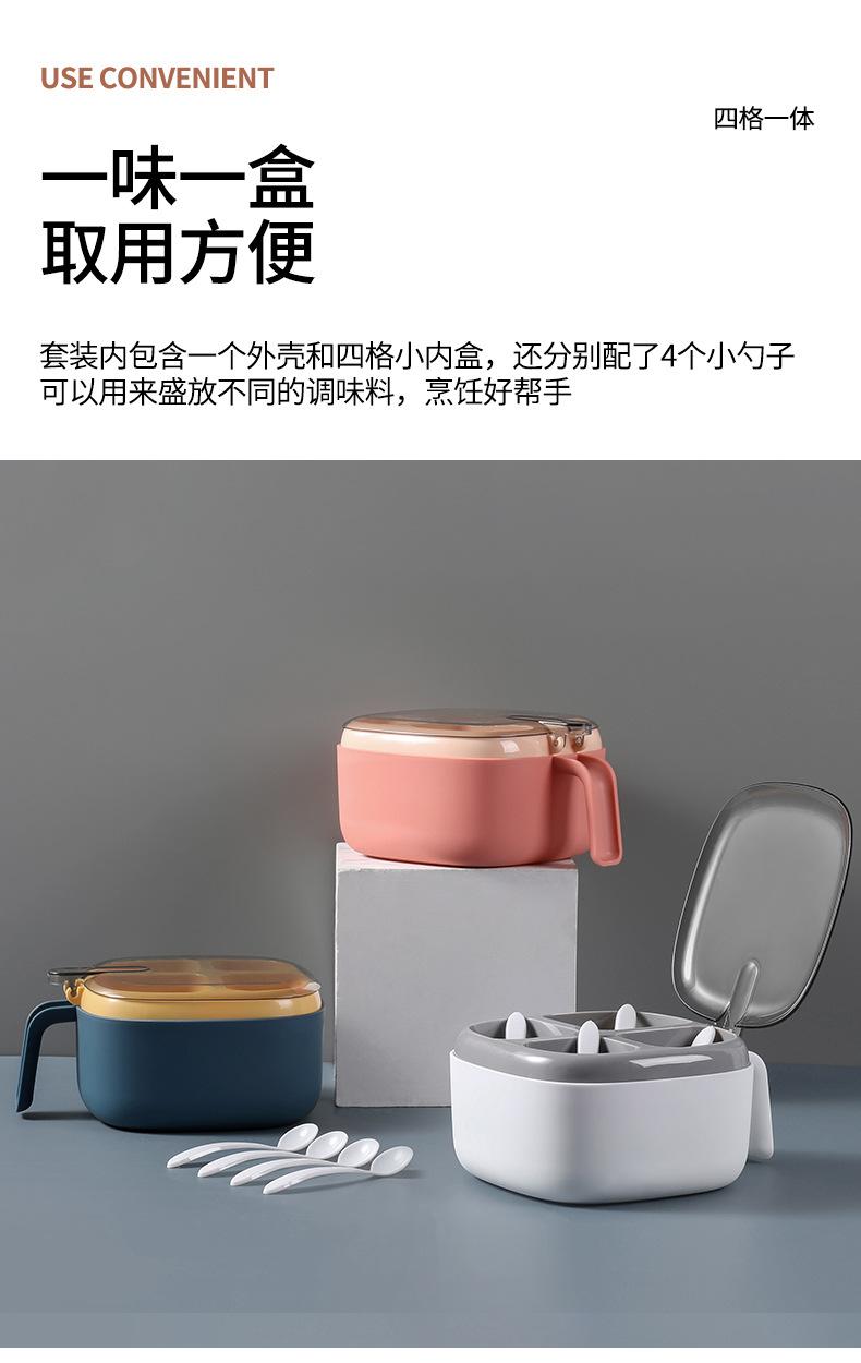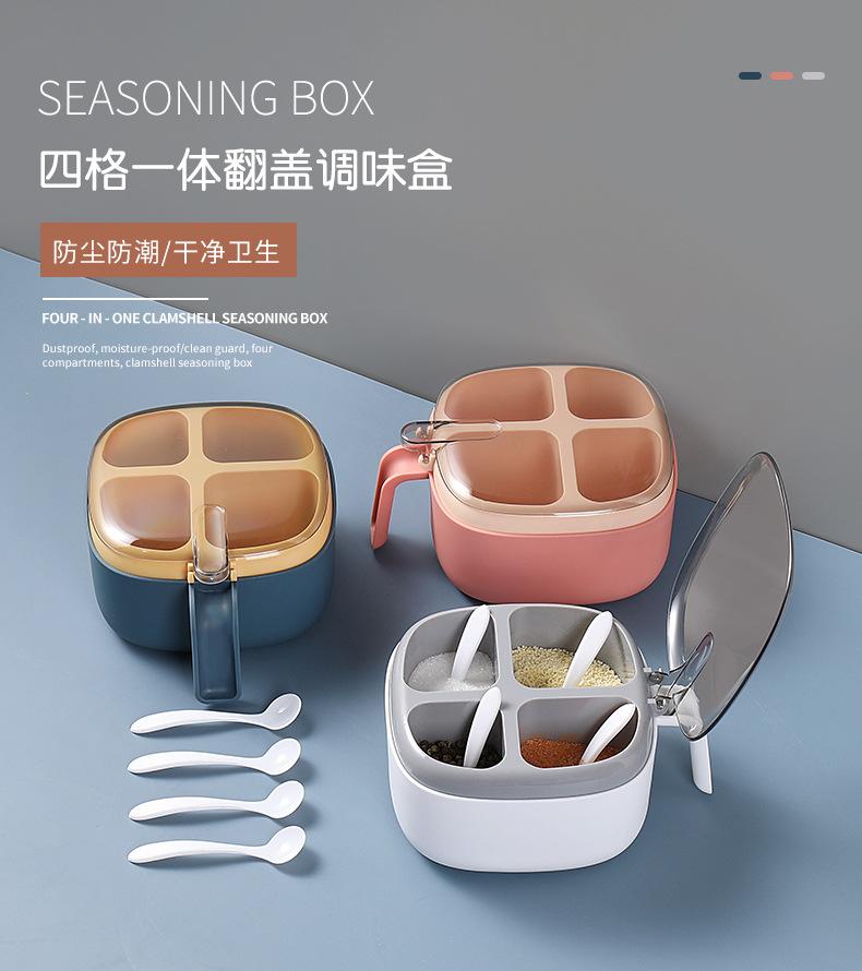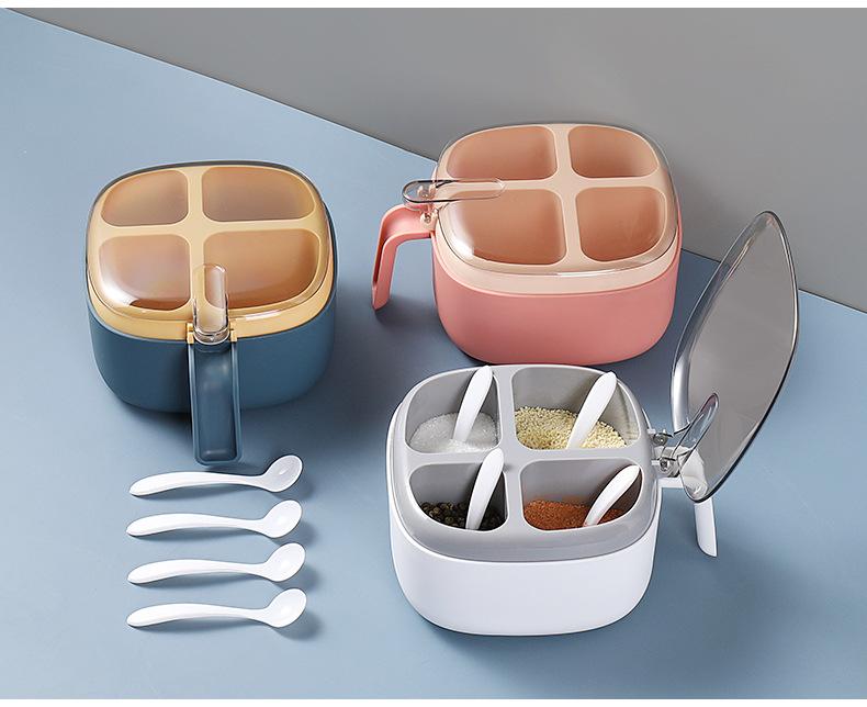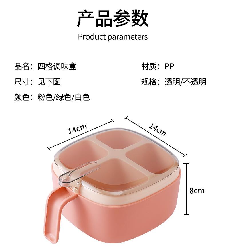 Caja de condimentos de cuatro compartimentos, suministros de cocina, tapa transparente de color contrastante con prensa de cuchara, caja de condimentos, sal, condimento MSG