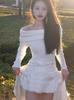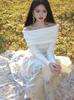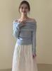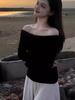 Suéter de punto para mujer estilo francés con hombros descubiertos en azul fresco, primavera 2024, nueva moda informal para mujer.