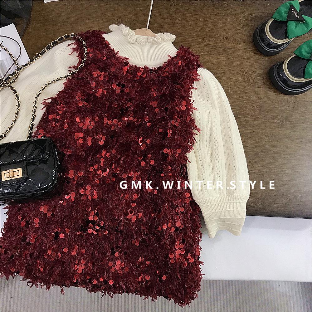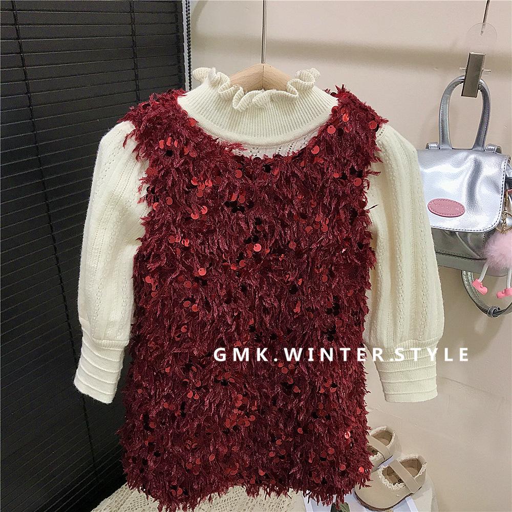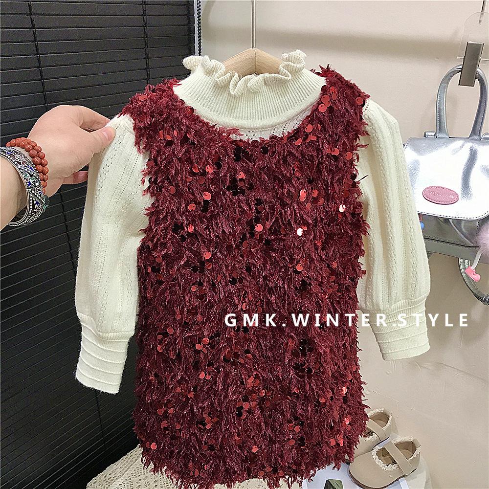 Vestido rojo de niña, vestido de Navidad, vestido de Año Nuevo, vestido de princesa infantil, suéter, vestido de plumas.