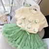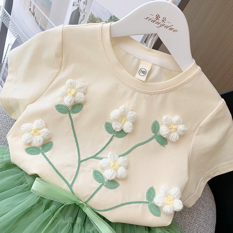 Traje para niña Ropa de verano 2025 Nuevo estilo Celebridad de internet para niños Top de flores tridimensionales Camiseta básica de estilo coreano para niña pequeña