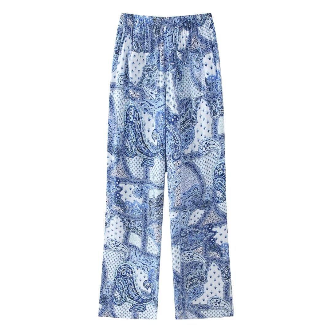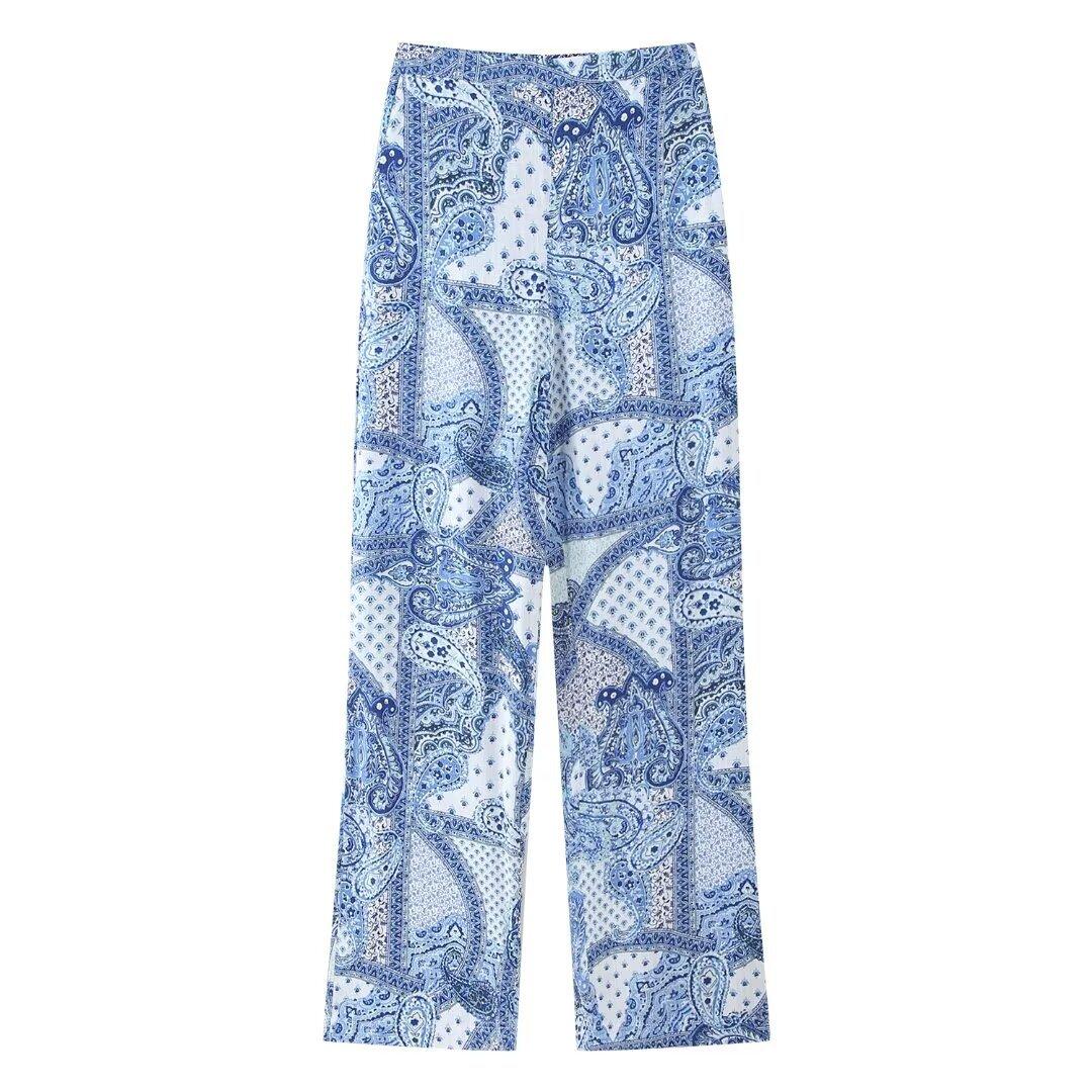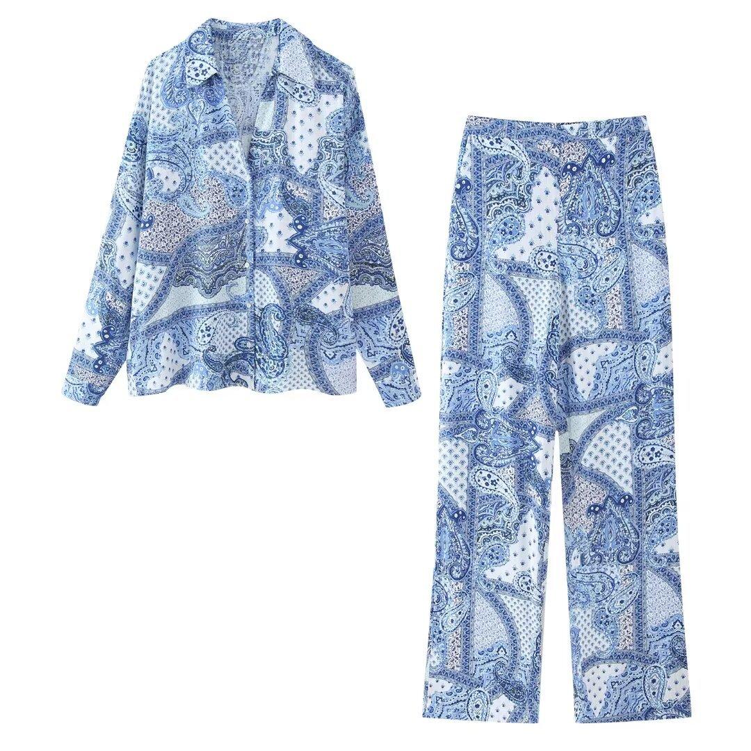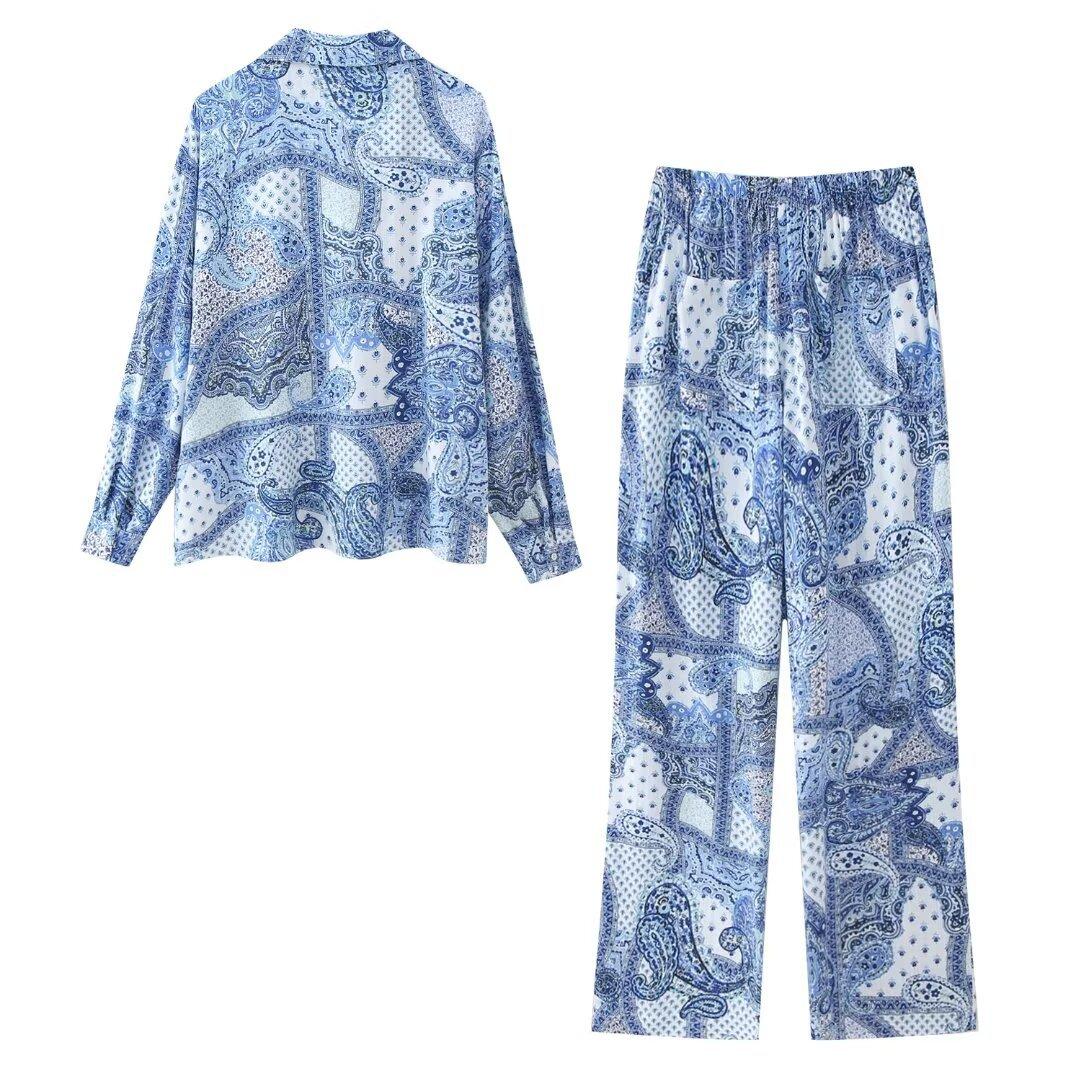 Compra Verano 2024 Nuevo Moda Europea y Americana Transfronteriza para Mujer Camisa Azul de Manga Larga + Pantalón Recto Estampado al por mayor en Joom.pro