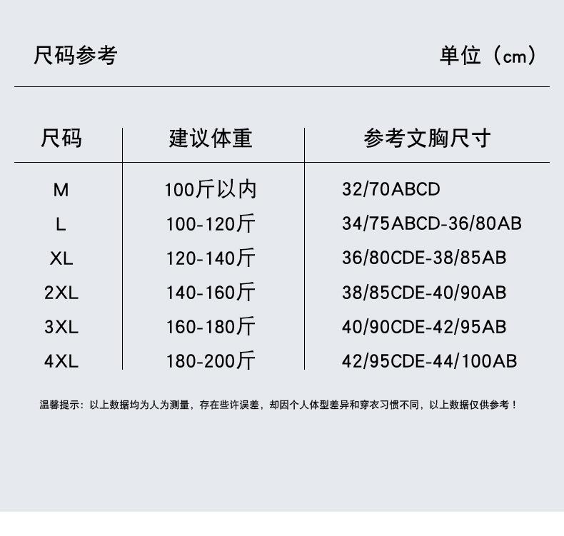 M【34/75ABC】, L【36/80ABC】, XL【38/85ABC】, 2XL【40/90ABC】, 3XL【42/95ABC】, 4XL【44/100ABC】