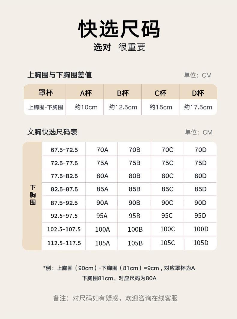 36/80 (c cup), 38/85 (c cup), 40/90 (c cup), 42/95 (c cup), 44/100 (c cup)