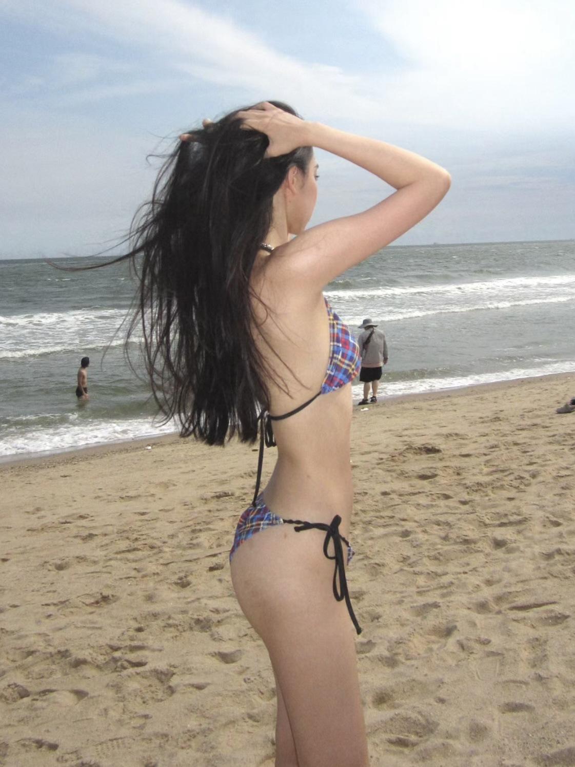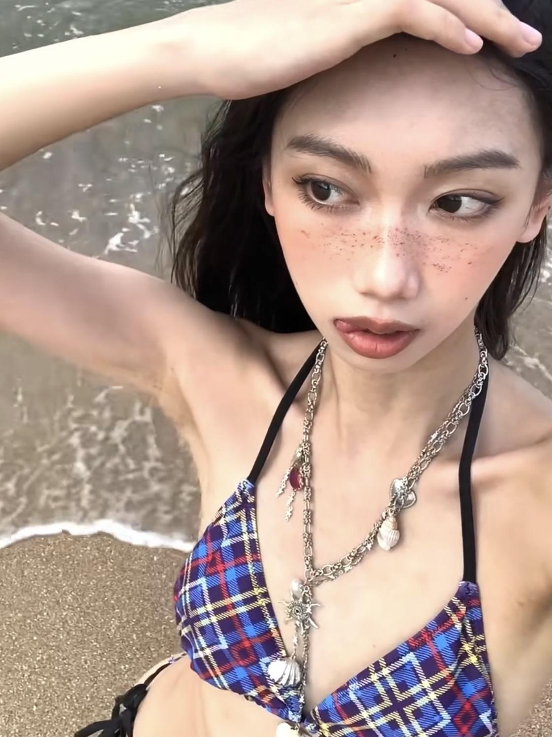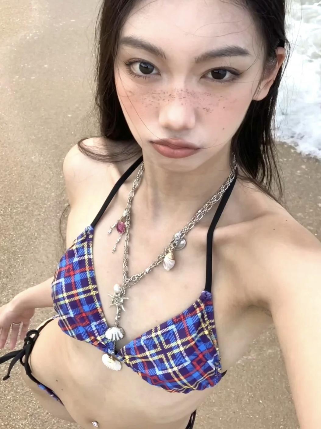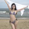 Traje de baño de verano retro a cuadros morados para vacaciones en la playa, bikini con tirantes triangulares y pecho pequeño, traje de baño sexy de aguas termales para mujer