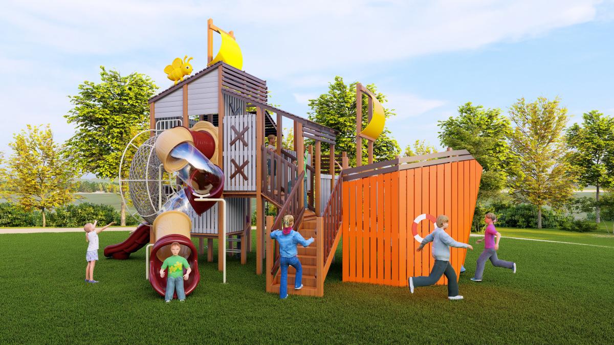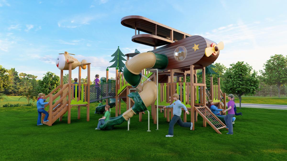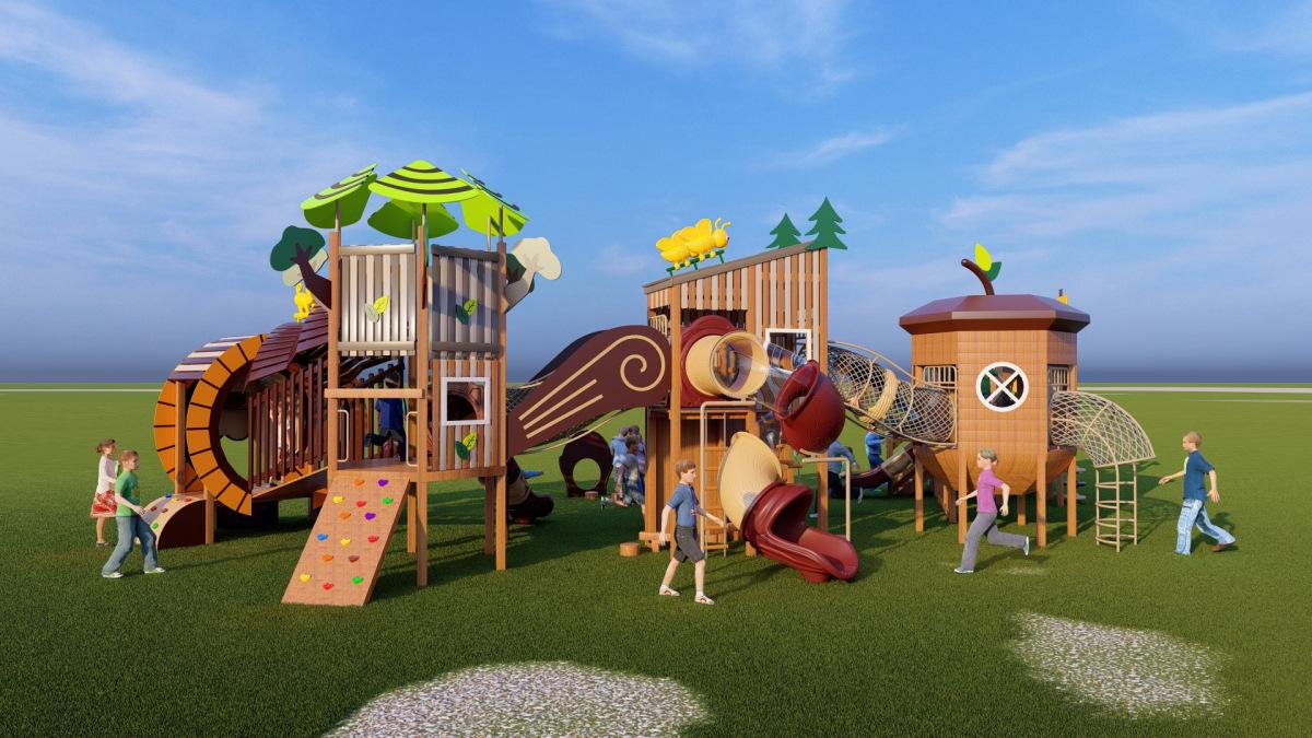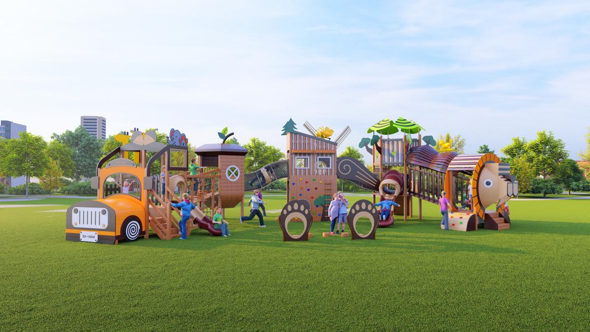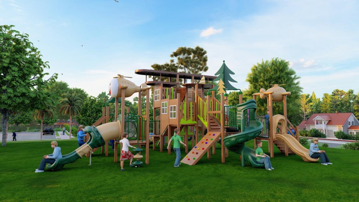 Tobogán de madera de combinación de pelo liso de fábrica para exteriores, gran parque de juguetes para niños, instalaciones comunitarias al aire libre, equipo de entretenimiento