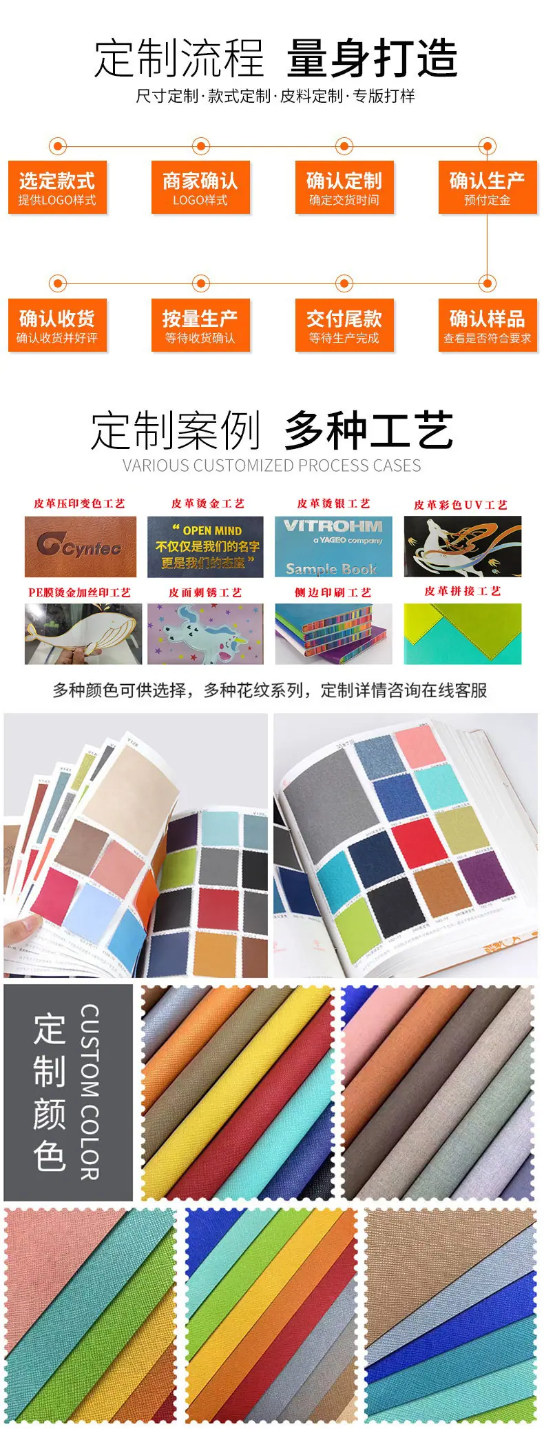 Los productos pueden mostrar el LOGOTIPO de su empresa o información de texto relacionada en los productos mediante estampado en caliente/plata, marca, impresión, bordado, grabado láser, etc., y también se pueden personalizar para abrir moldes de placas de metal, insertar páginas de color en las páginas internas, impresión de placa abierta, impresión de página interna especial, etc.