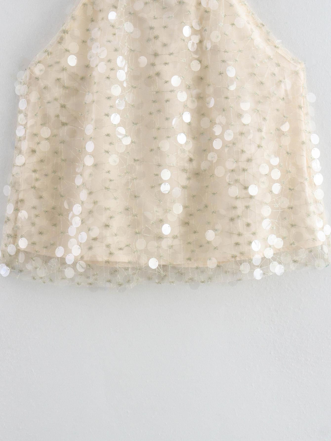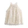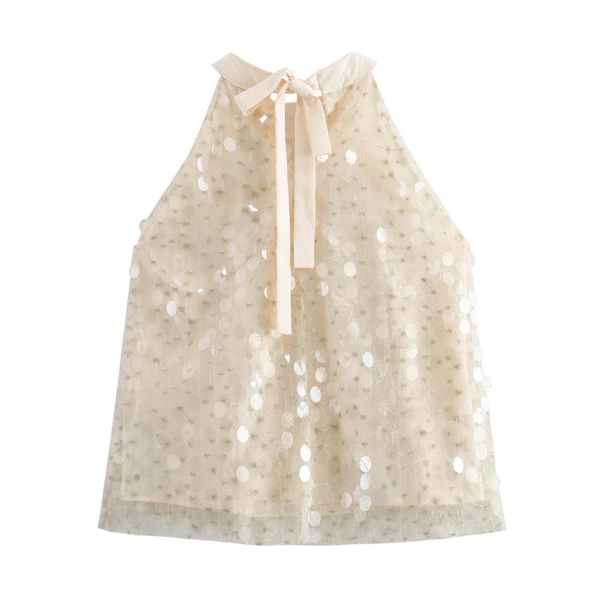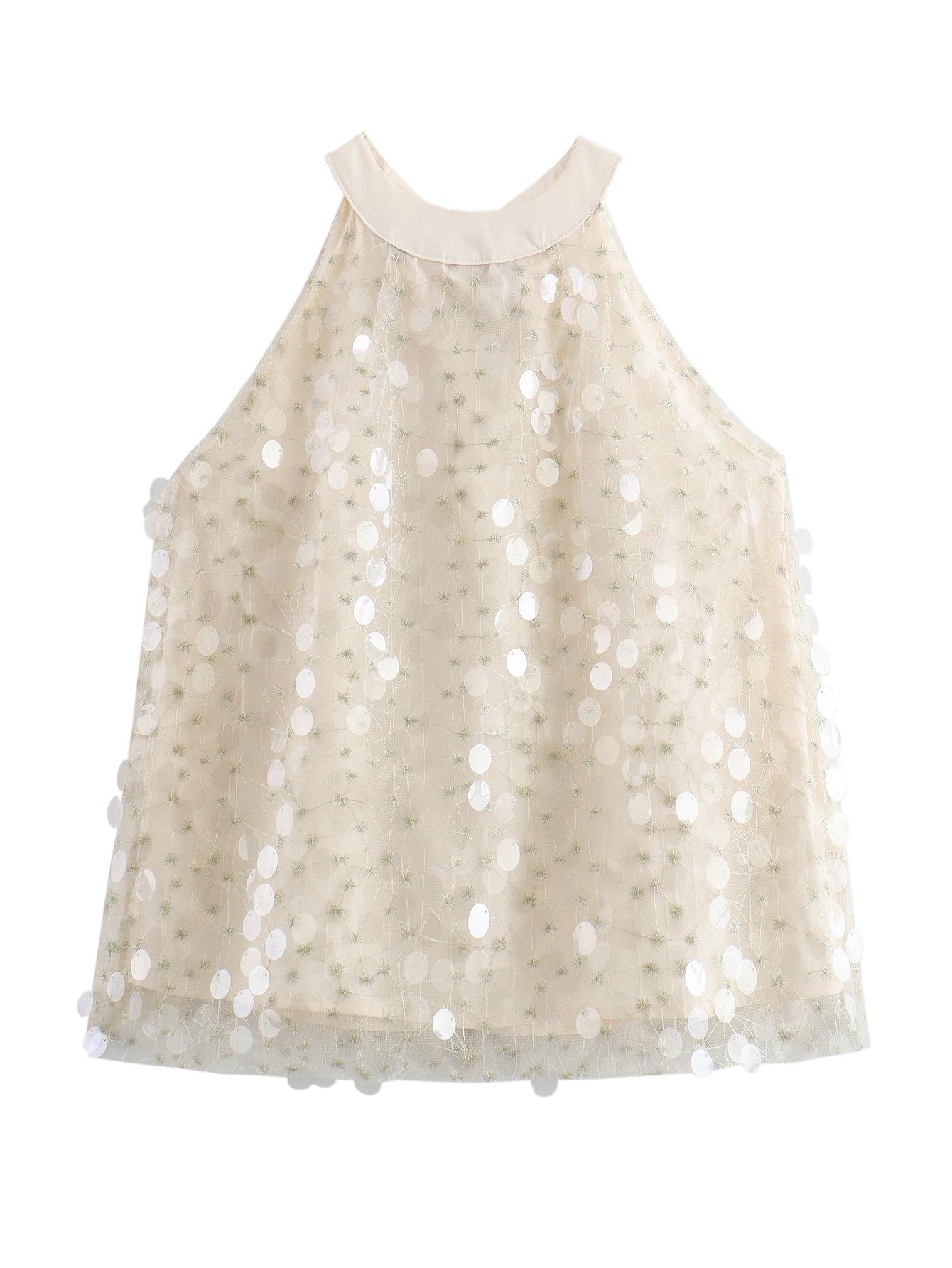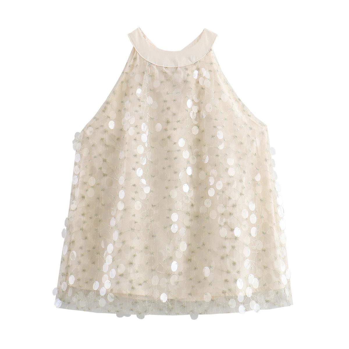 Camiseta sin mangas de cuello redondo con lentejuelas estilo europeo y americano, adelgazante, temperamento de socialité, dulce, que rejuvenece, para mujer, verano, cuello, gasa