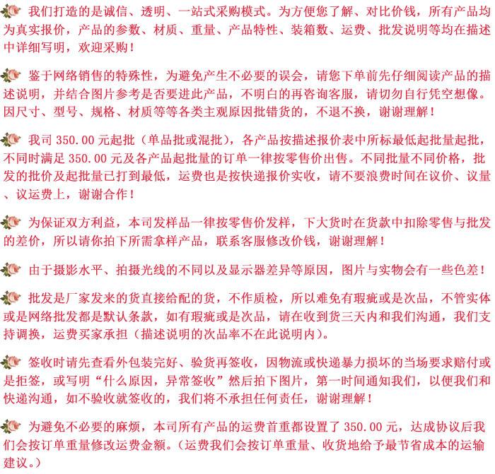 【Consejos cálidos】 Considerando varios factores de nuestra empresa, el lote mixto o el lote único comienza en 350.00 yuanes. Los pedidos que no superen los 350.00 yuanes y el pedido mínimo de cada producto se venden al precio minorista. Para evitar problemas innecesarios, el peso de envío inicial de todos nuestros productos se establece en 350.00 yuanes. Para los pedidos que cumplan las condiciones, por favor, póngase en contacto con el servicio de atención al cliente para hacer una nota de entrega y modificar el importe del envío. Gracias por su cooperación. |