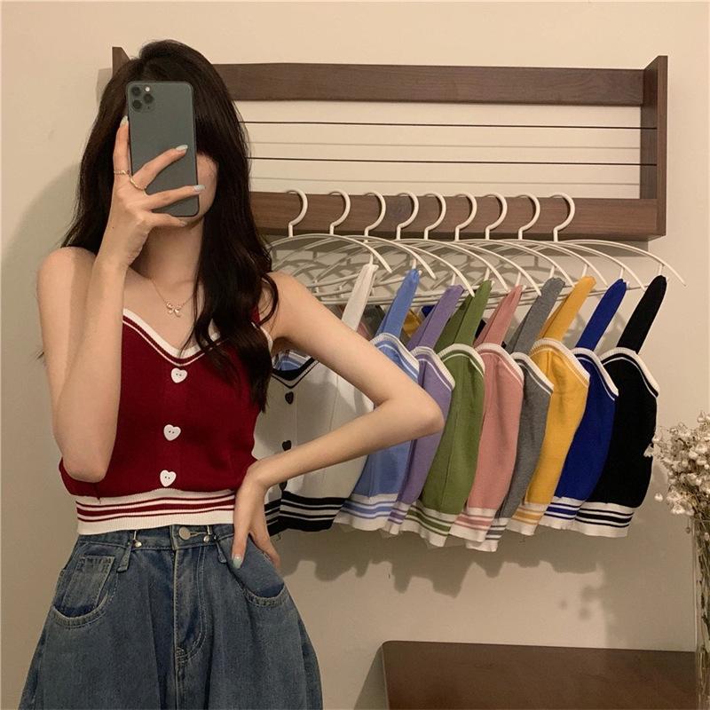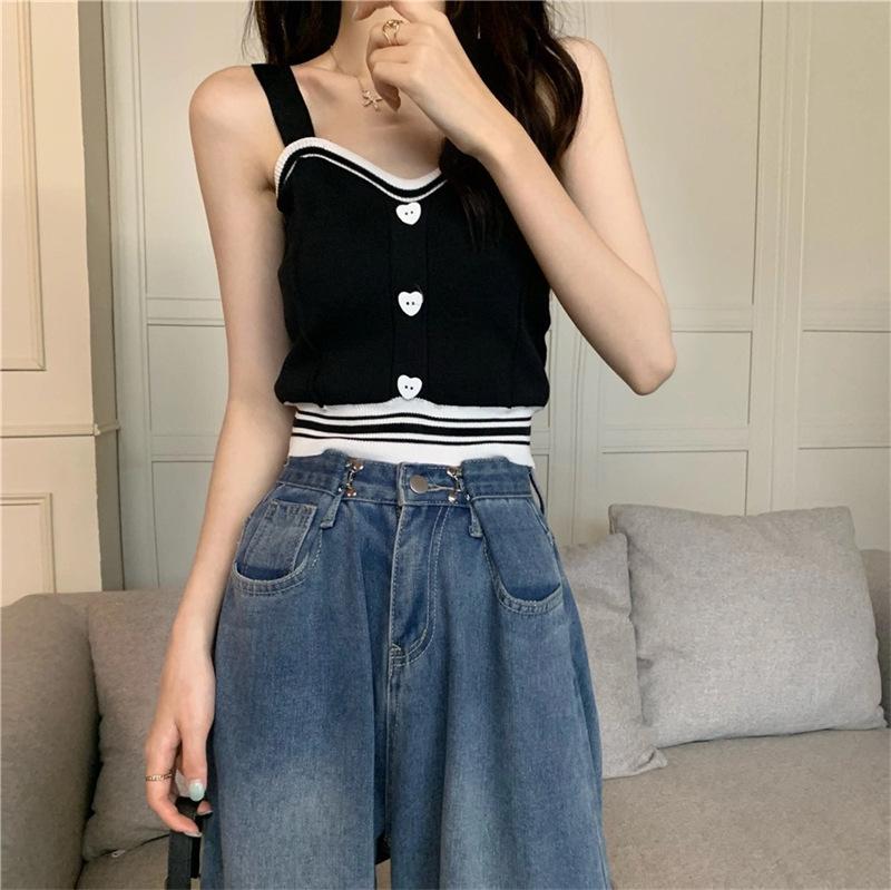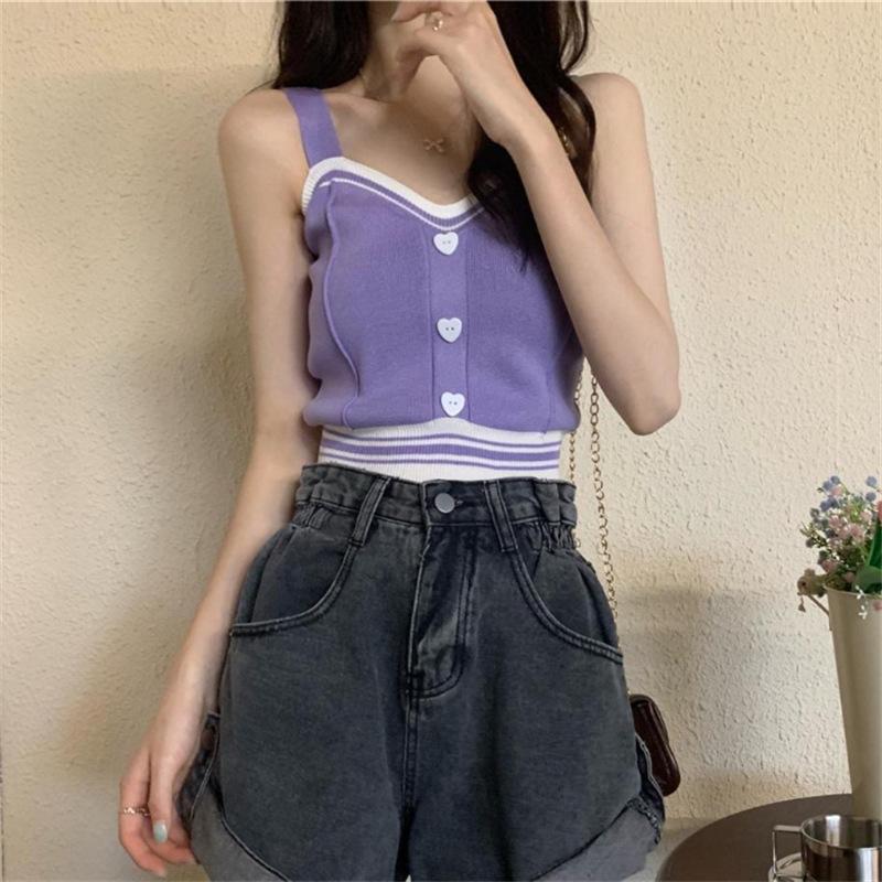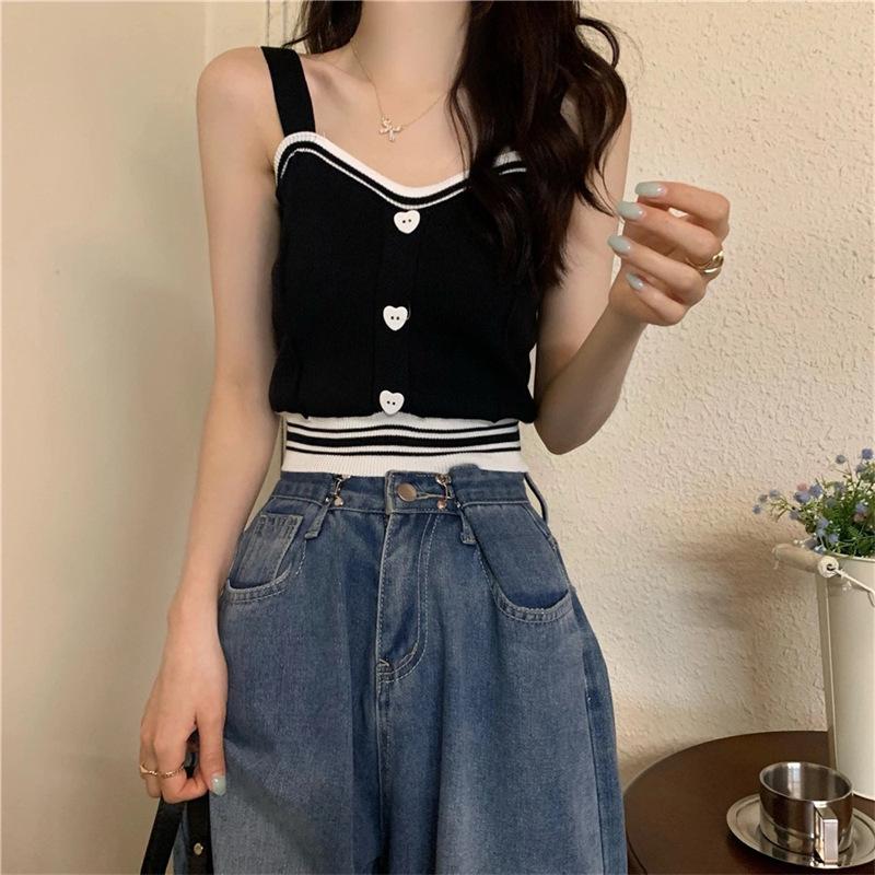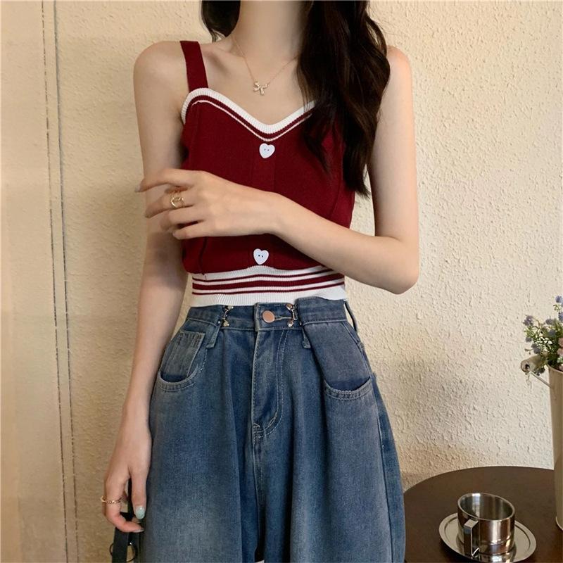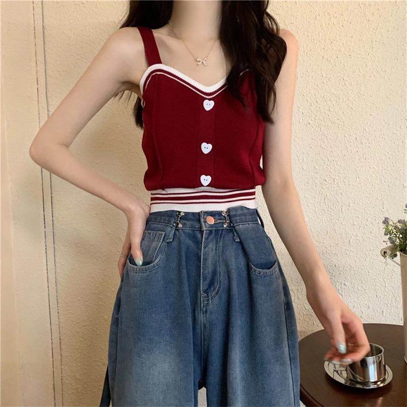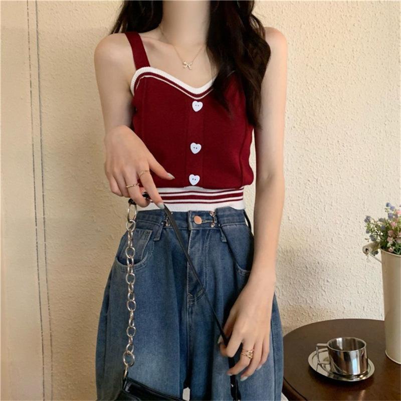 Camisola pequeña con botón de amor de color contrastante para mujer, chaleco interior de verano 2024, nuevo top de punto de moda para chica, ropa exterior corta