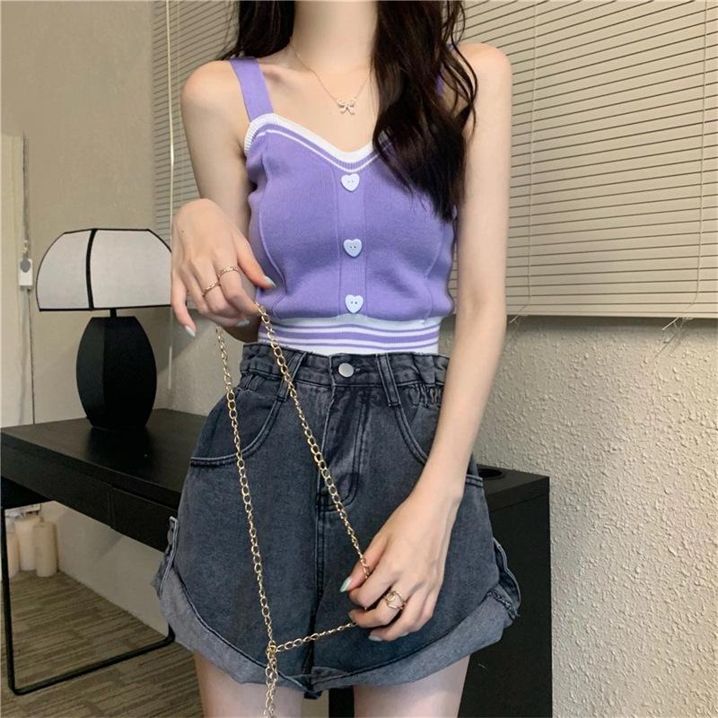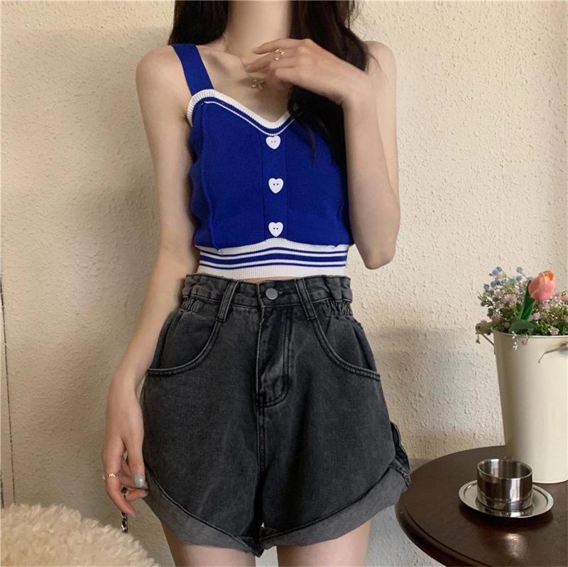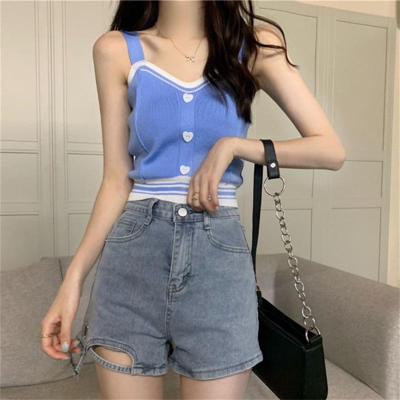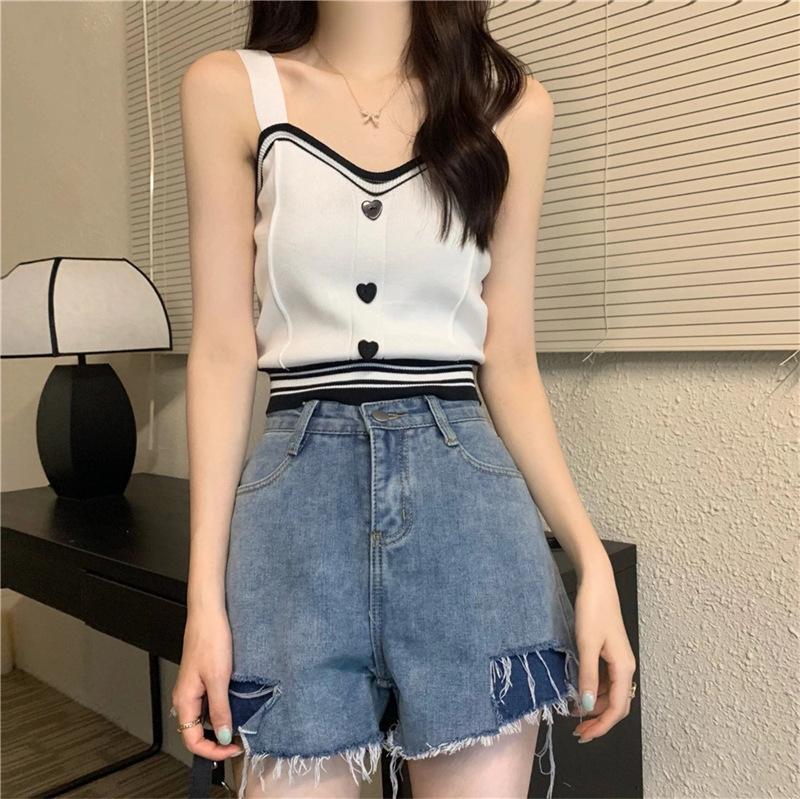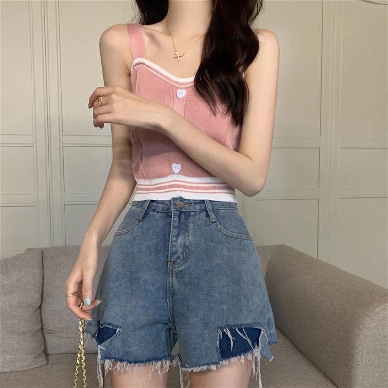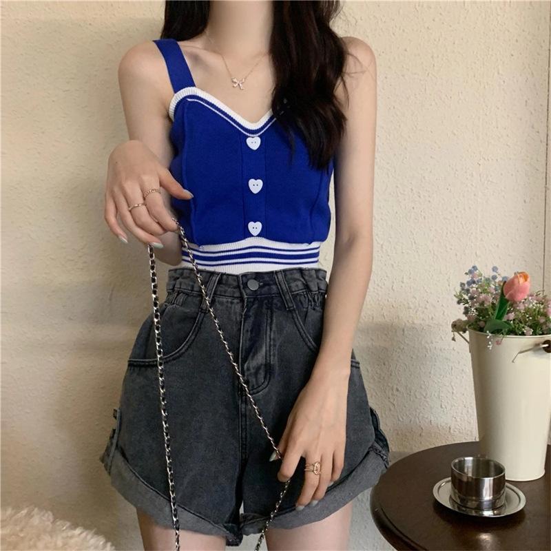 Camisola pequeña con botón de amor de color contrastante para mujer, chaleco interior de verano 2024, nuevo top de punto de moda para chica, ropa exterior corta