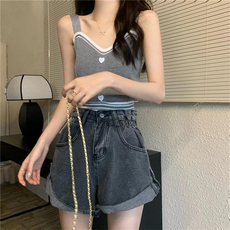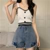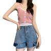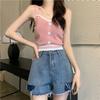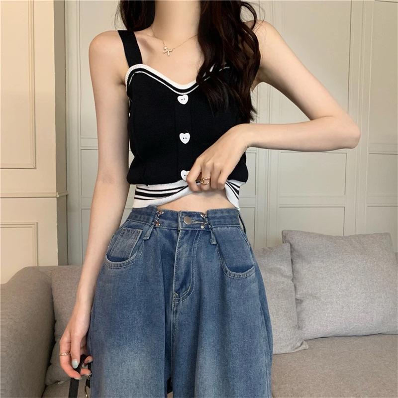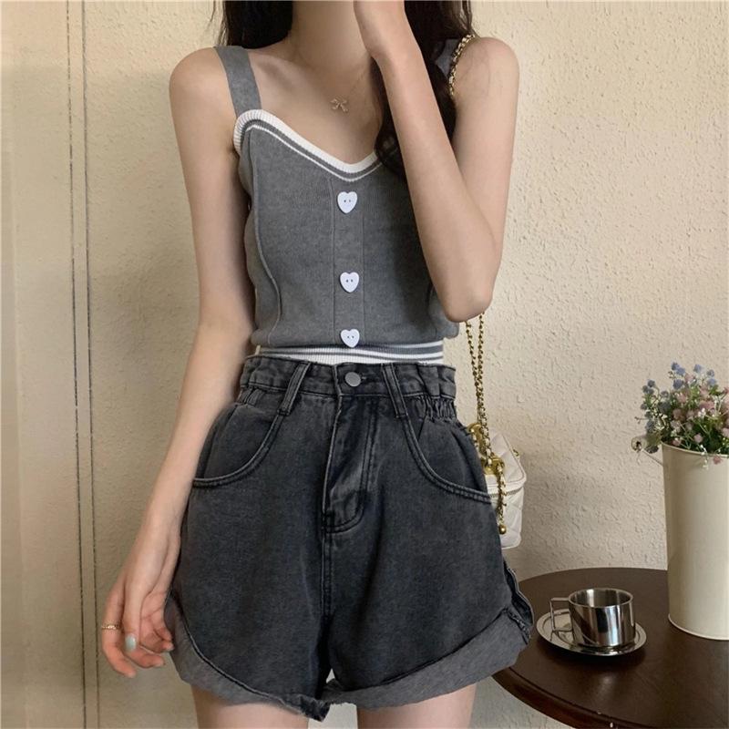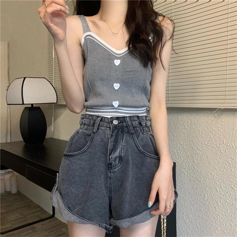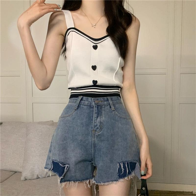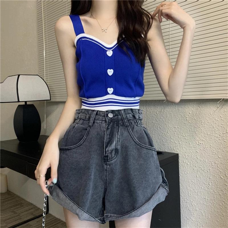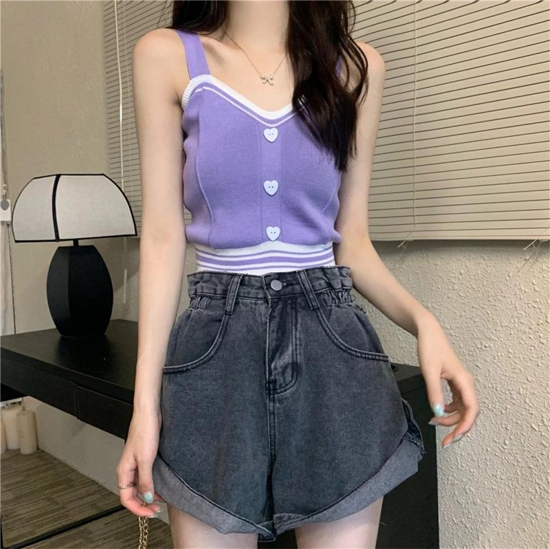 Camisola pequeña con botón de amor de color contrastante para mujer, chaleco interior de verano 2024, nuevo top de punto de moda para chica, ropa exterior corta