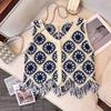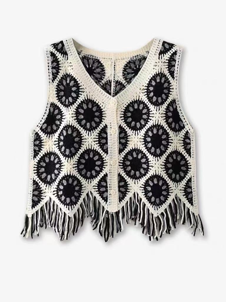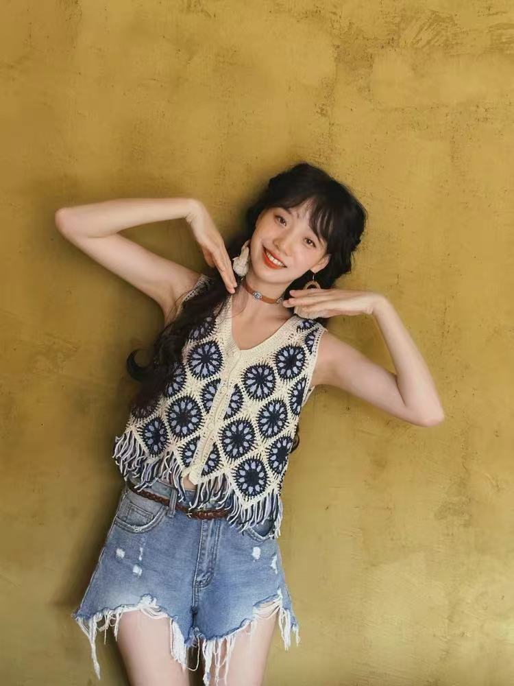 Foto Real de Chaleco Nuevo de Verano 2025 Bohemio con Flecos Tejido Calado Bordado Cárdigan Top Corto
