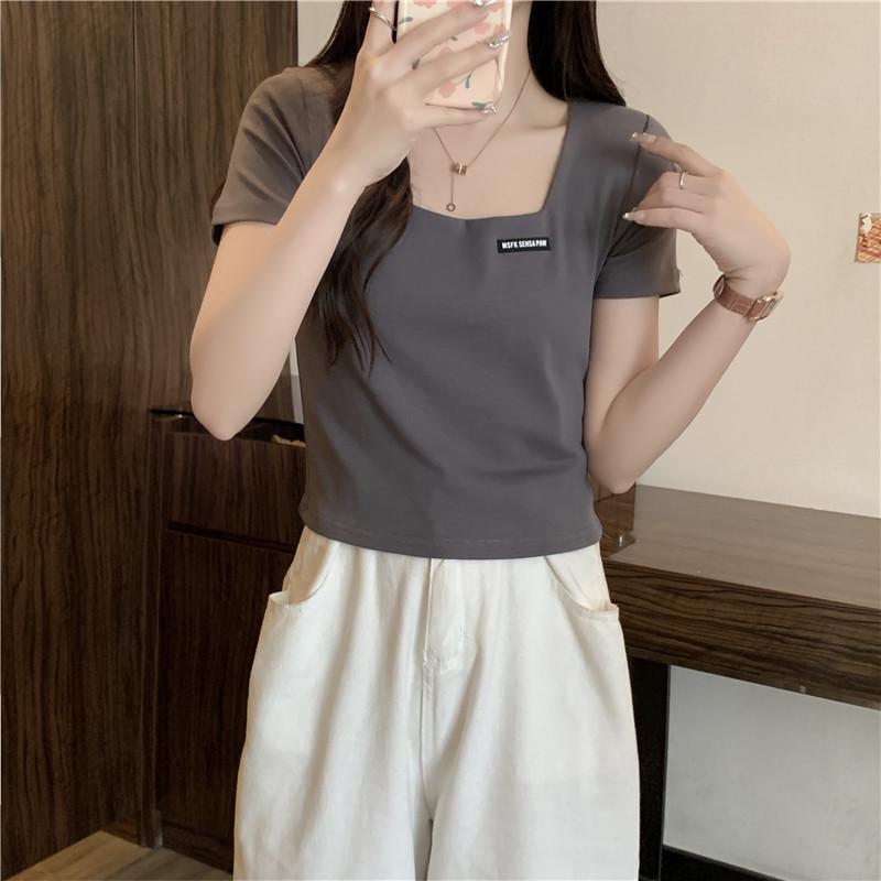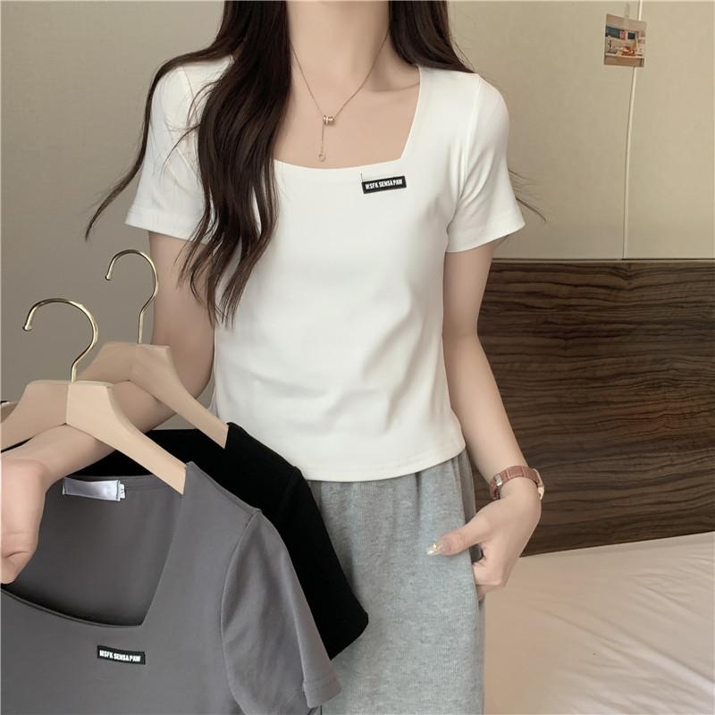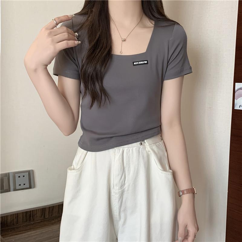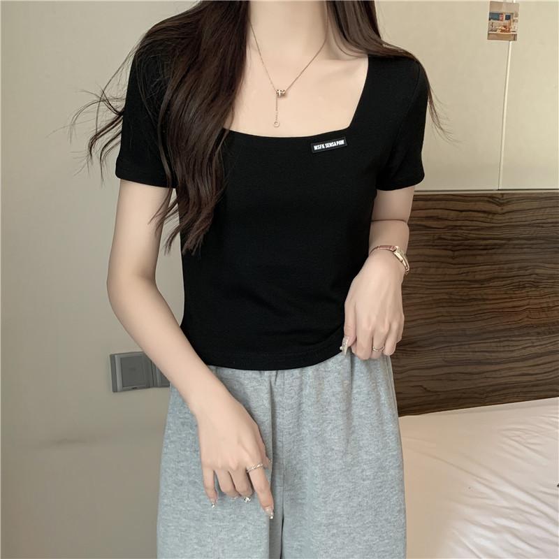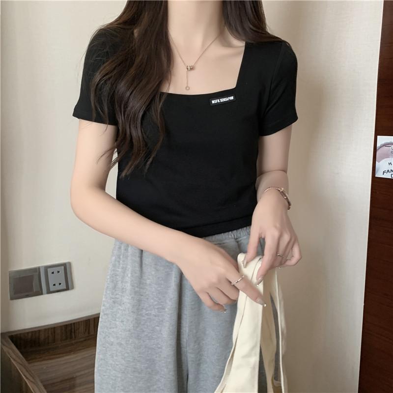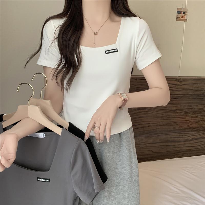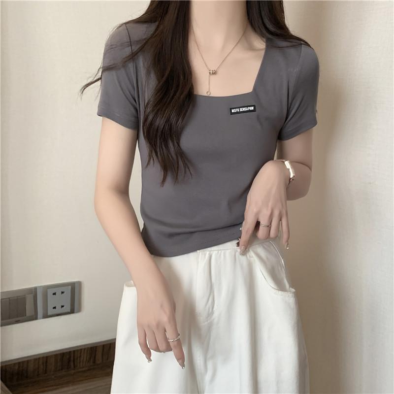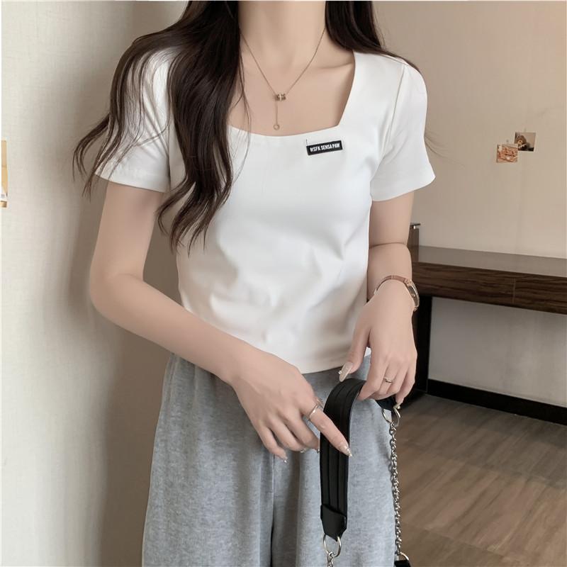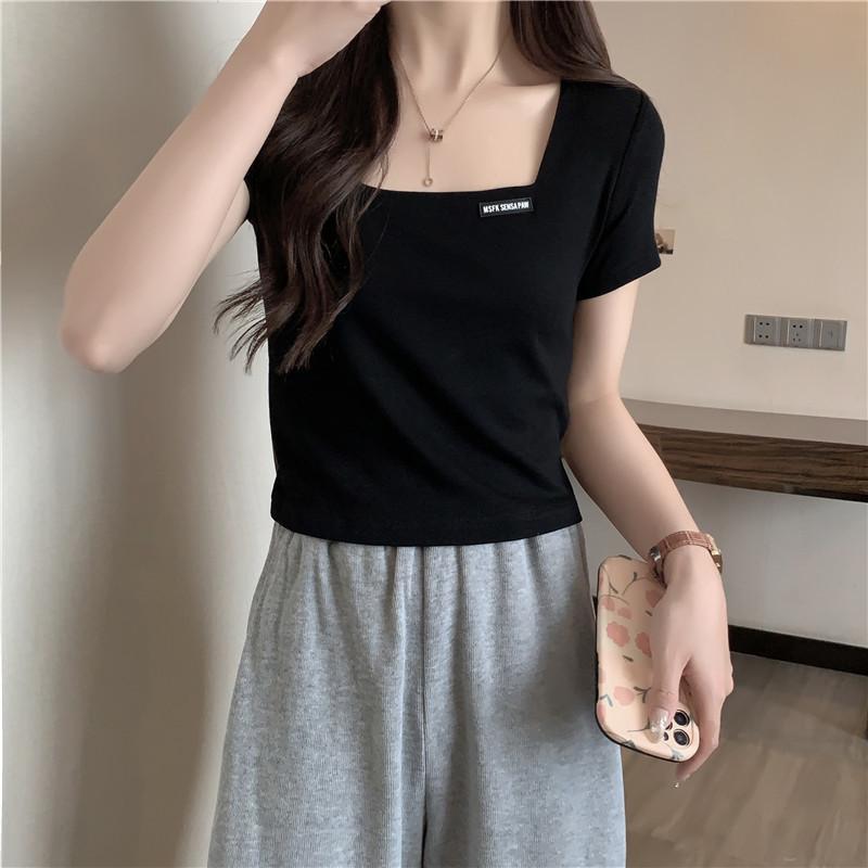 Nueva camiseta de manga corta con cuello cuadrado de estilo europeo y americano de comercio exterior para mujer, top holgado de verano adelgazante de algodón de media manga que combina con todo.