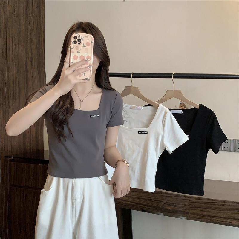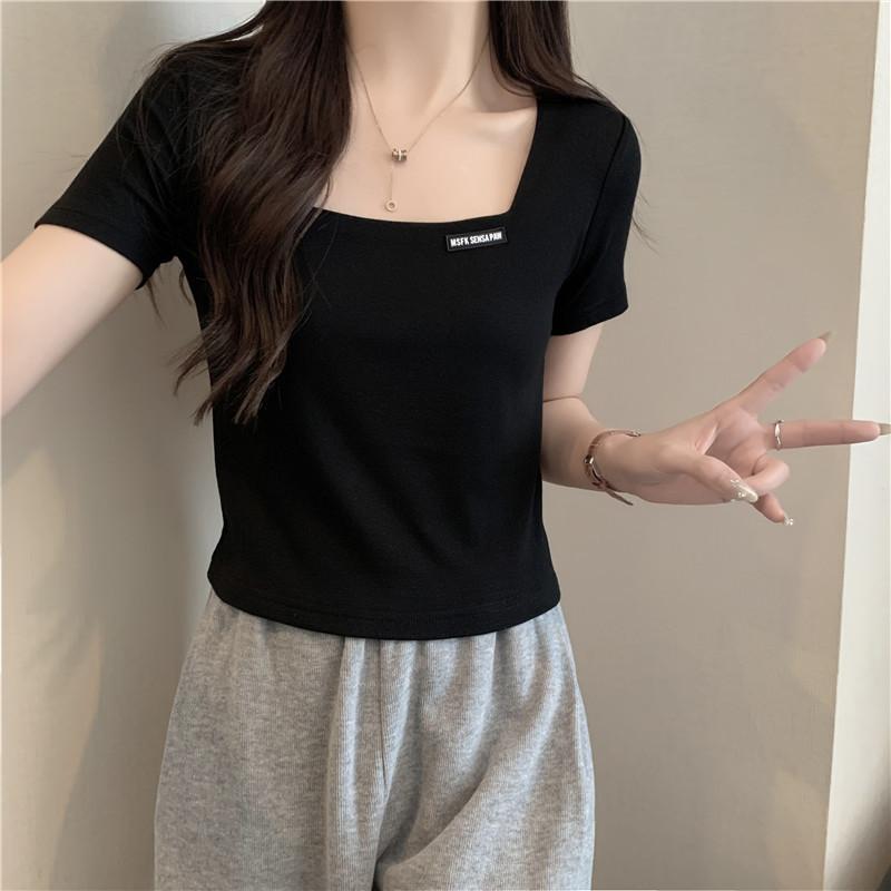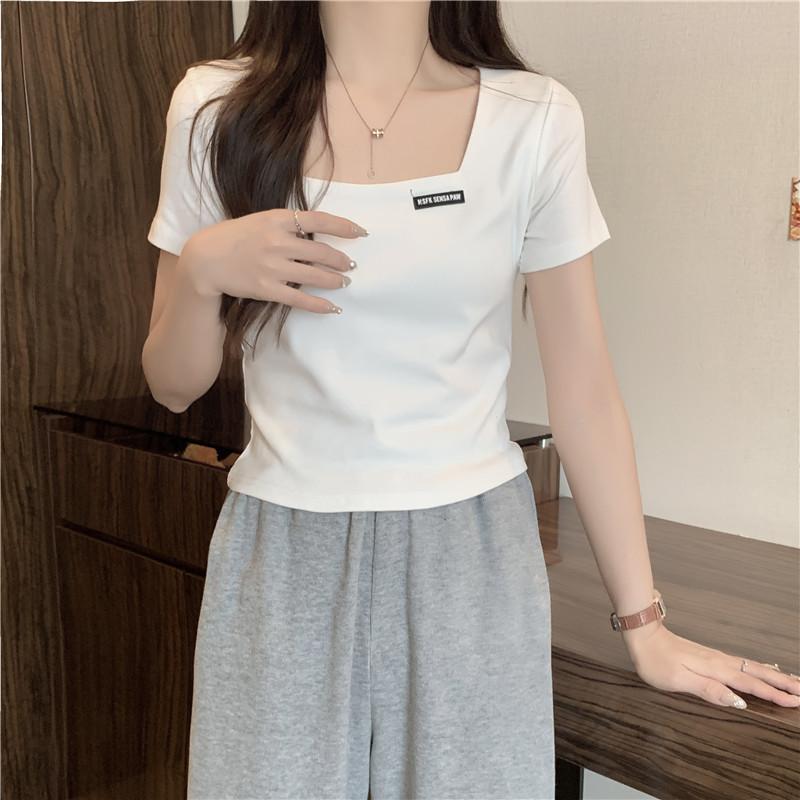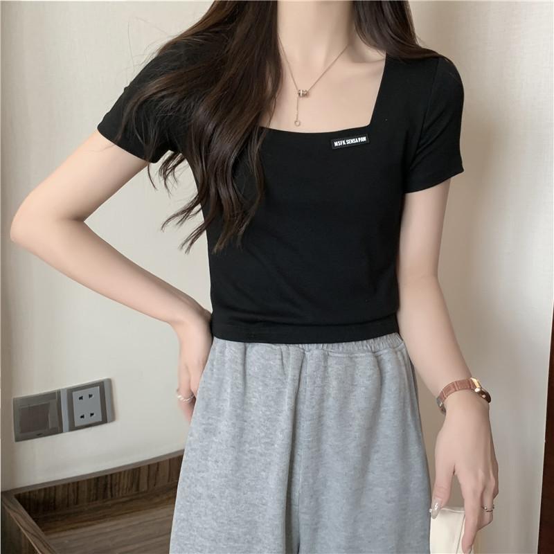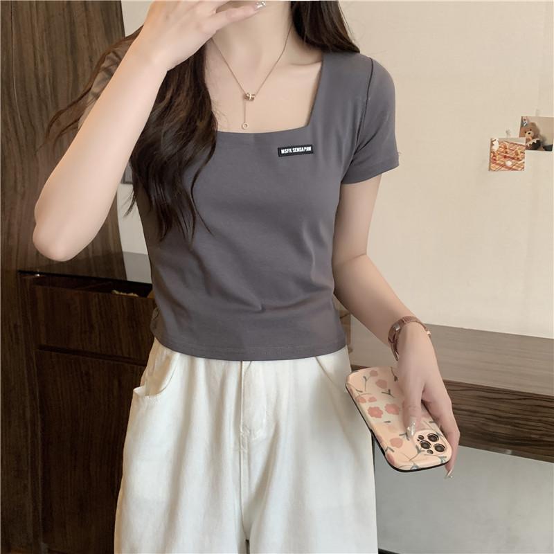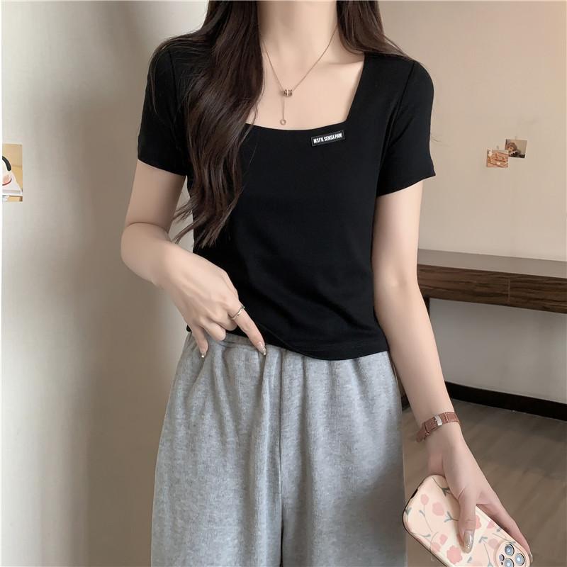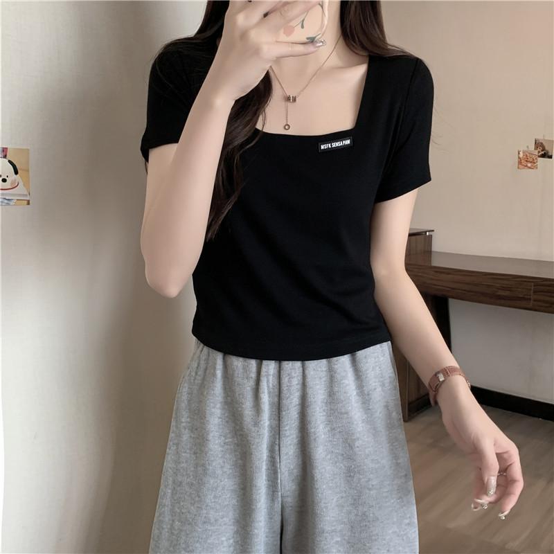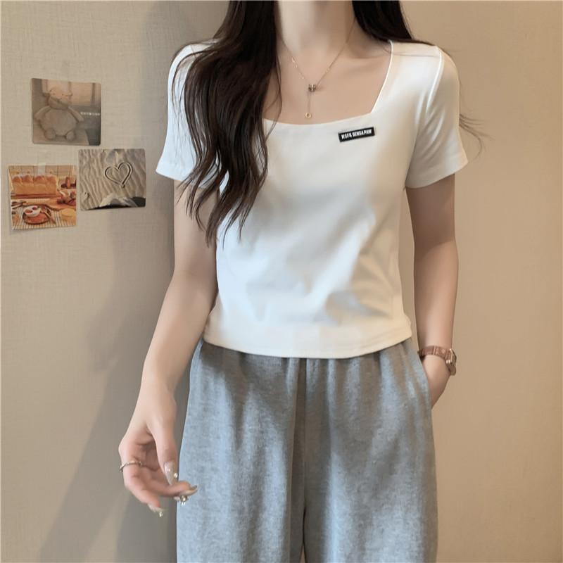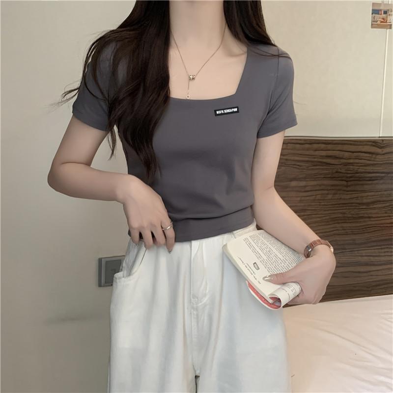 Nueva camiseta de manga corta con cuello cuadrado de estilo europeo y americano de comercio exterior para mujer, top holgado de verano adelgazante de algodón de media manga que combina con todo.