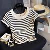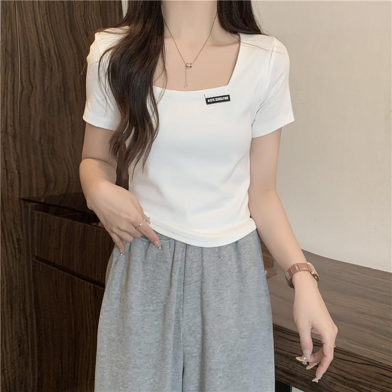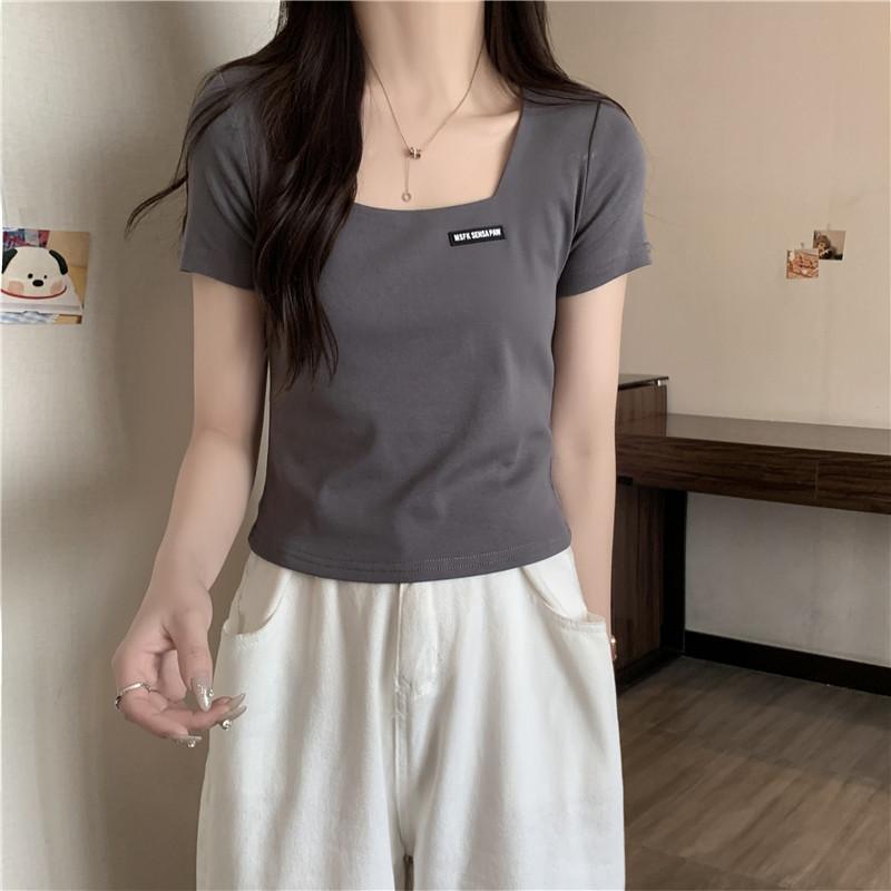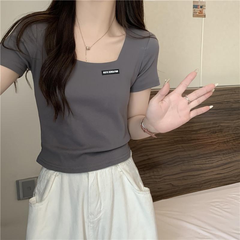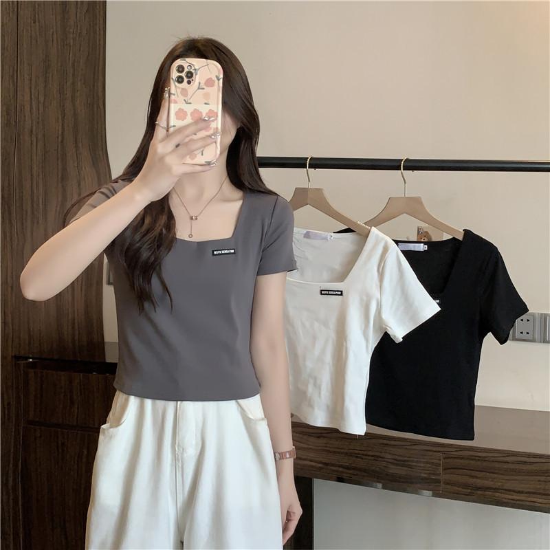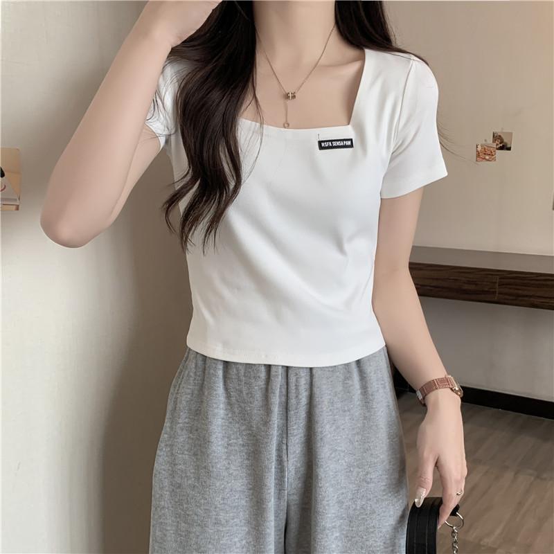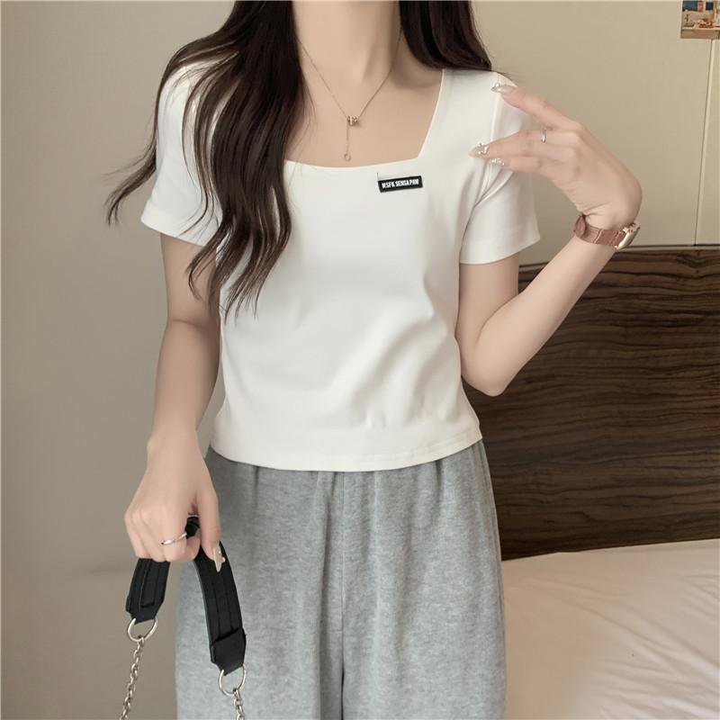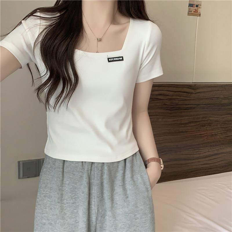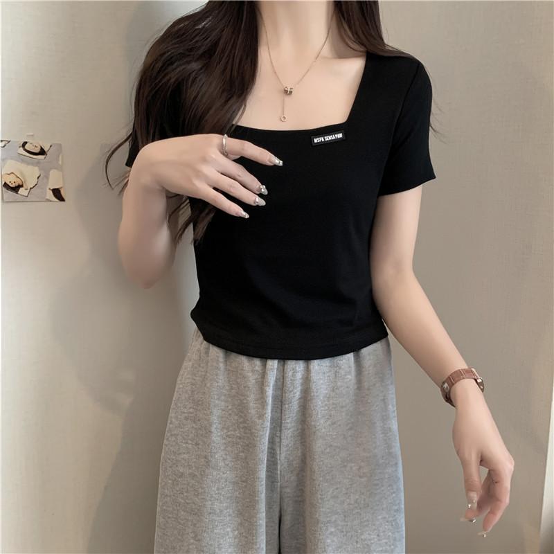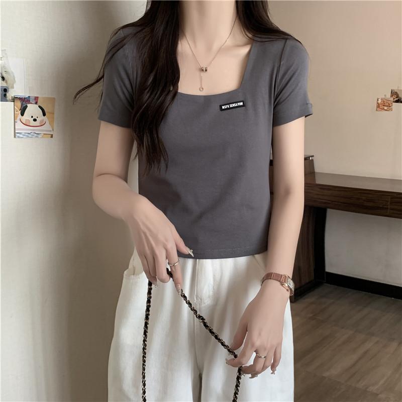 Nueva camiseta de manga corta con cuello cuadrado de estilo europeo y americano de comercio exterior para mujer, top holgado de verano adelgazante de algodón de media manga que combina con todo.