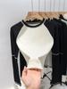 Camiseta de manga larga con diseño de línea abierta de estilo americano para mujer, color contrastante, otoño e invierno 2024, nueva camiseta Spice Girl de corte entallado con cuello redondo.